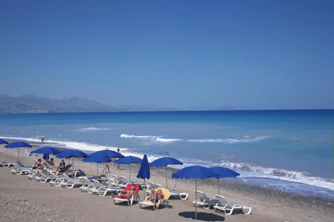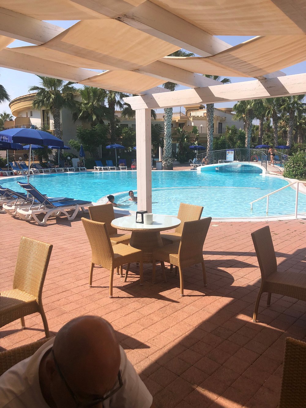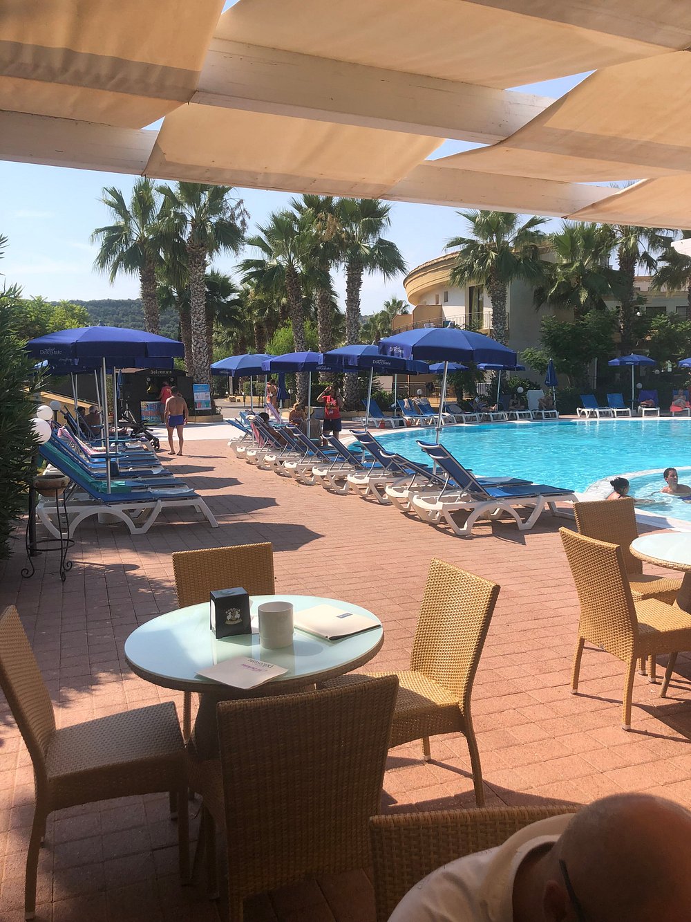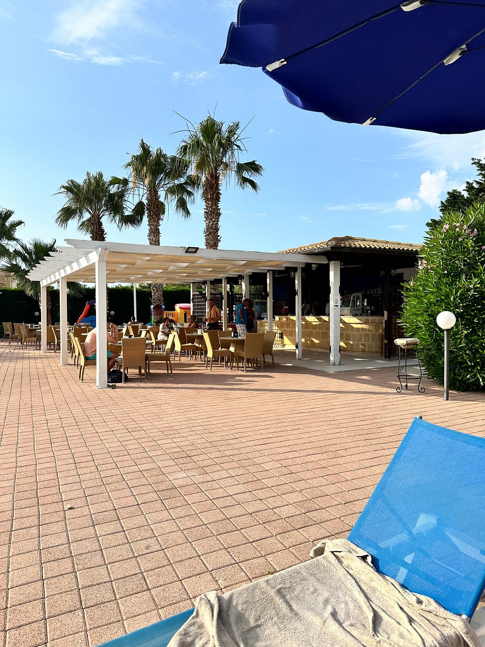 Zdjęcie przedstawia część wypoczynkową z widocznymi leżakami i parasolami, ale obecność osobistych rzeczy turysty dyskwalifikuje je z użycia marketingowego.