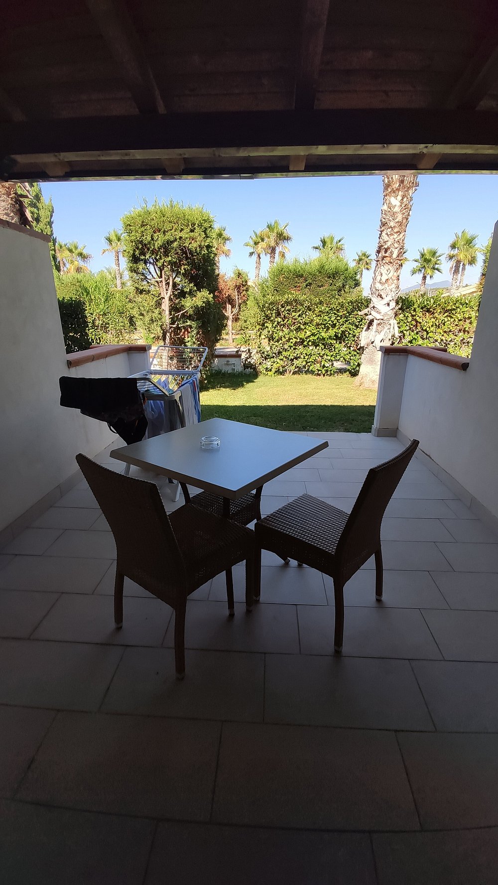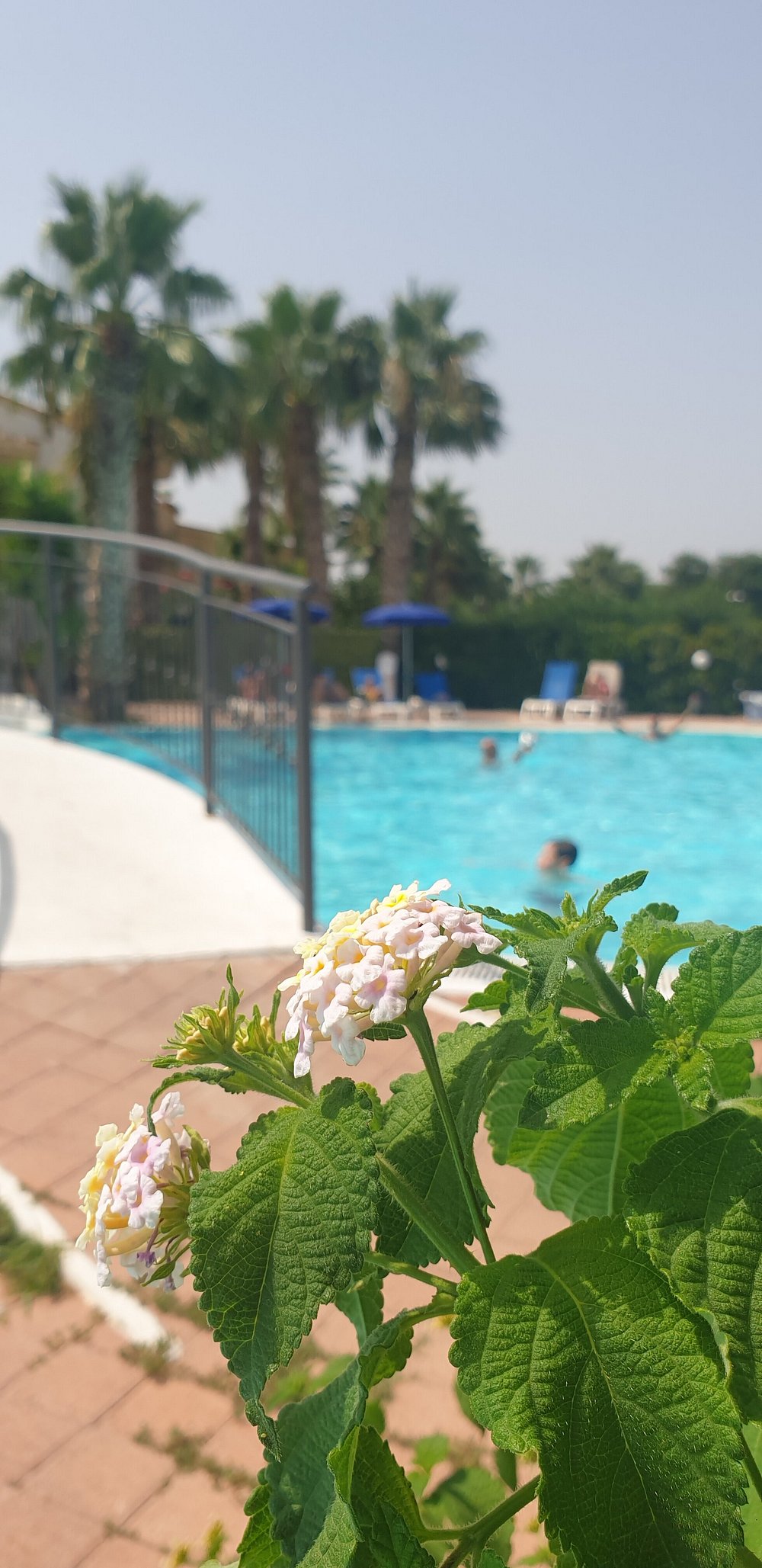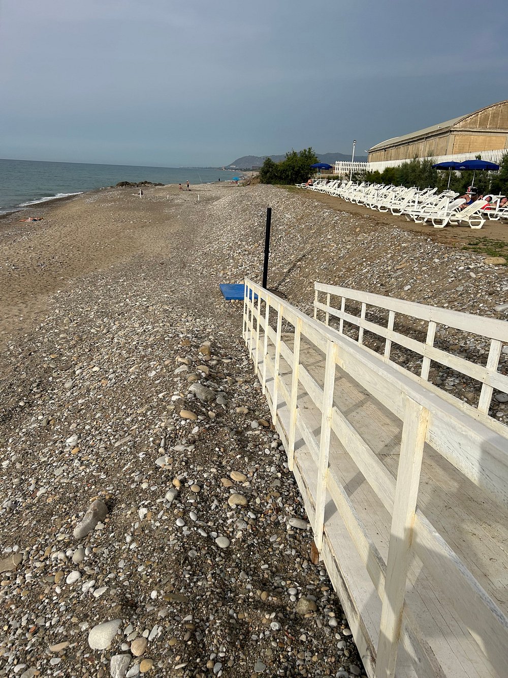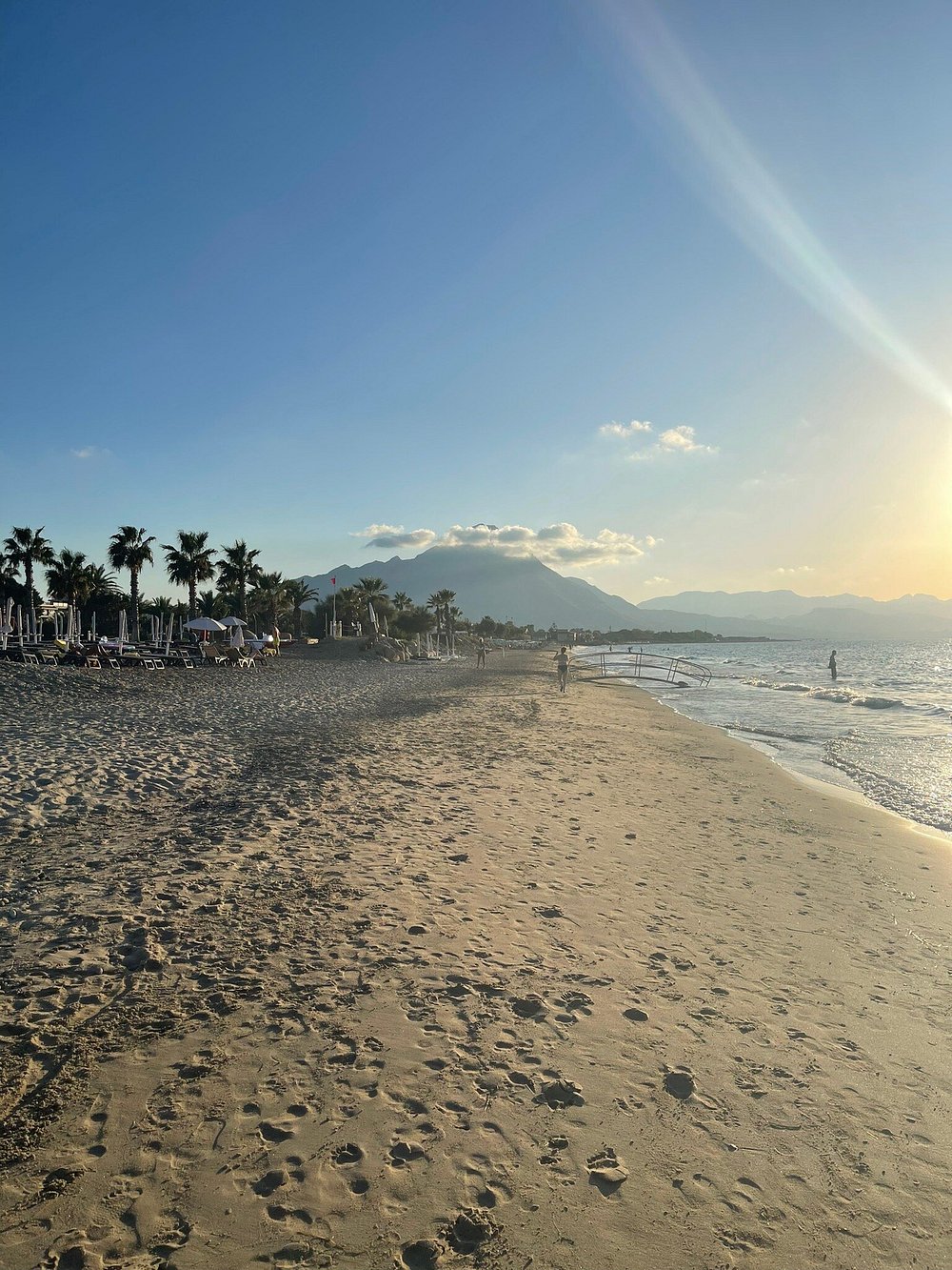 Zdjęcie przedstawia część wypoczynkową z widocznymi leżakami i parasolami, ale obecność osobistych rzeczy turysty dyskwalifikuje je z użycia marketingowego.