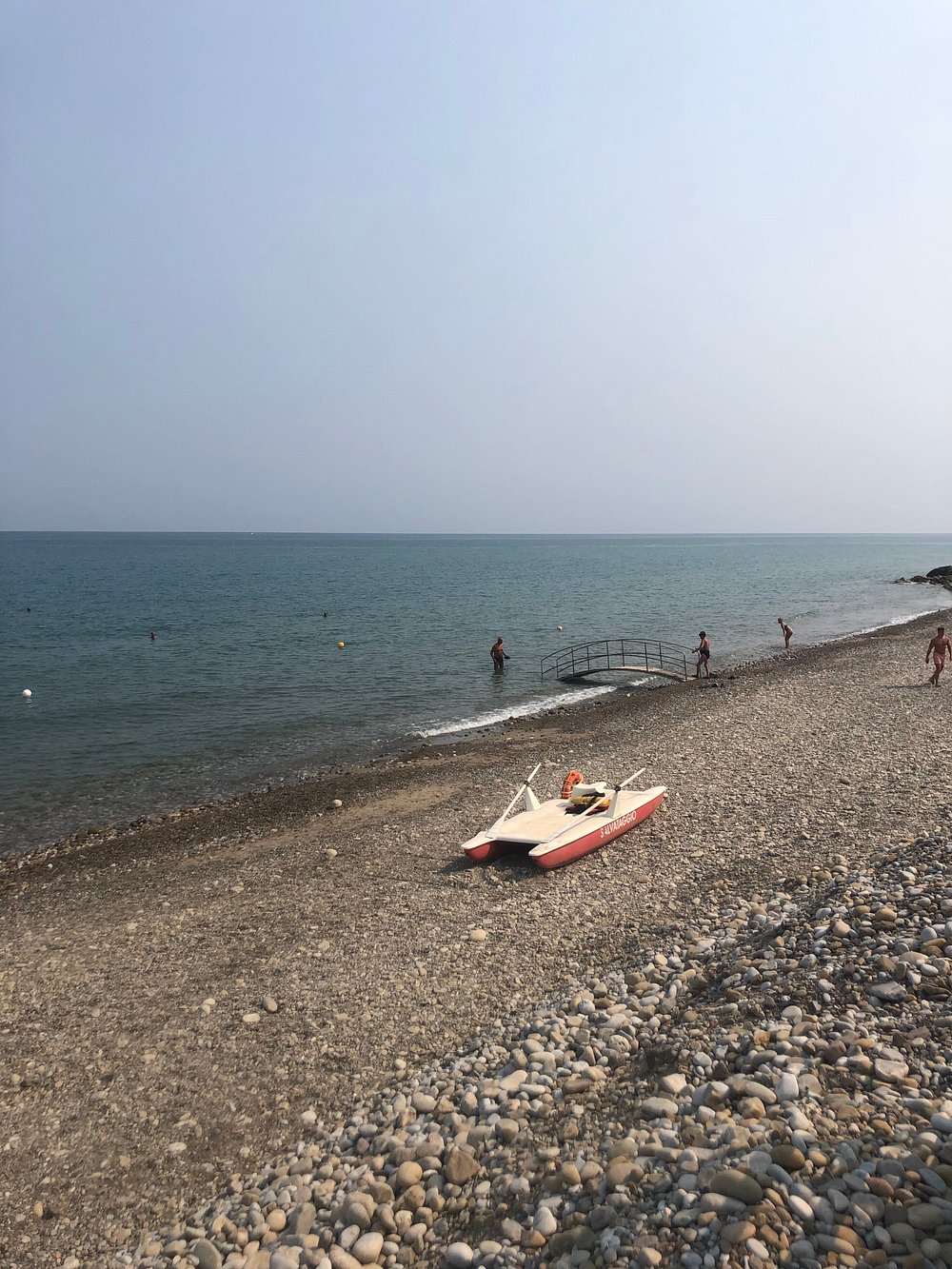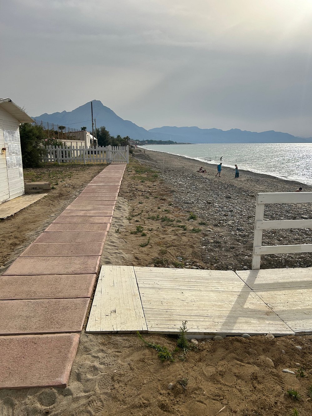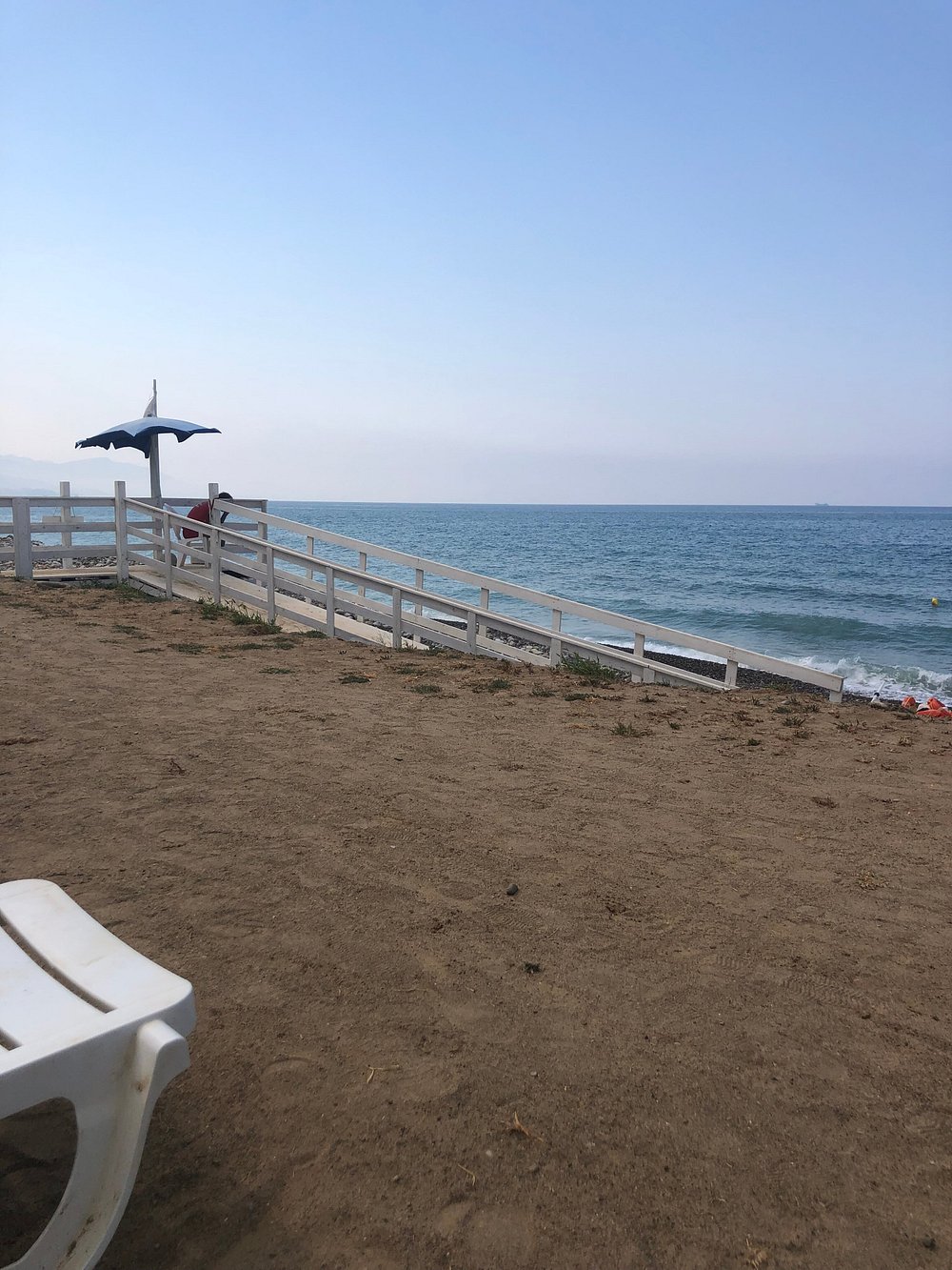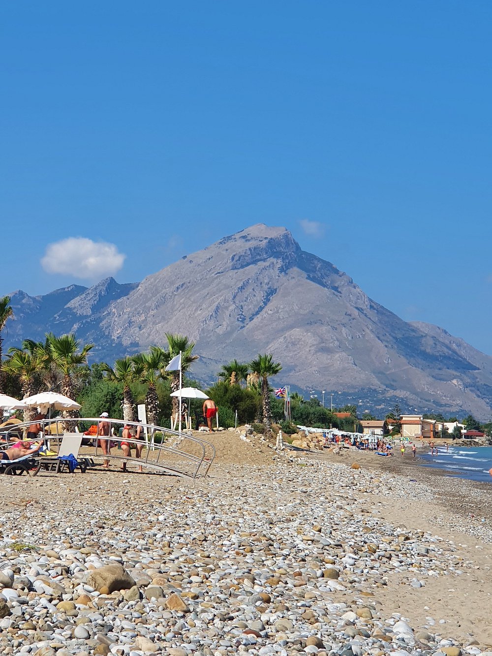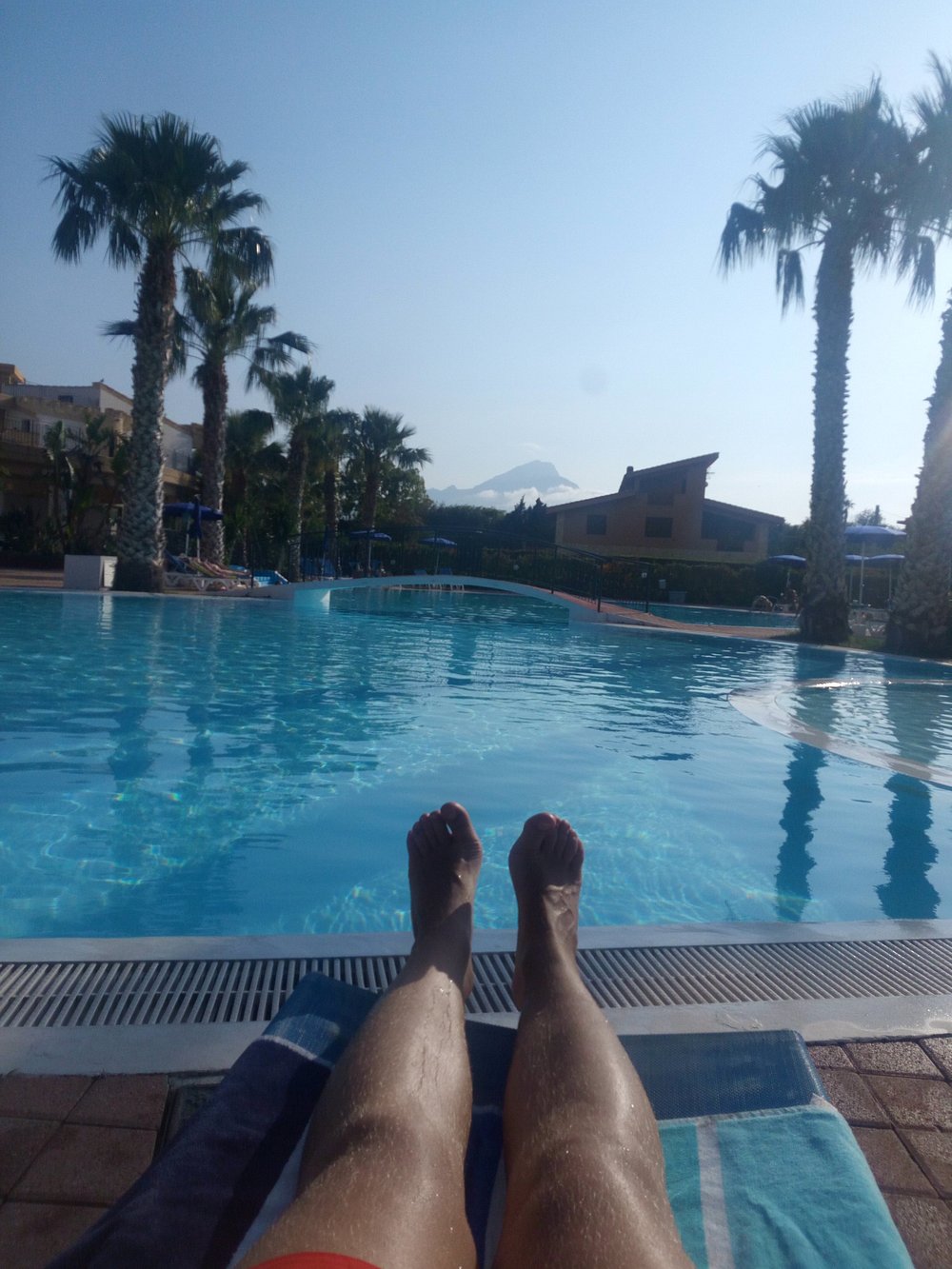 Zdjęcie przedstawia część wypoczynkową z widocznymi leżakami i parasolami, ale obecność osobistych rzeczy turysty dyskwalifikuje je z użycia marketingowego.