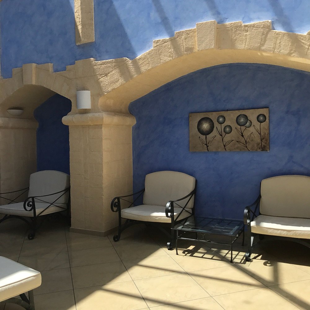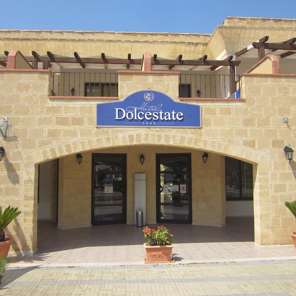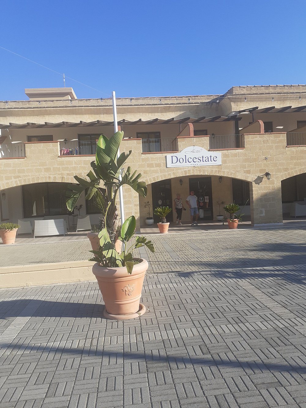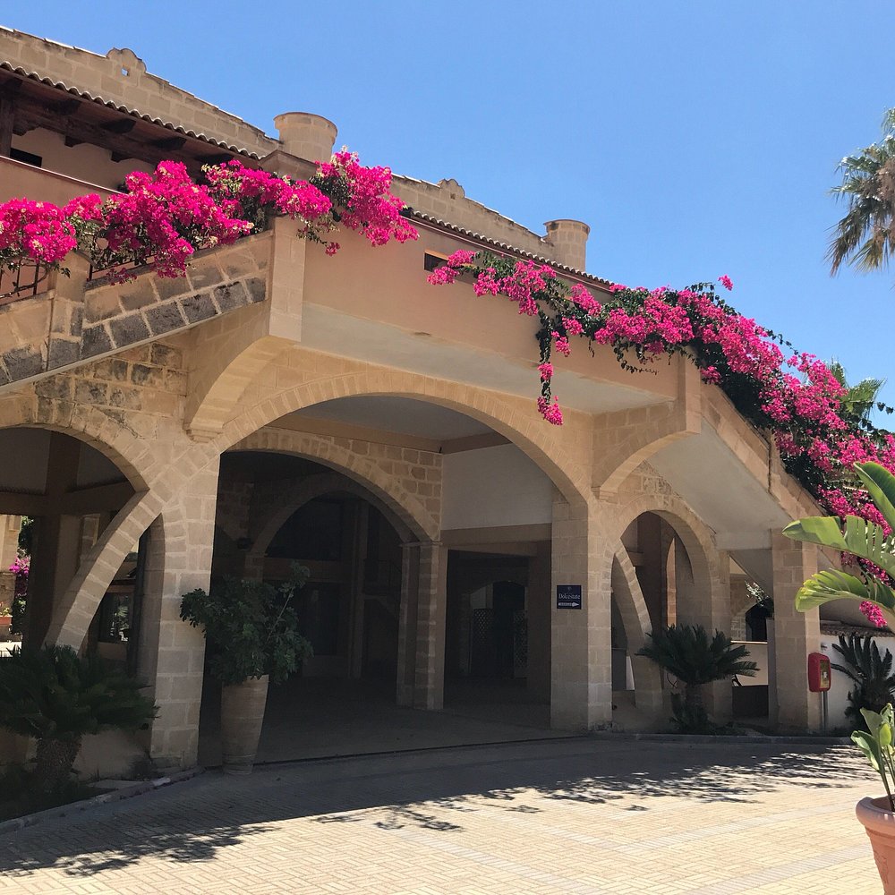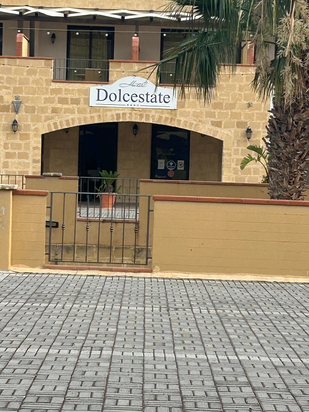 Wejście do hotelu z kamienną fasadą i dużym, widocznym szyldem. Architektura w stylu śródziemnomorskim z elementami drewnianymi i roślinnością w donicach.