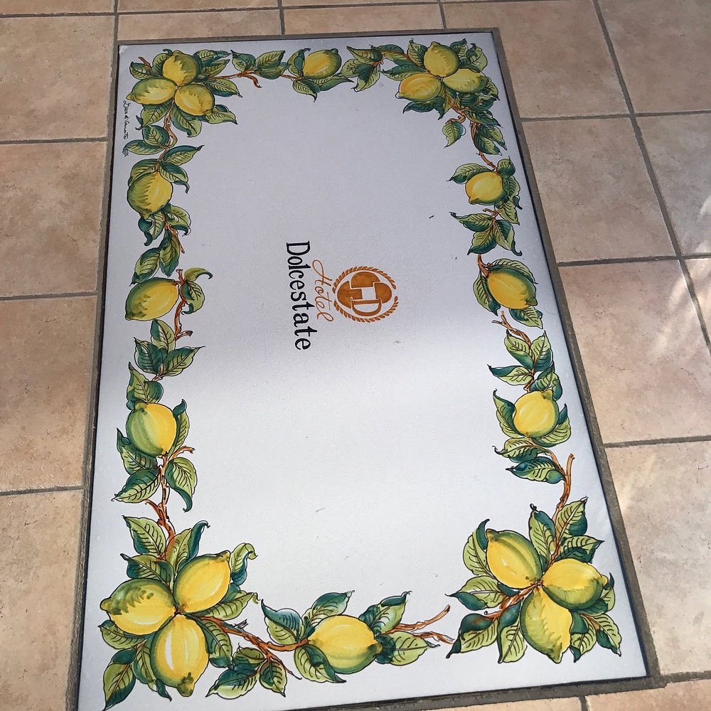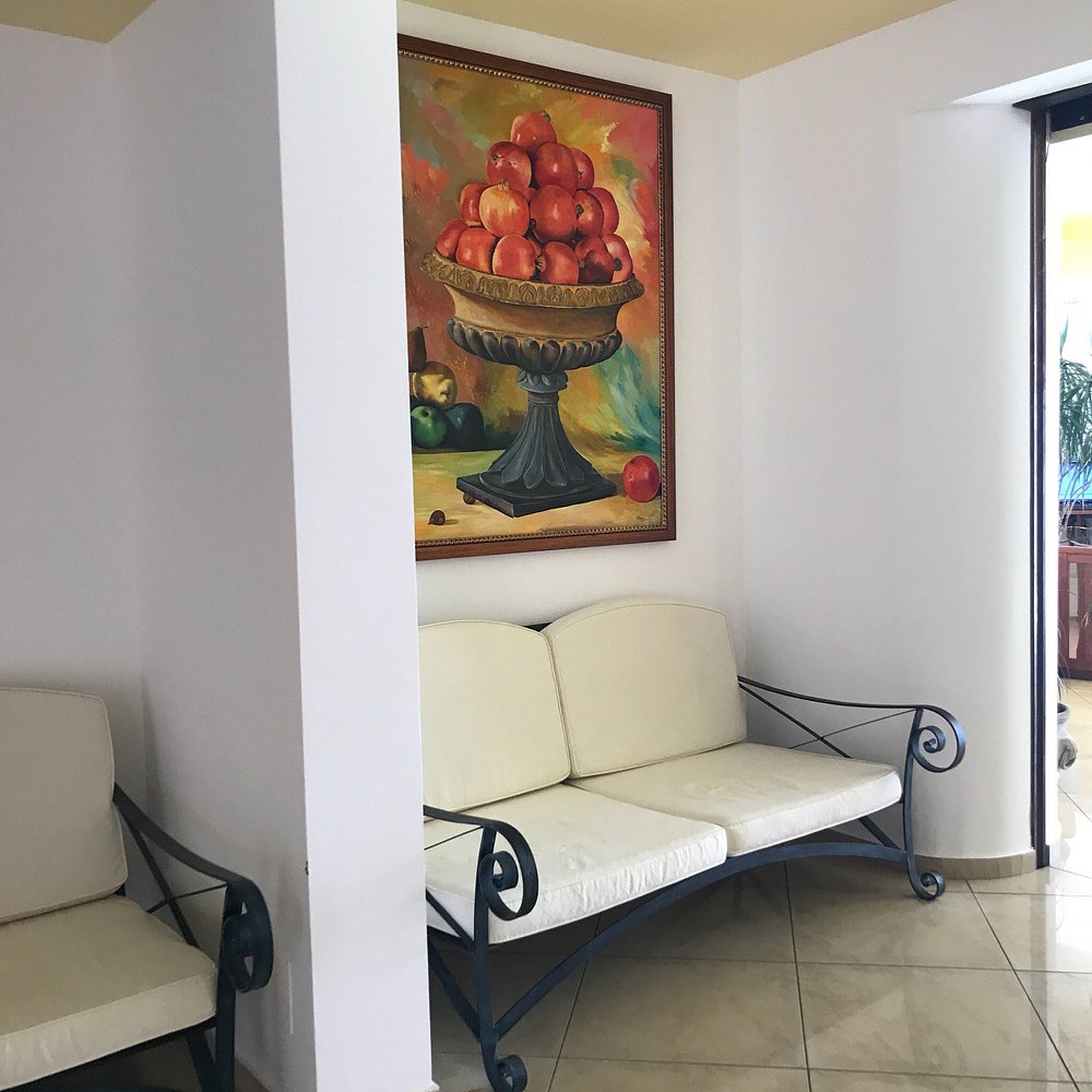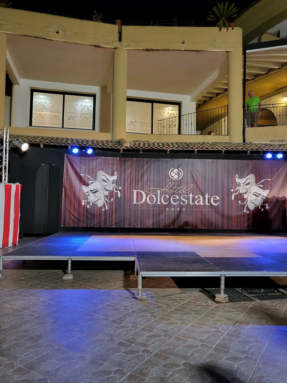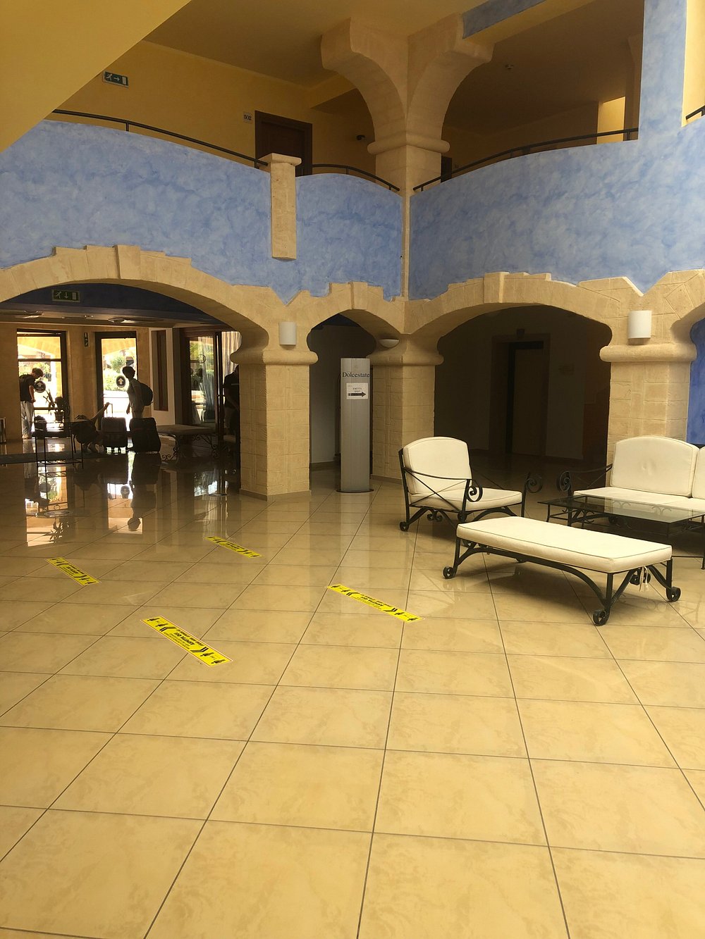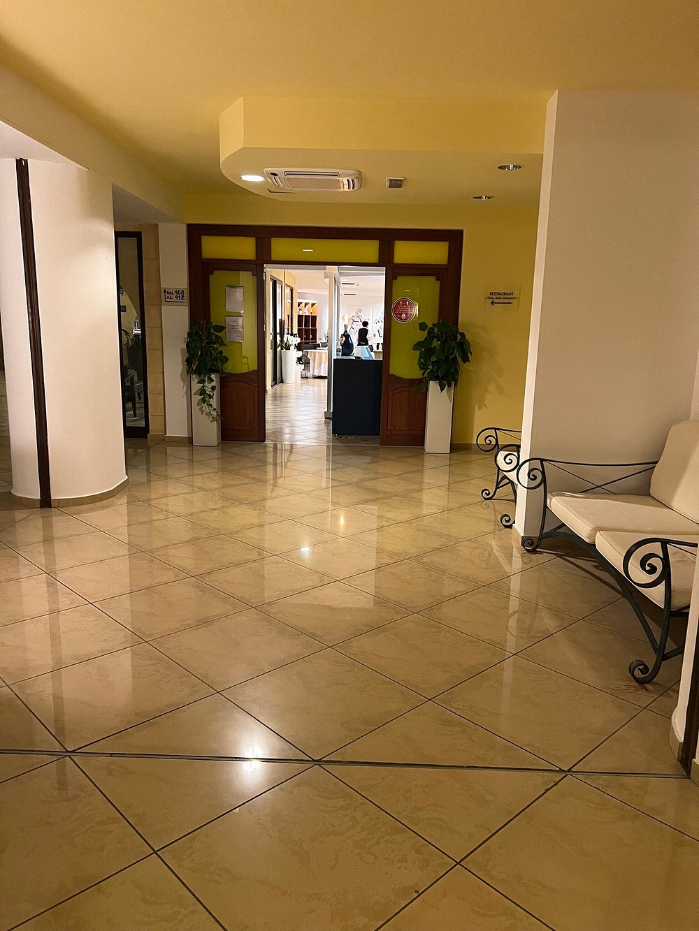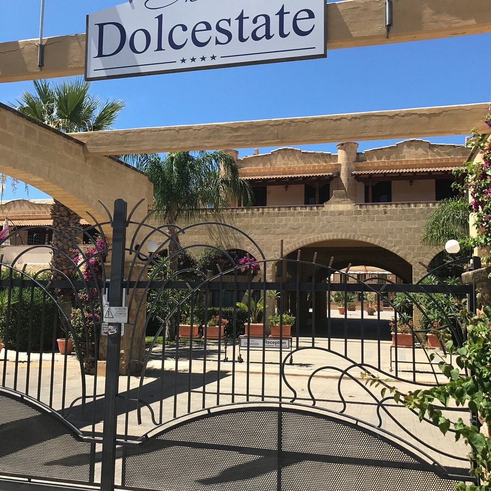 Wejście do hotelu z kamienną fasadą i dużym, widocznym szyldem. Architektura w stylu śródziemnomorskim z elementami drewnianymi i roślinnością w donicach.