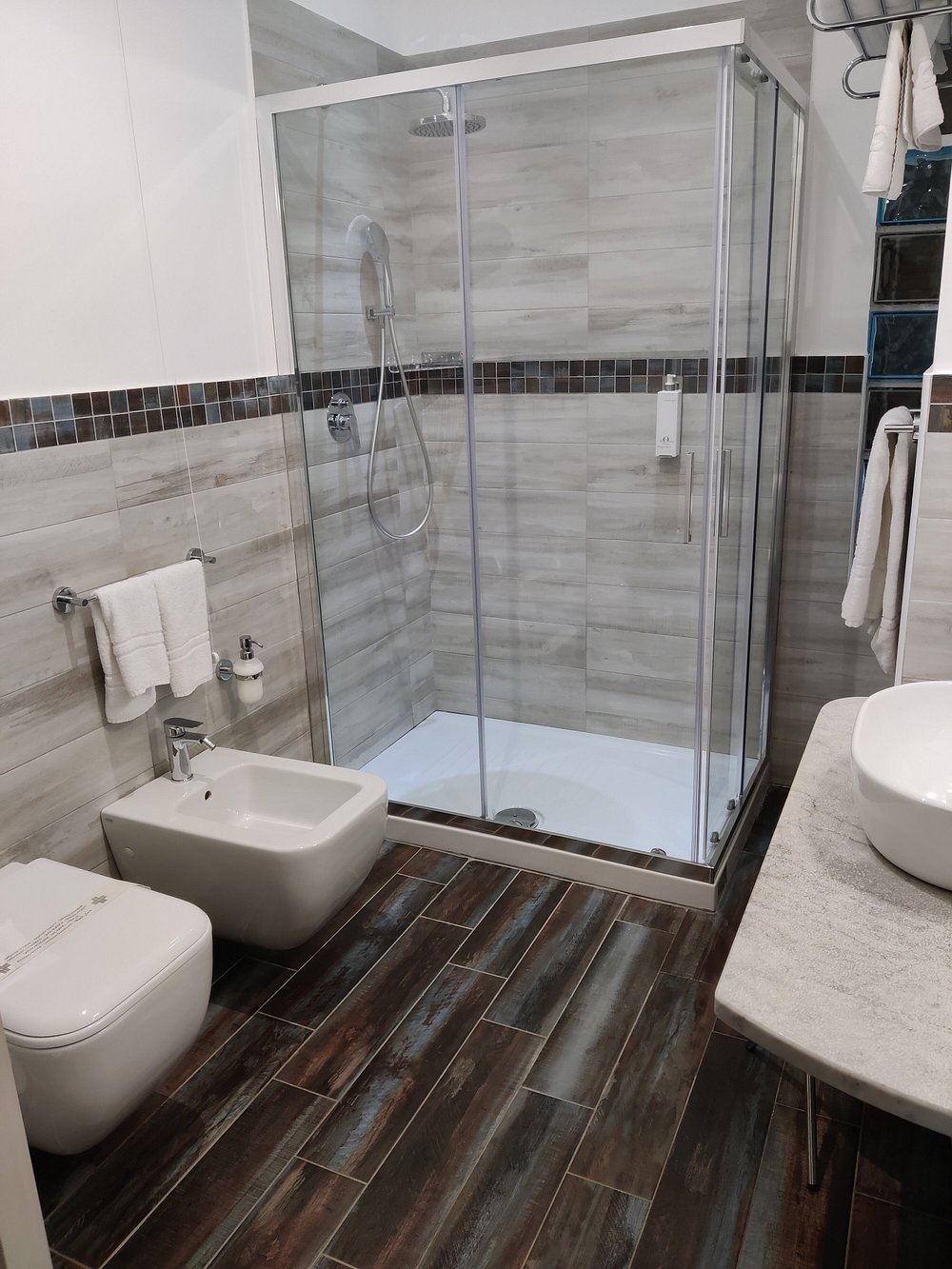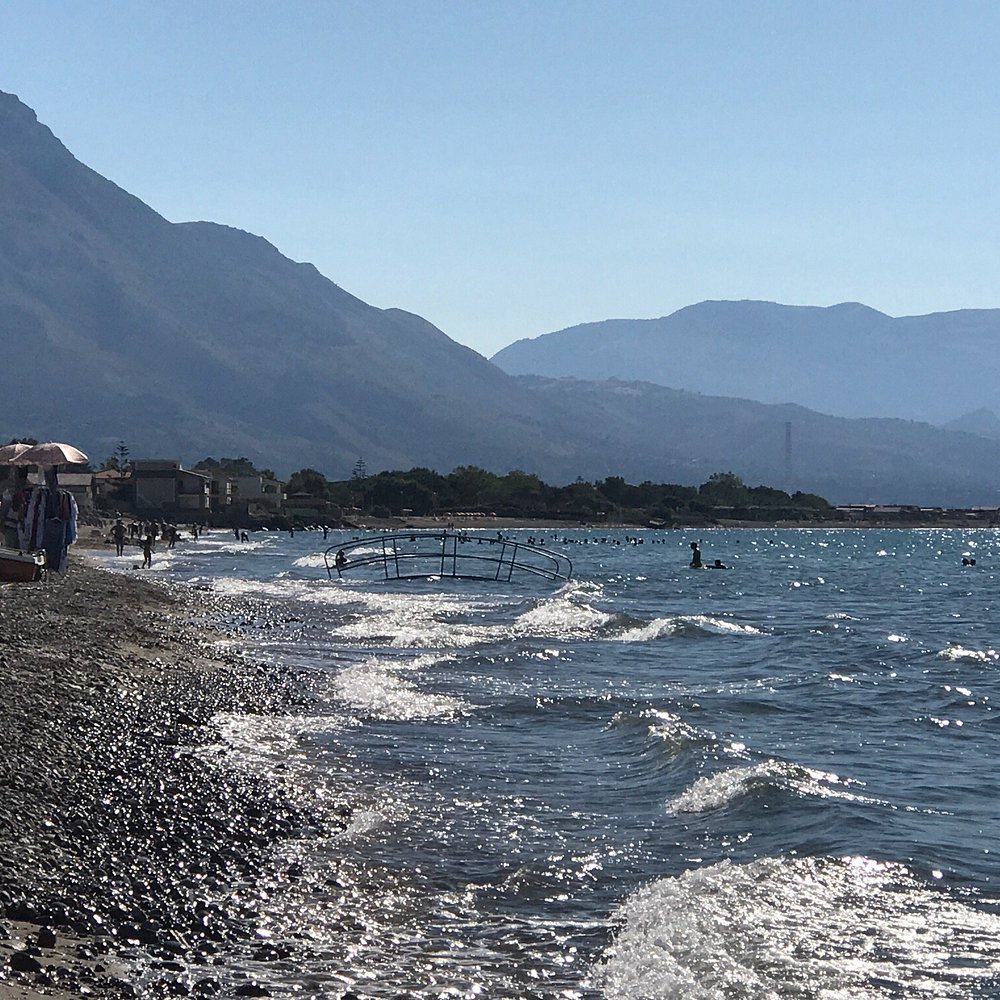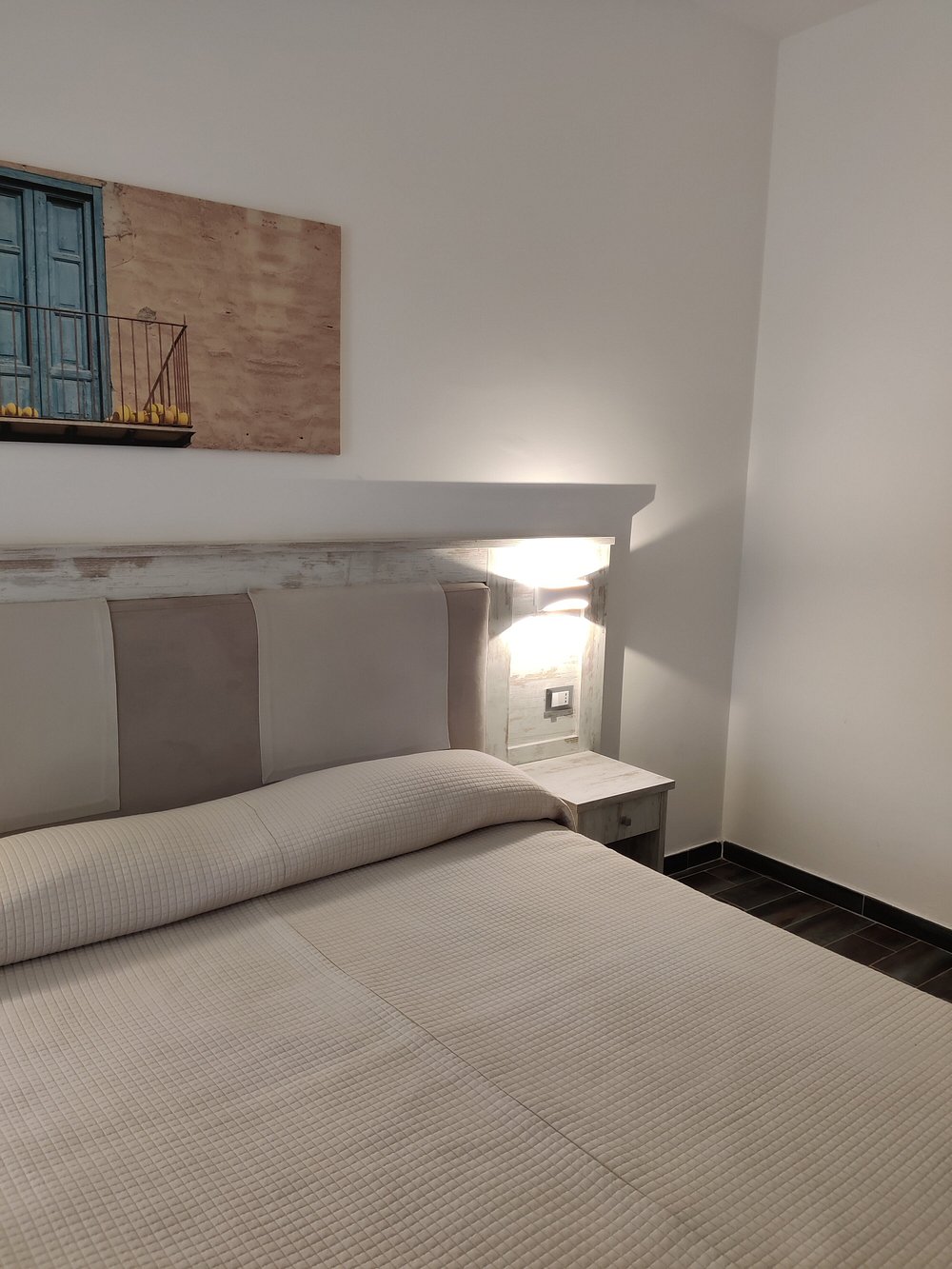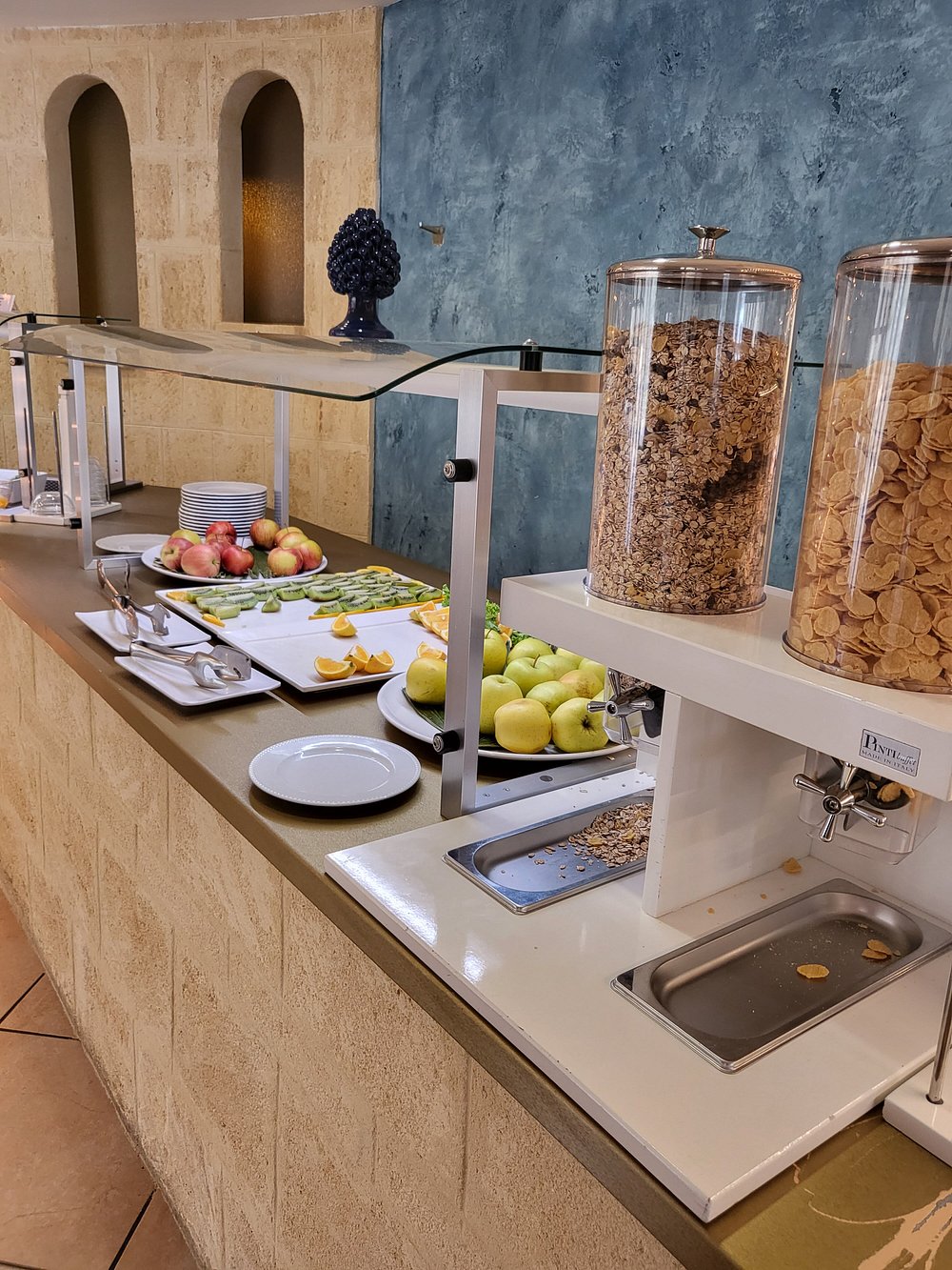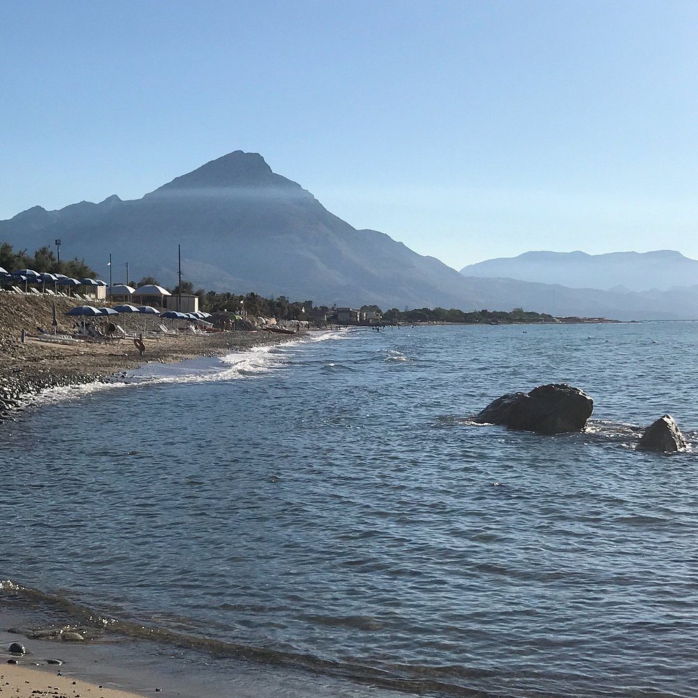 Wejście do hotelu z kamienną fasadą i dużym, widocznym szyldem. Architektura w stylu śródziemnomorskim z elementami drewnianymi i roślinnością w donicach.