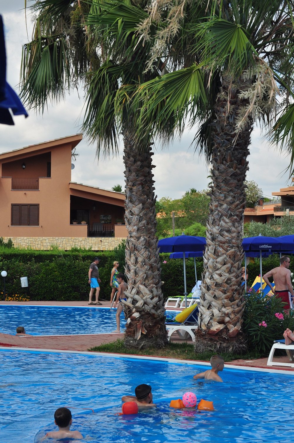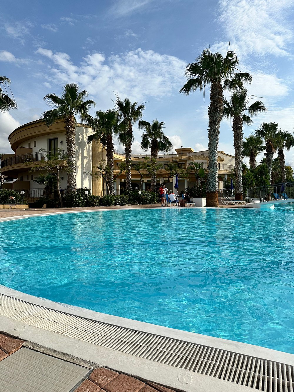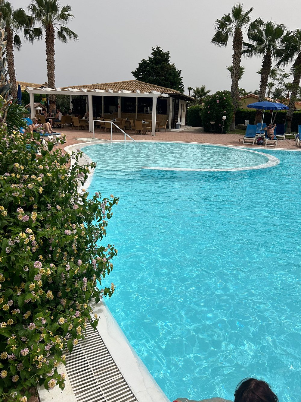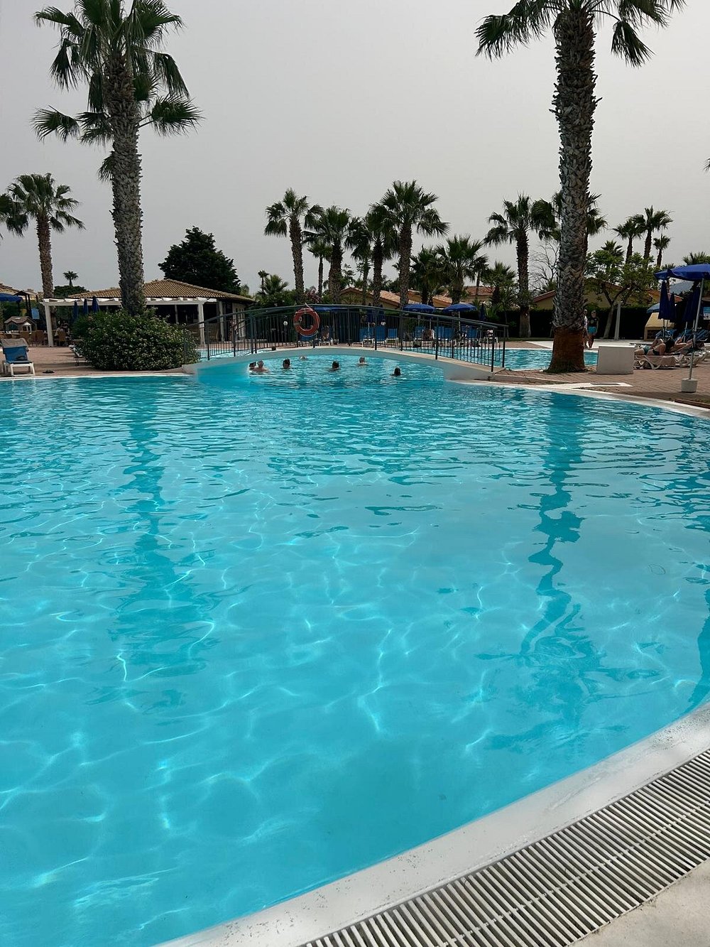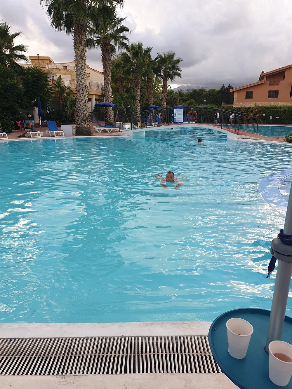 Basen hotelowy otoczony palmami, z kilkoma osobami korzystającymi z kąpieli. Woda w basenie ma przyjemny, turkusowy kolor, ale niebo jest zachmurzone, co wpływa na ogólną atrakcyjność zdjęcia.
