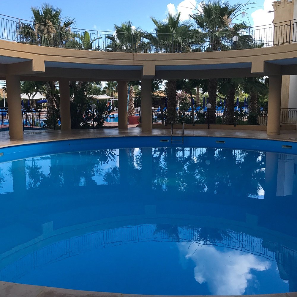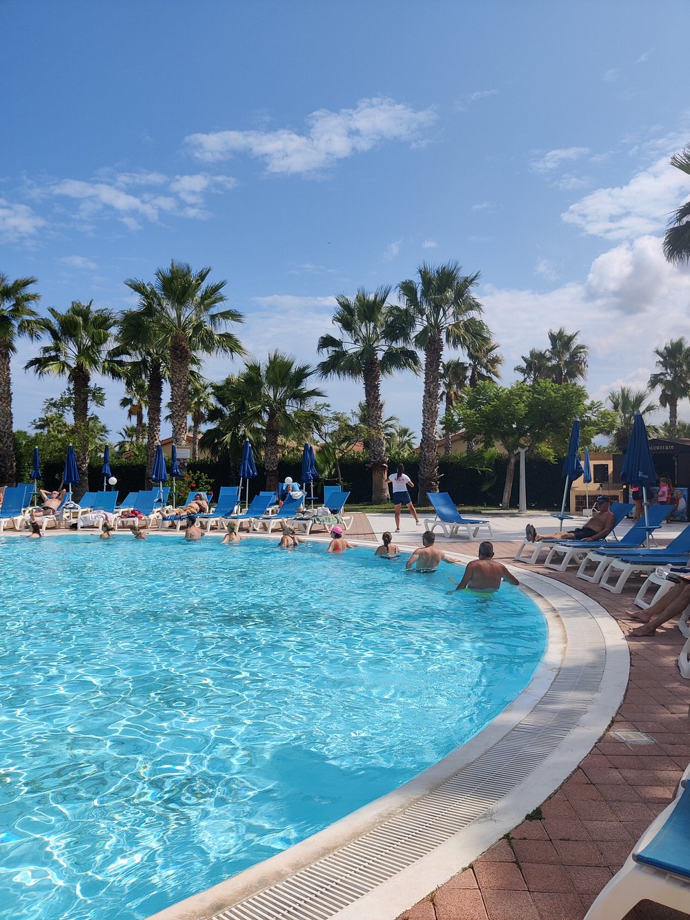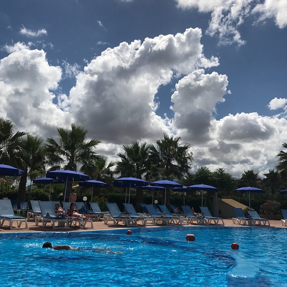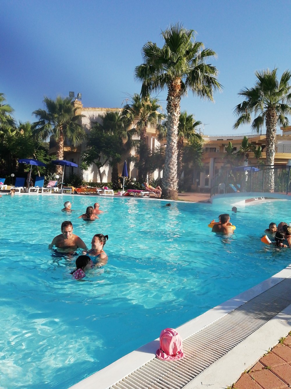 Basen hotelowy otoczony palmami, z kilkoma osobami korzystającymi z kąpieli. Woda w basenie ma przyjemny, turkusowy kolor, ale niebo jest zachmurzone, co wpływa na ogólną atrakcyjność zdjęcia.