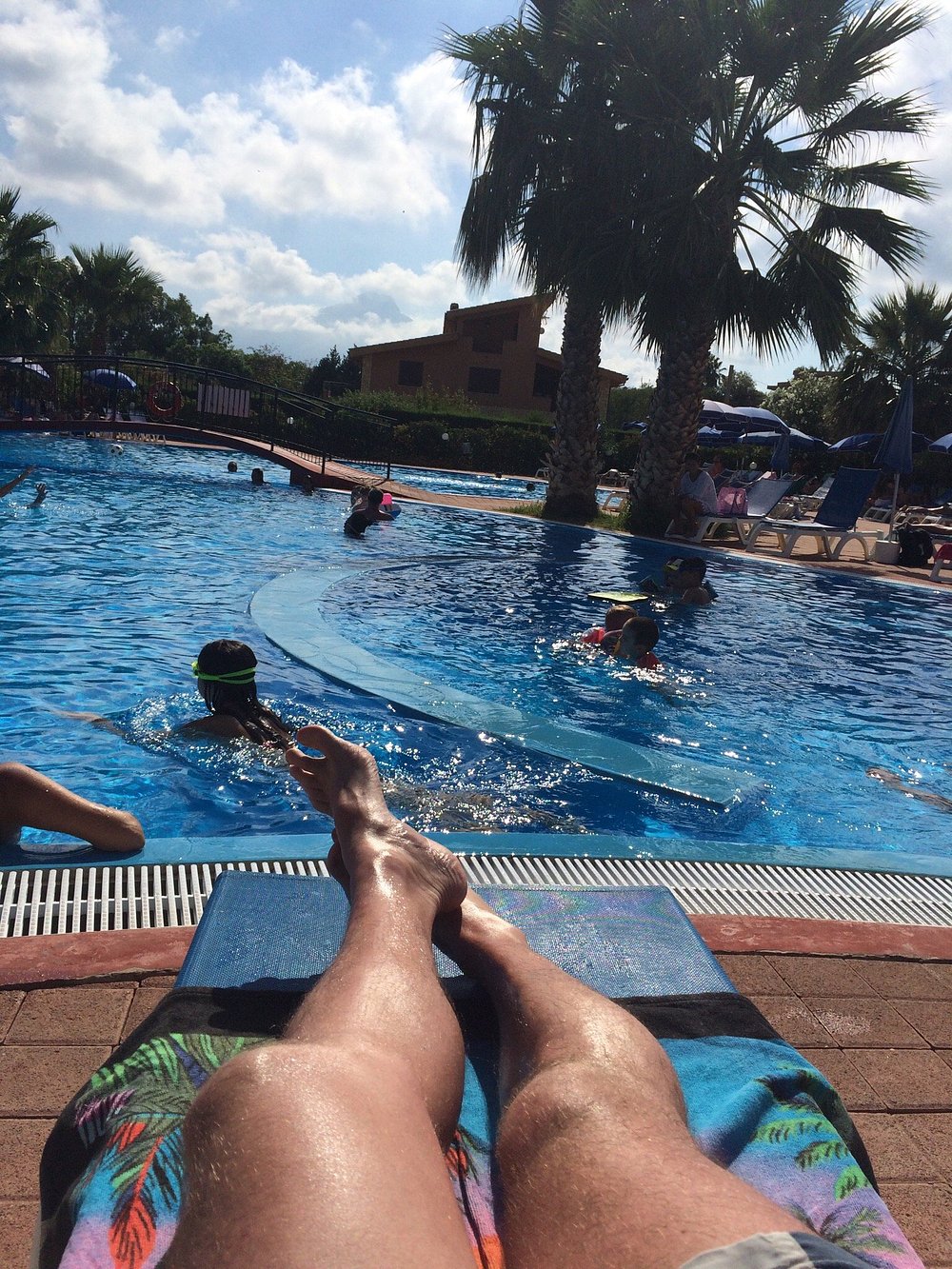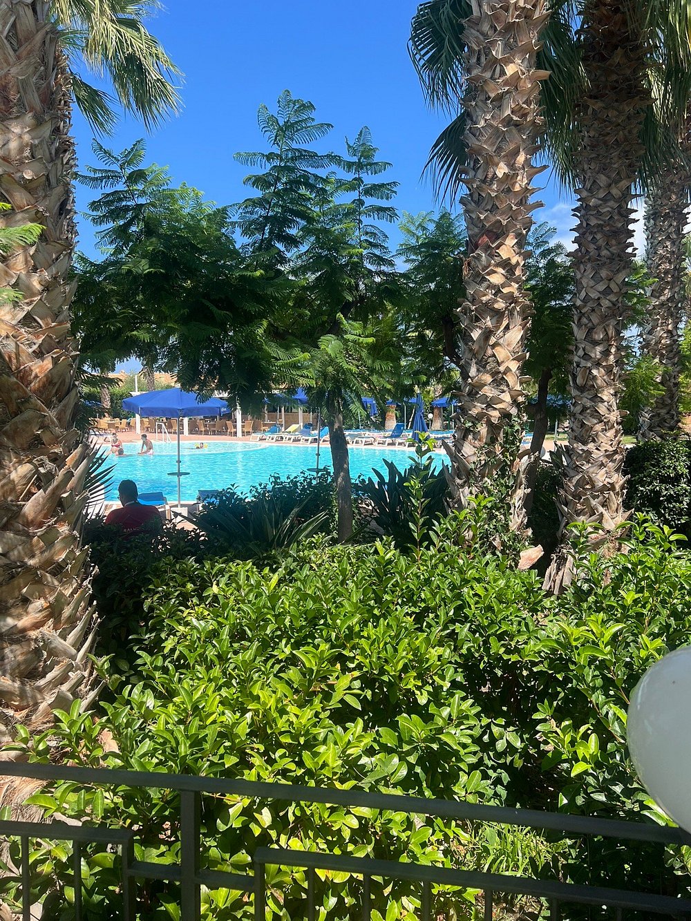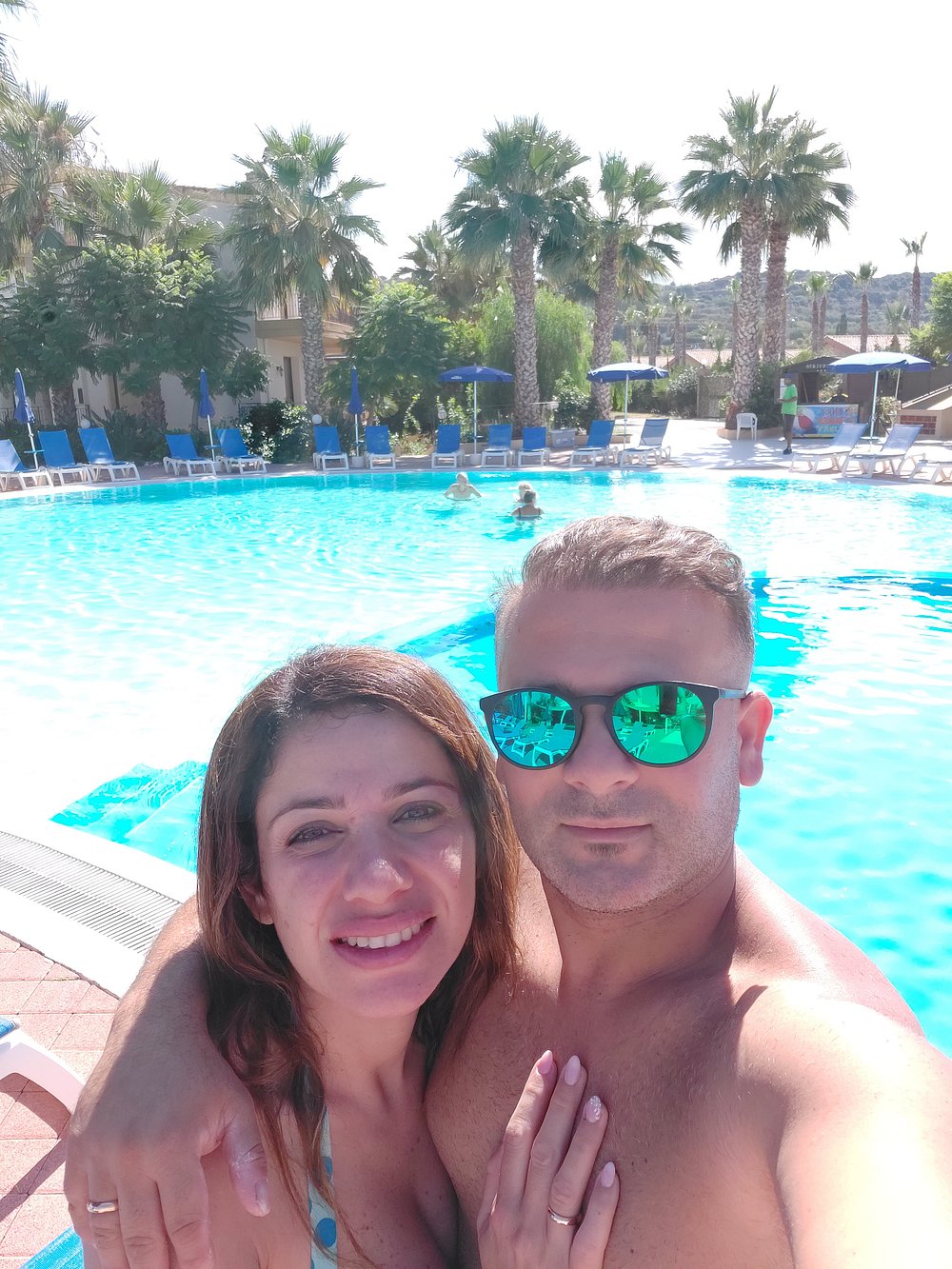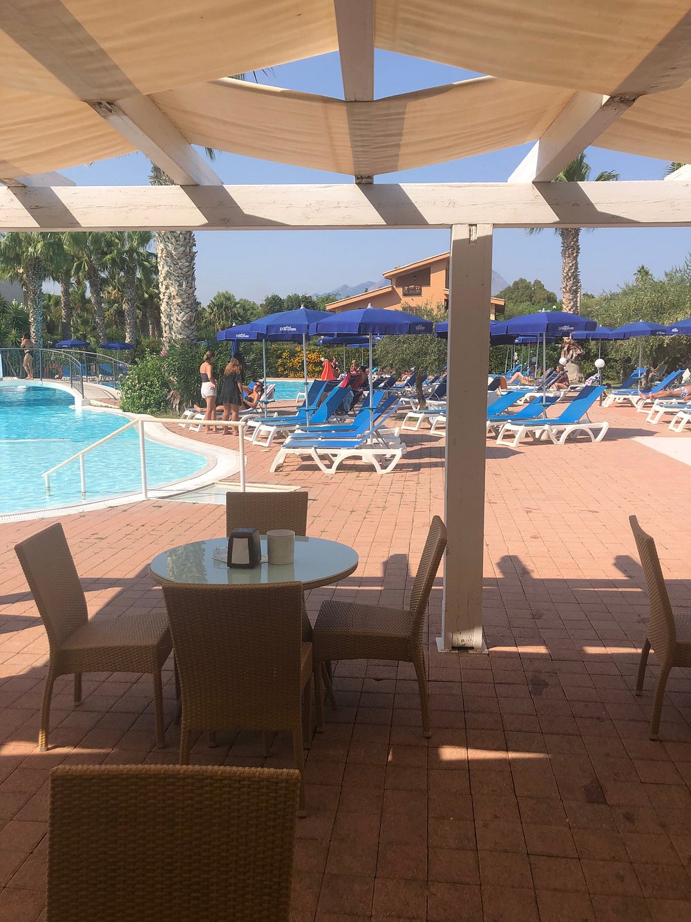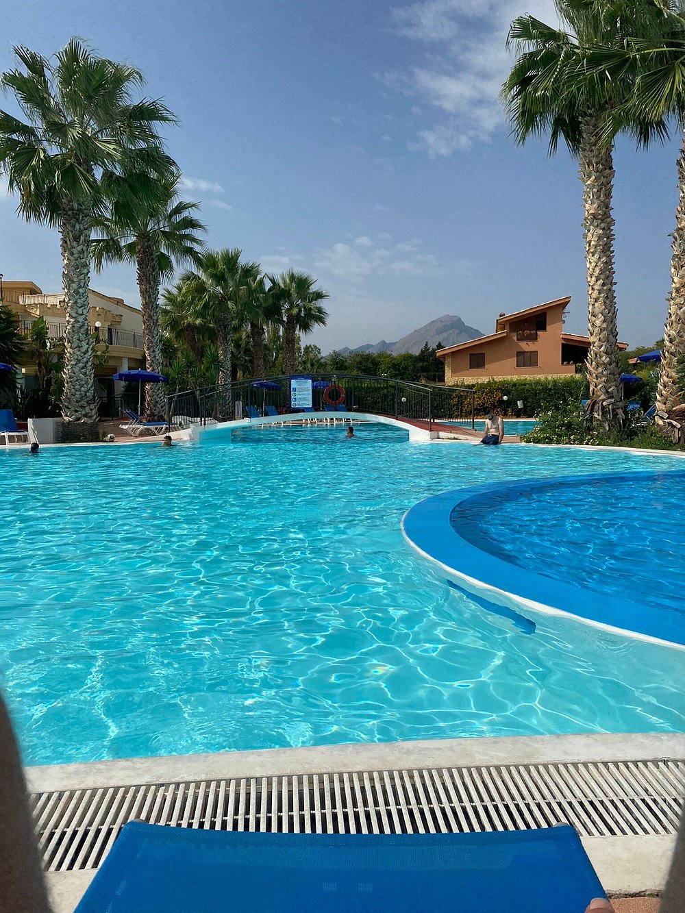 Basen hotelowy otoczony palmami, z kilkoma osobami korzystającymi z kąpieli. Woda w basenie ma przyjemny, turkusowy kolor, ale niebo jest zachmurzone, co wpływa na ogólną atrakcyjność zdjęcia.