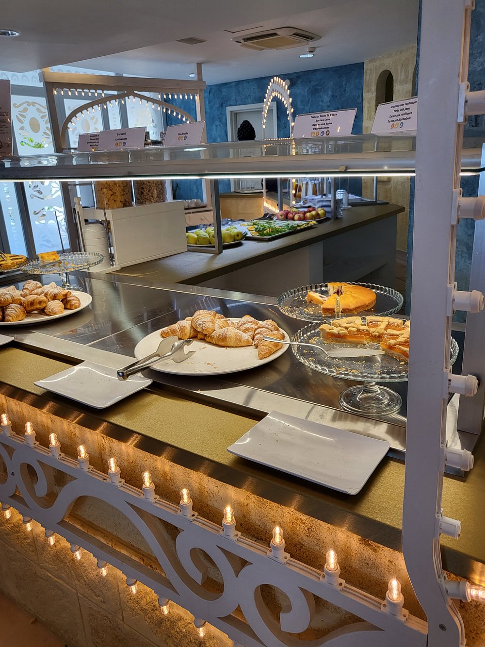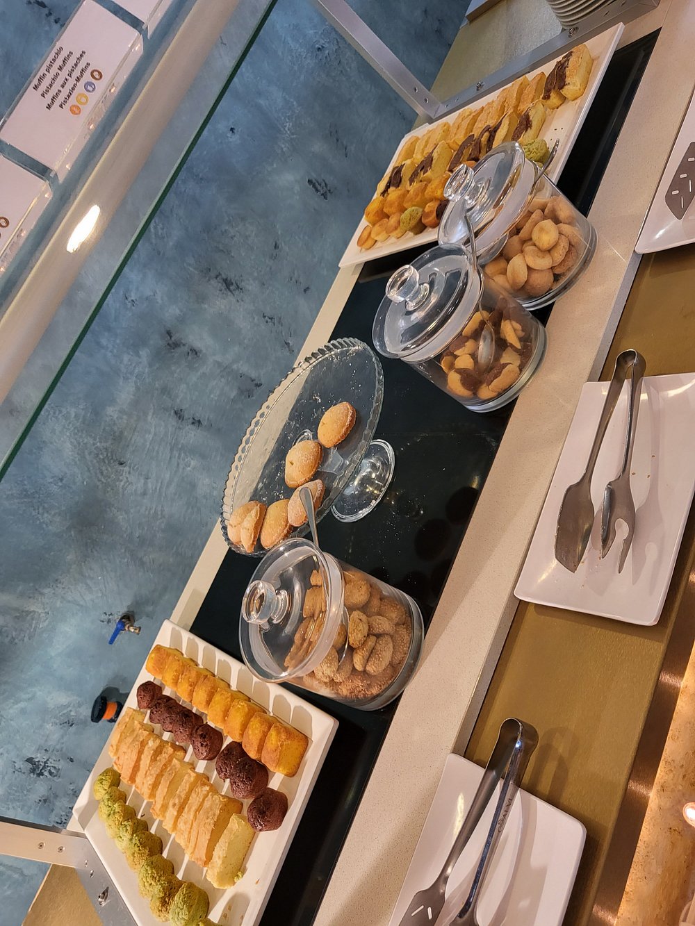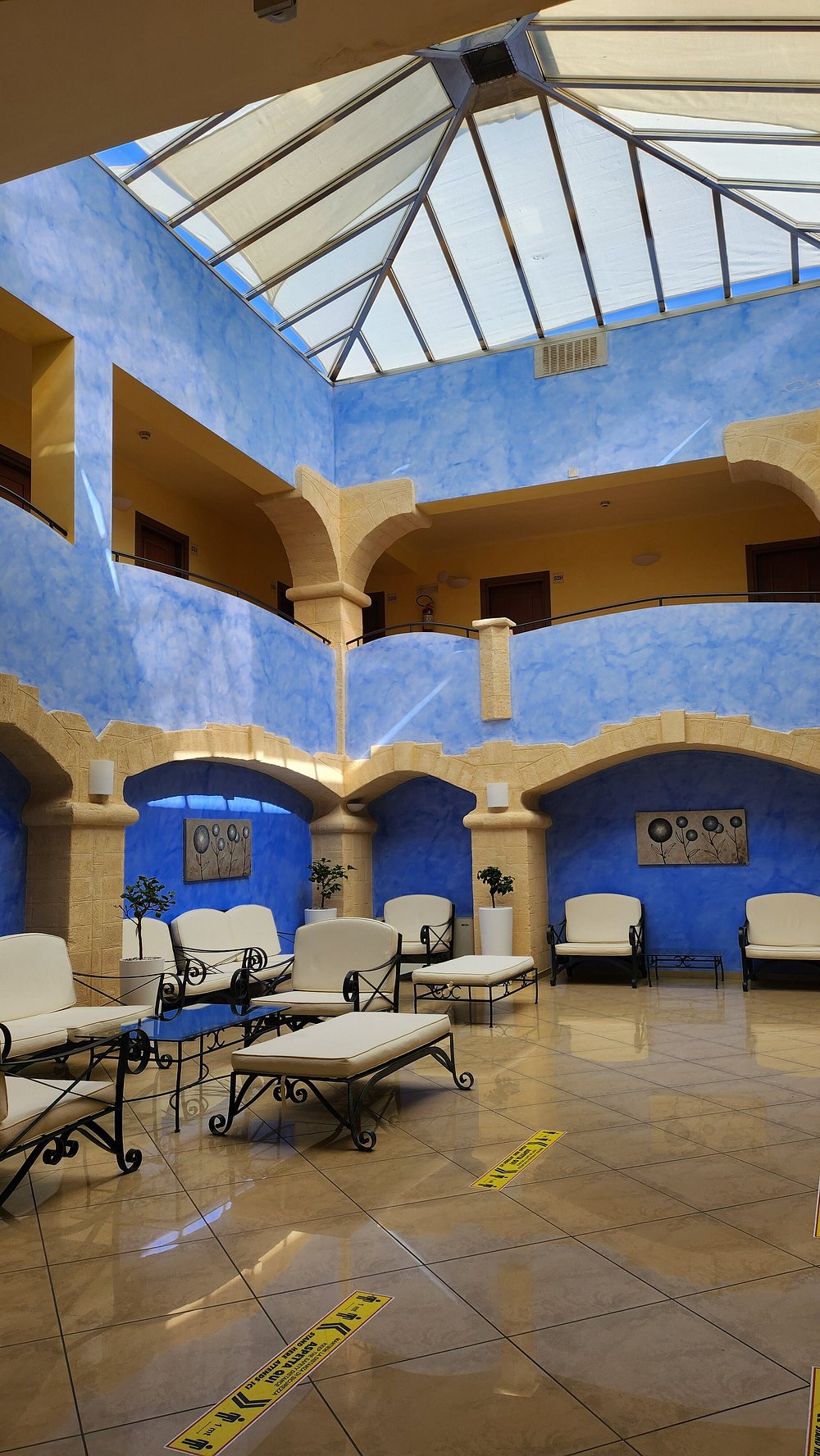 Przestronne wnętrze z niebieskimi ścianami i szklanym dachem, eleganckie leżaki ustawione wzdłuż ścian. Jasne, dobrze doświetlone pomieszczenie z nowoczesnym designem.