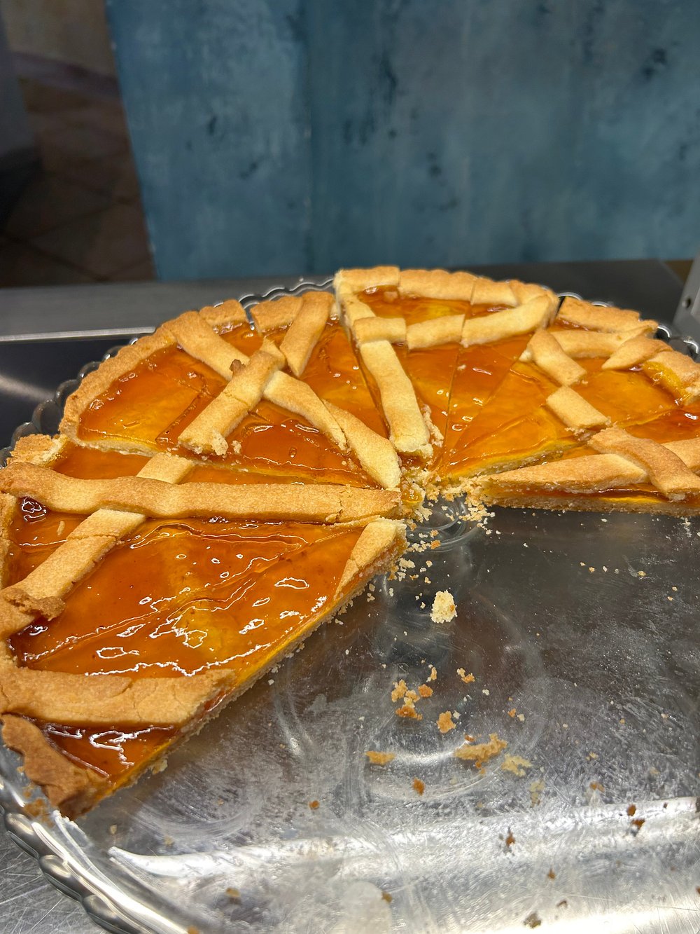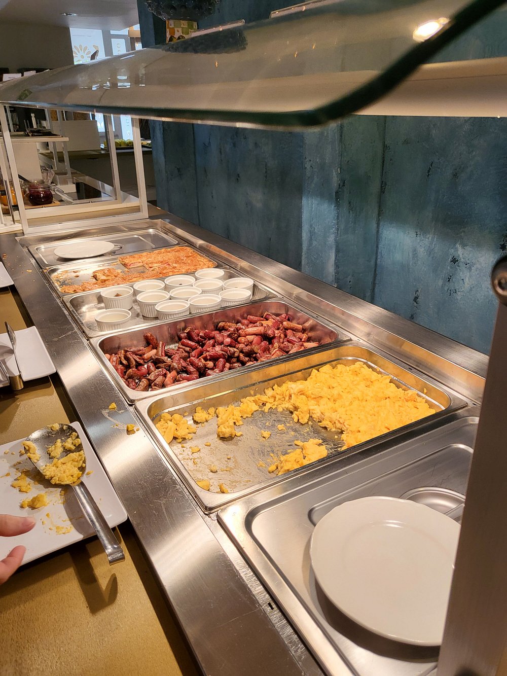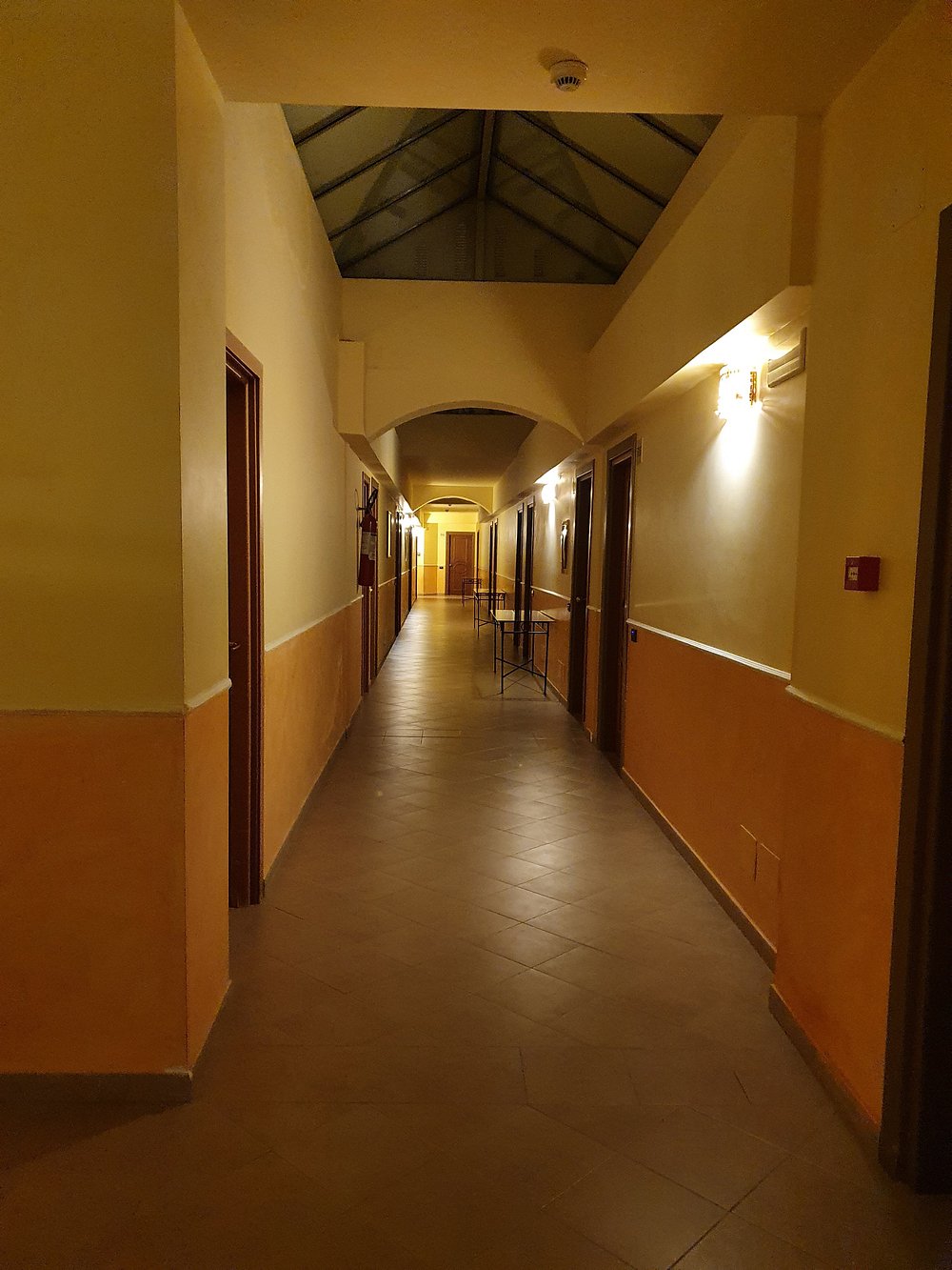 Przestronne wnętrze z niebieskimi ścianami i szklanym dachem, eleganckie leżaki ustawione wzdłuż ścian. Jasne, dobrze doświetlone pomieszczenie z nowoczesnym designem.