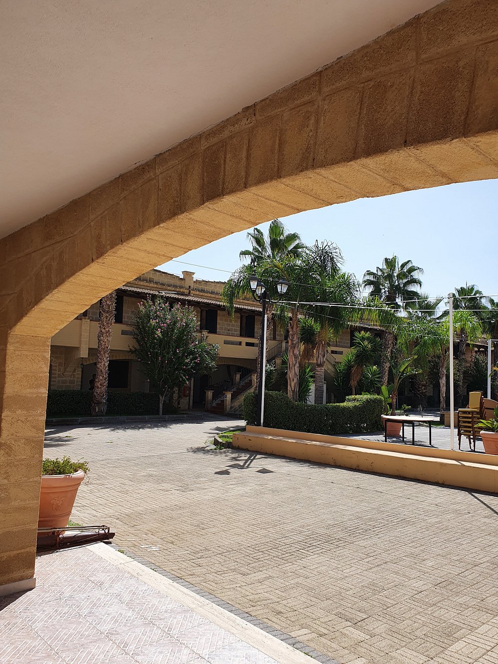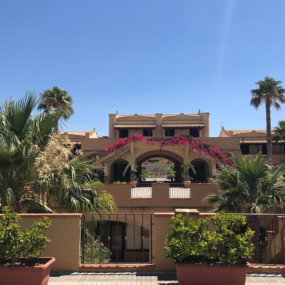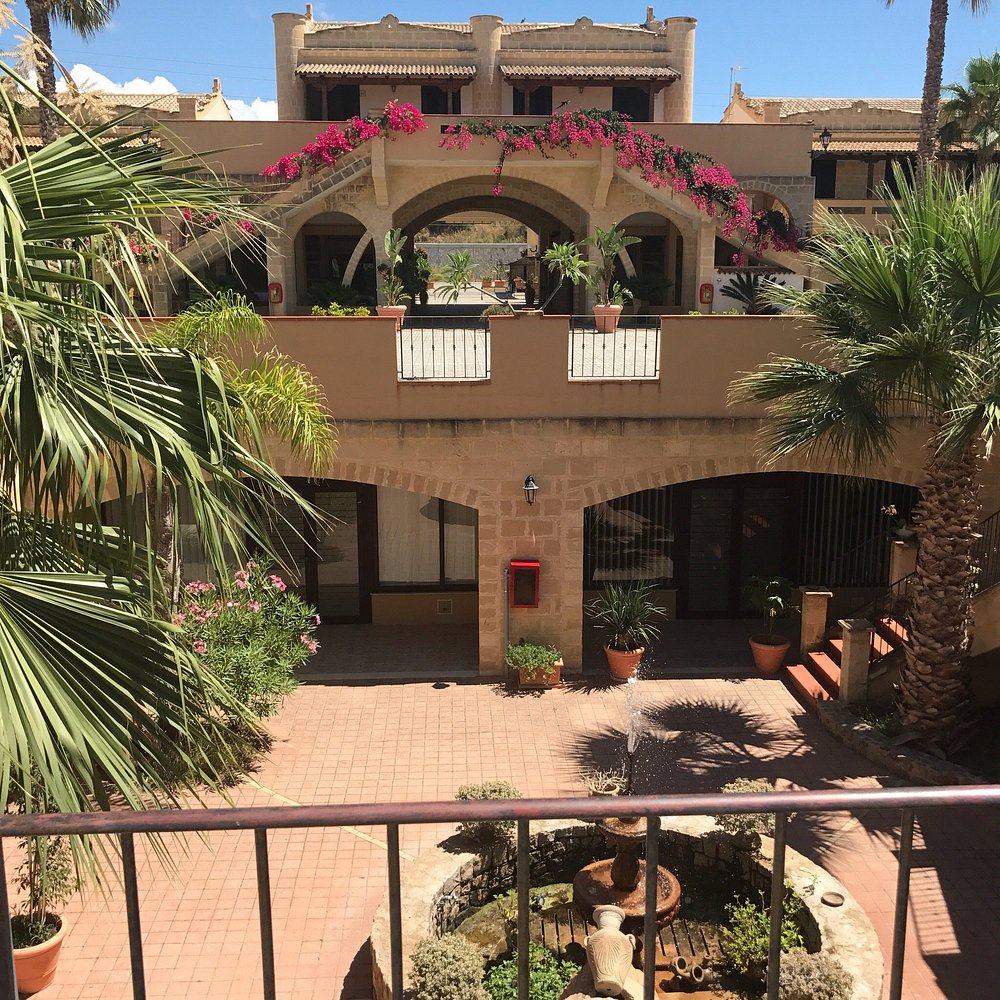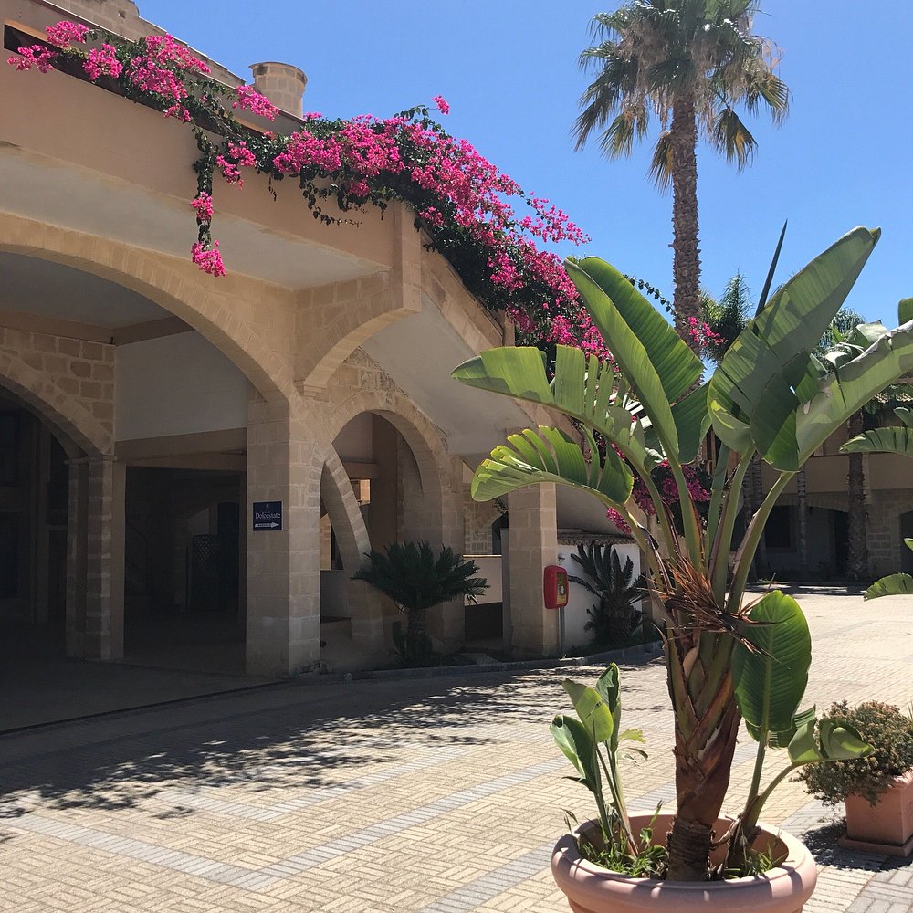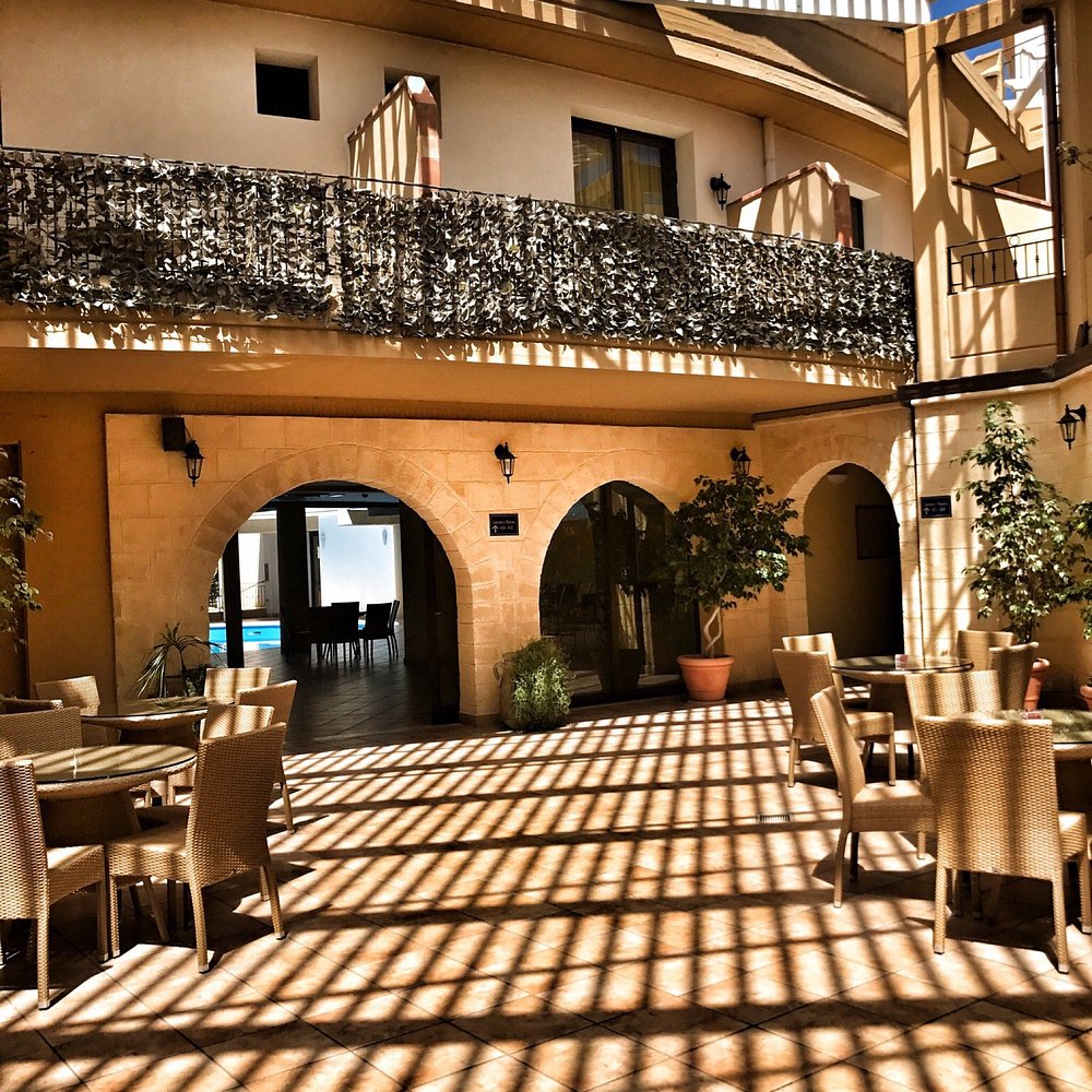 Hotelowa fasada z ozdobnymi łukami i kwitnącymi roślinami, otoczona palmami. Centralny dziedziniec z fontanną i zadbanymi roślinami tworzy przyjemną atmosferę.