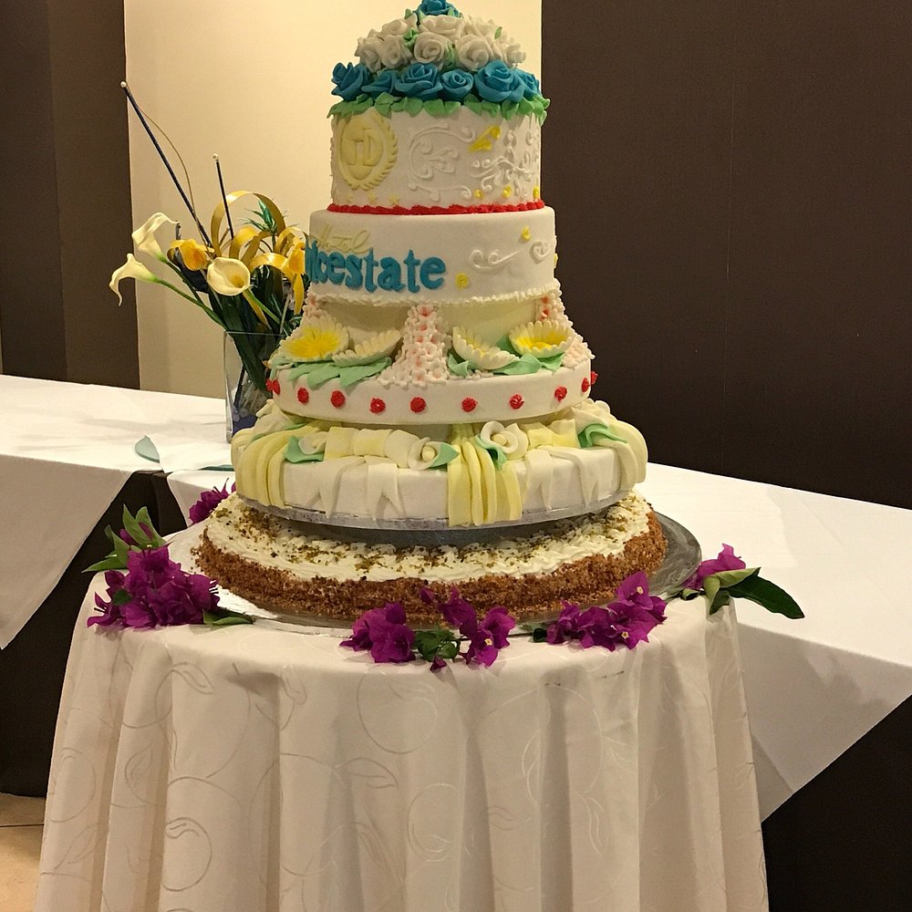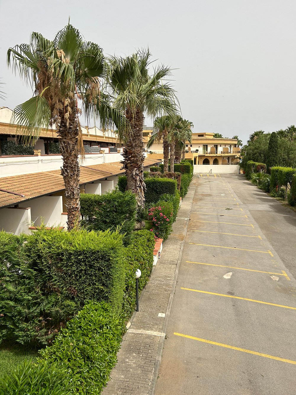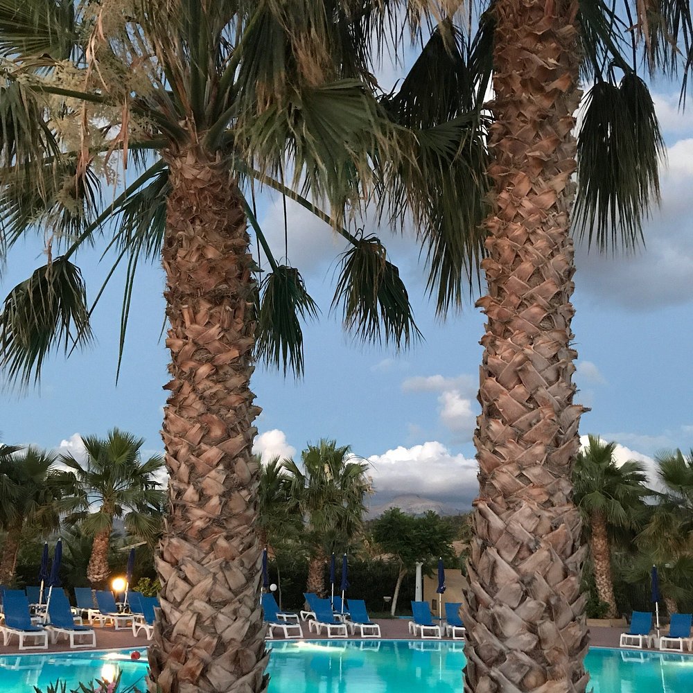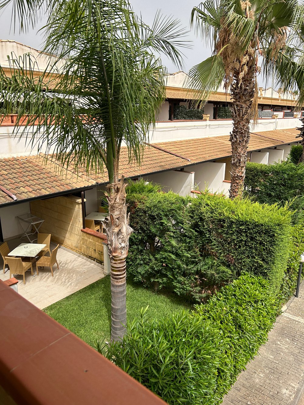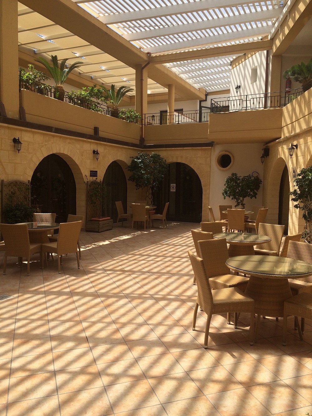 Hotelowa fasada z ozdobnymi łukami i kwitnącymi roślinami, otoczona palmami. Centralny dziedziniec z fontanną i zadbanymi roślinami tworzy przyjemną atmosferę.