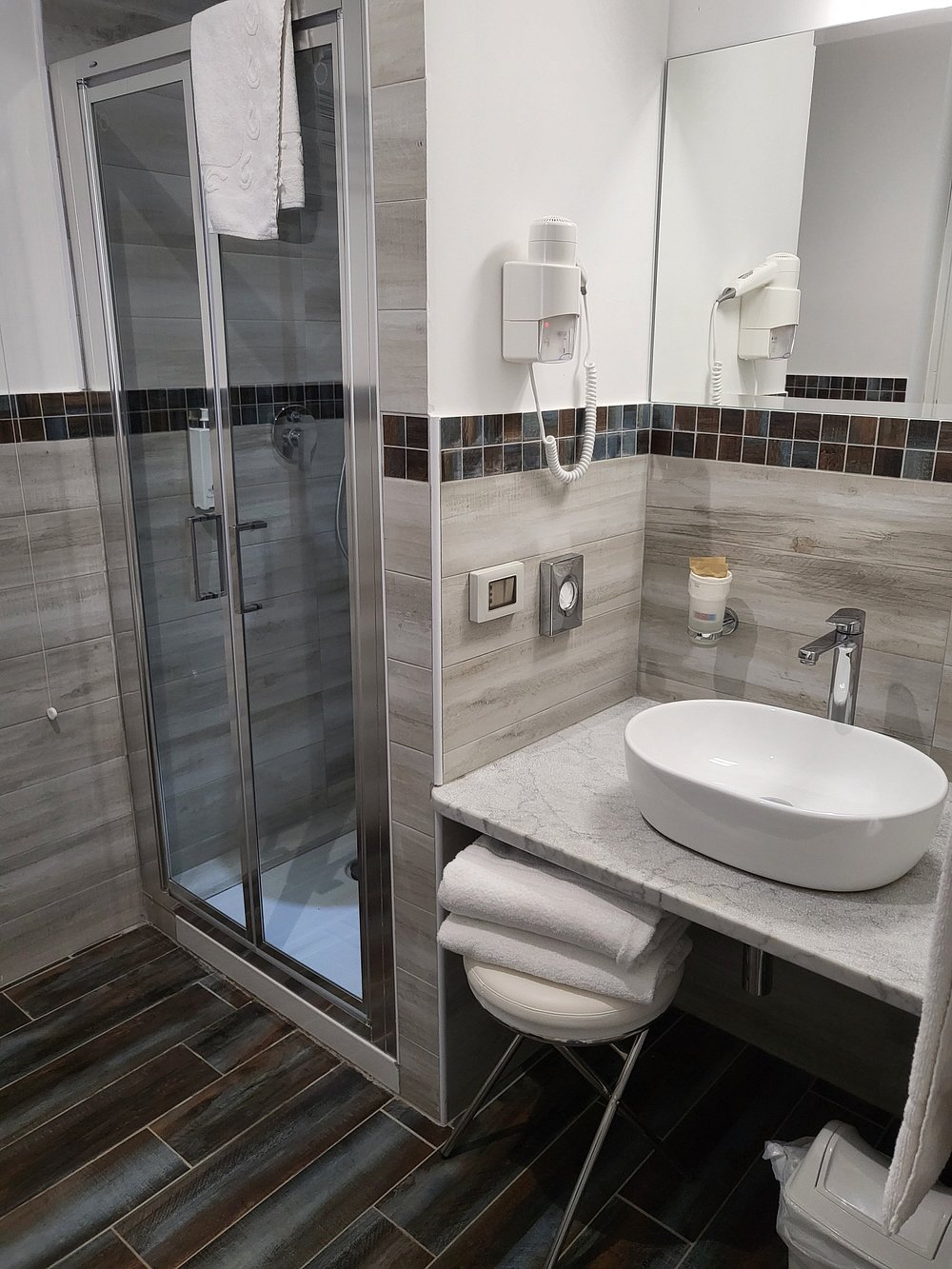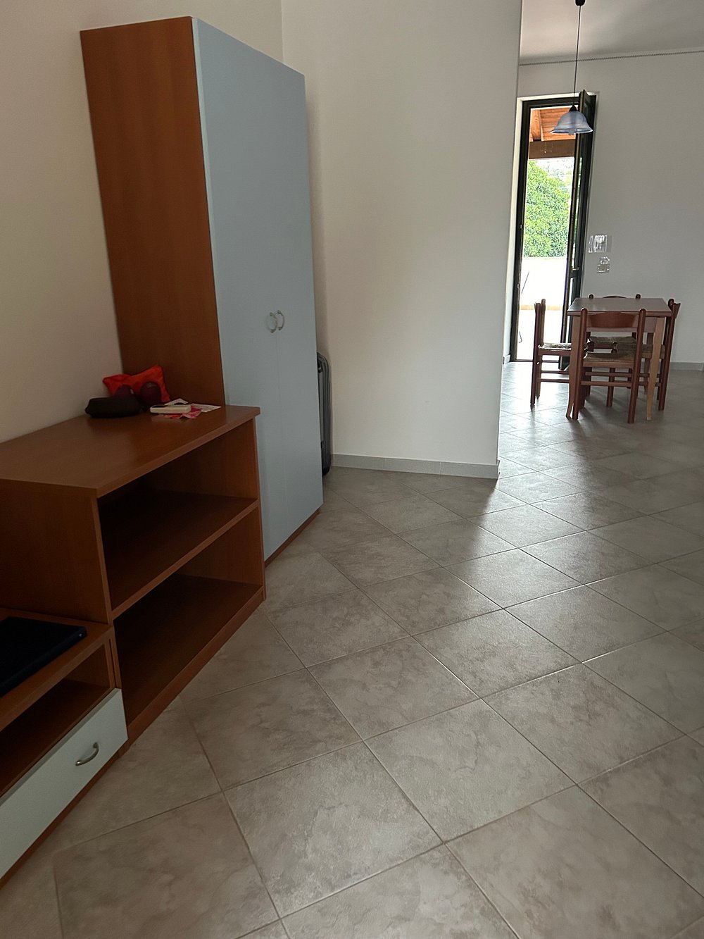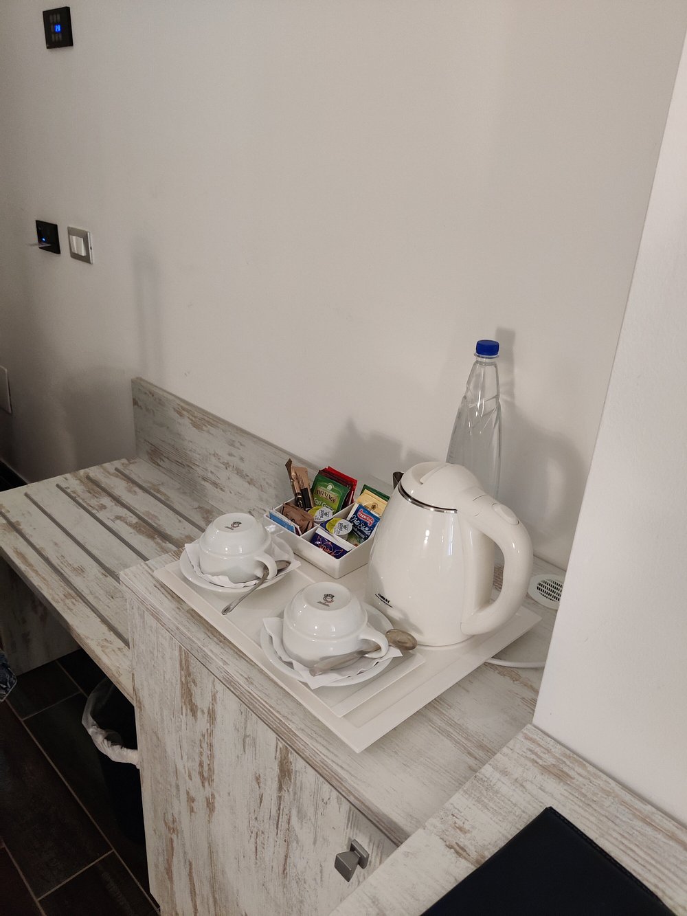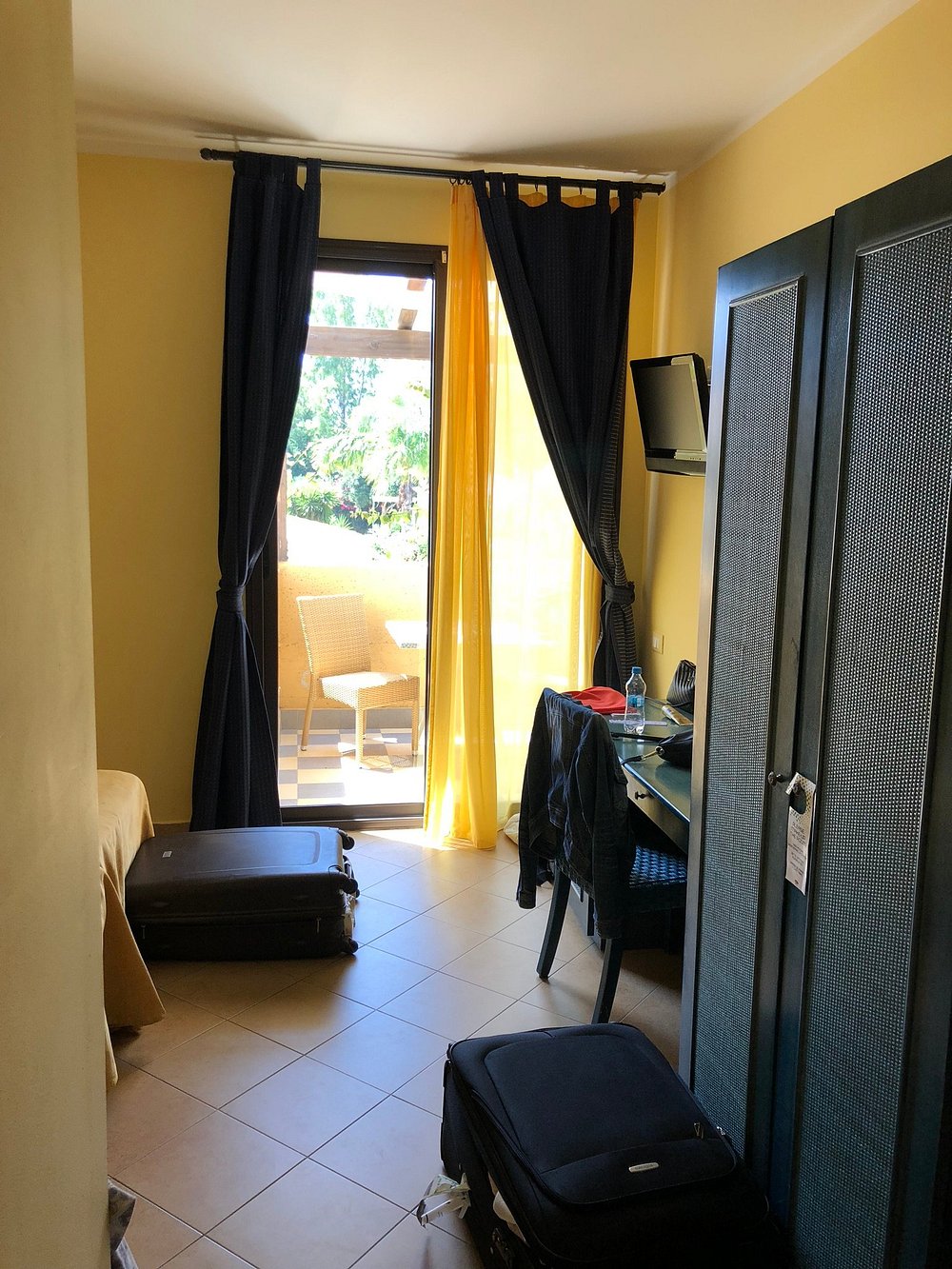 Zdjęcie pokoju hotelowego z widocznymi osobistymi rzeczami turysty, takimi jak walizki i ubrania na krześle. Wnętrze jest ciasne i nieestetyczne, co nie sprzyja marketingowi.