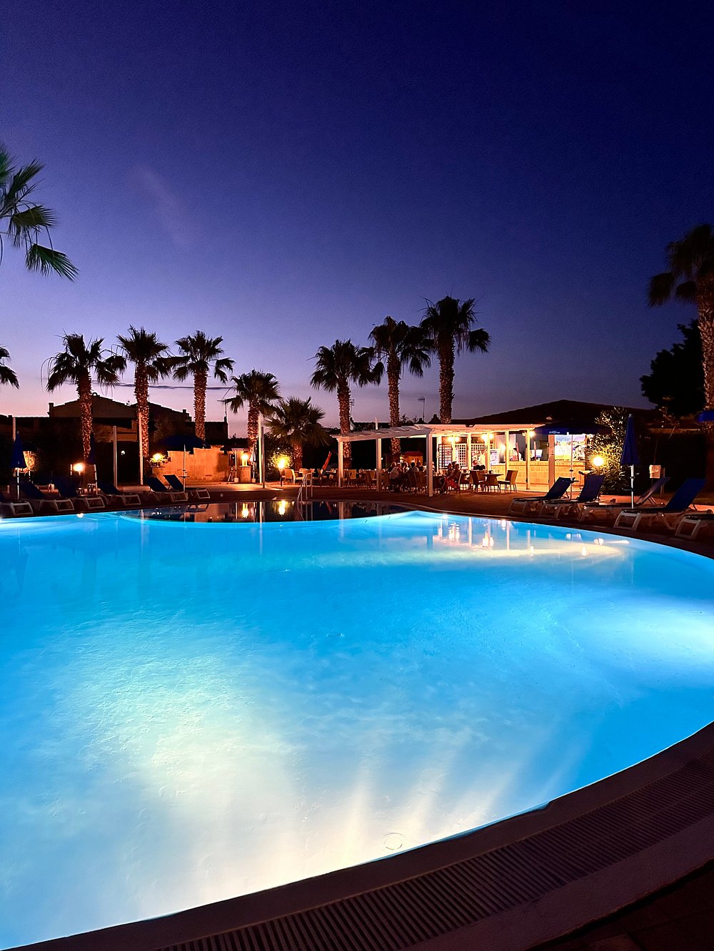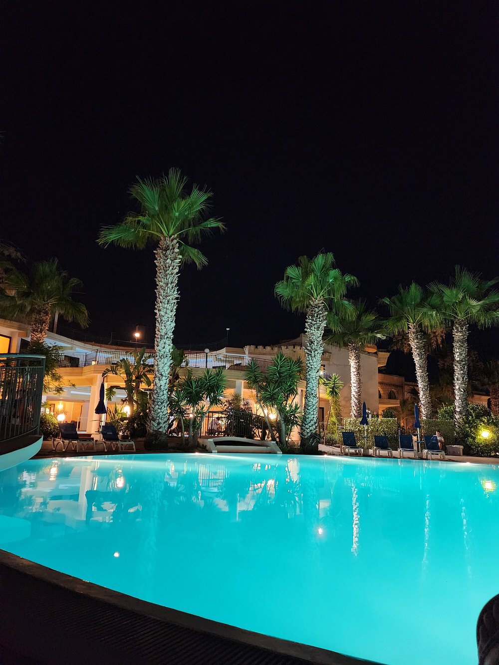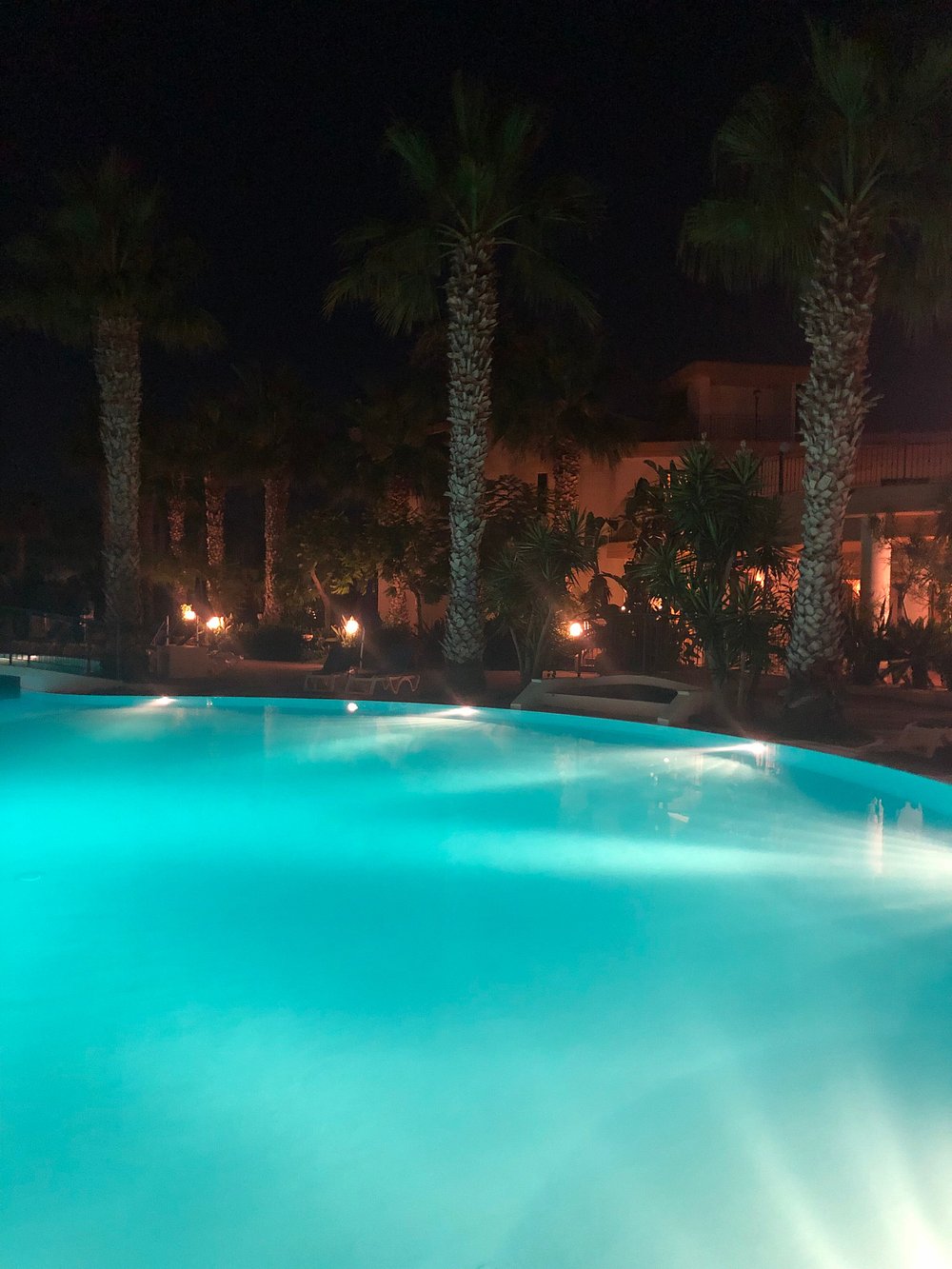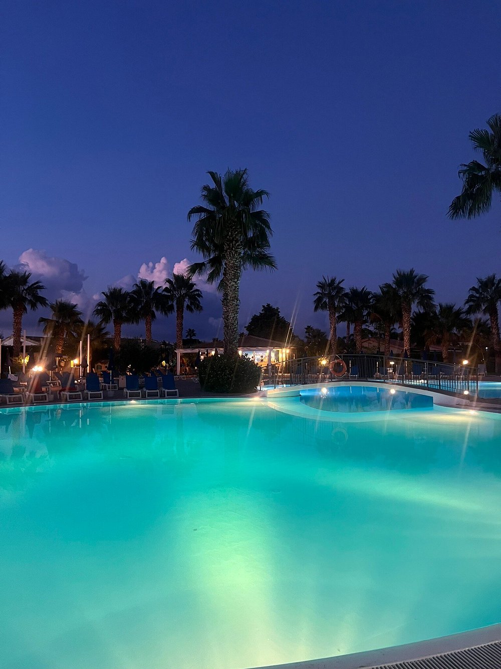 Basen hotelowy oświetlony wieczorem, otoczony palmami i leżakami, tworzy relaksującą atmosferę. W tle widoczny jest bar z delikatnym oświetleniem, co dodaje uroku nocnej scenerii.
