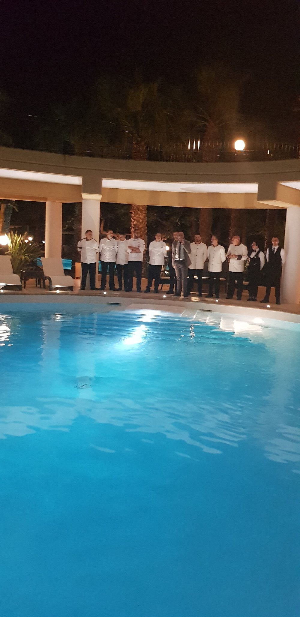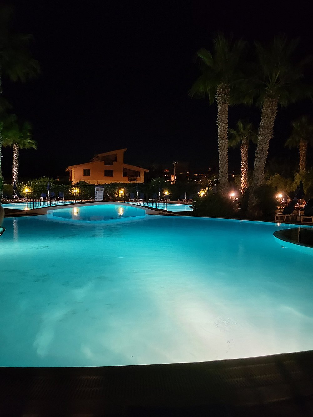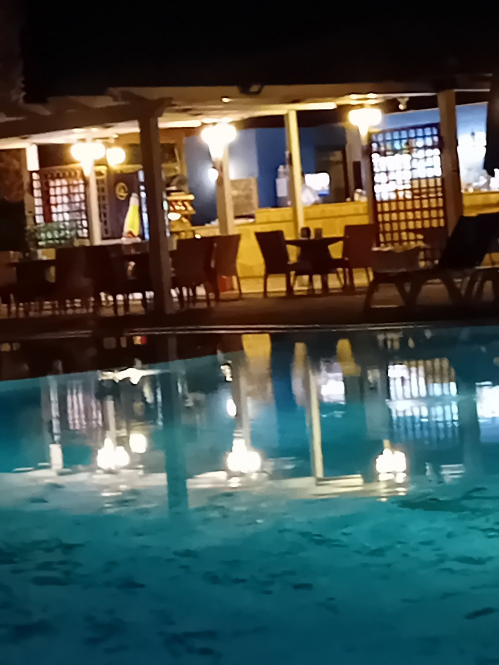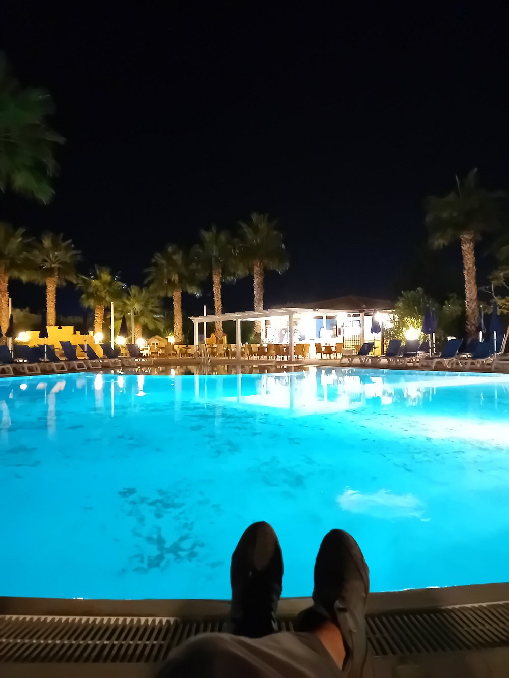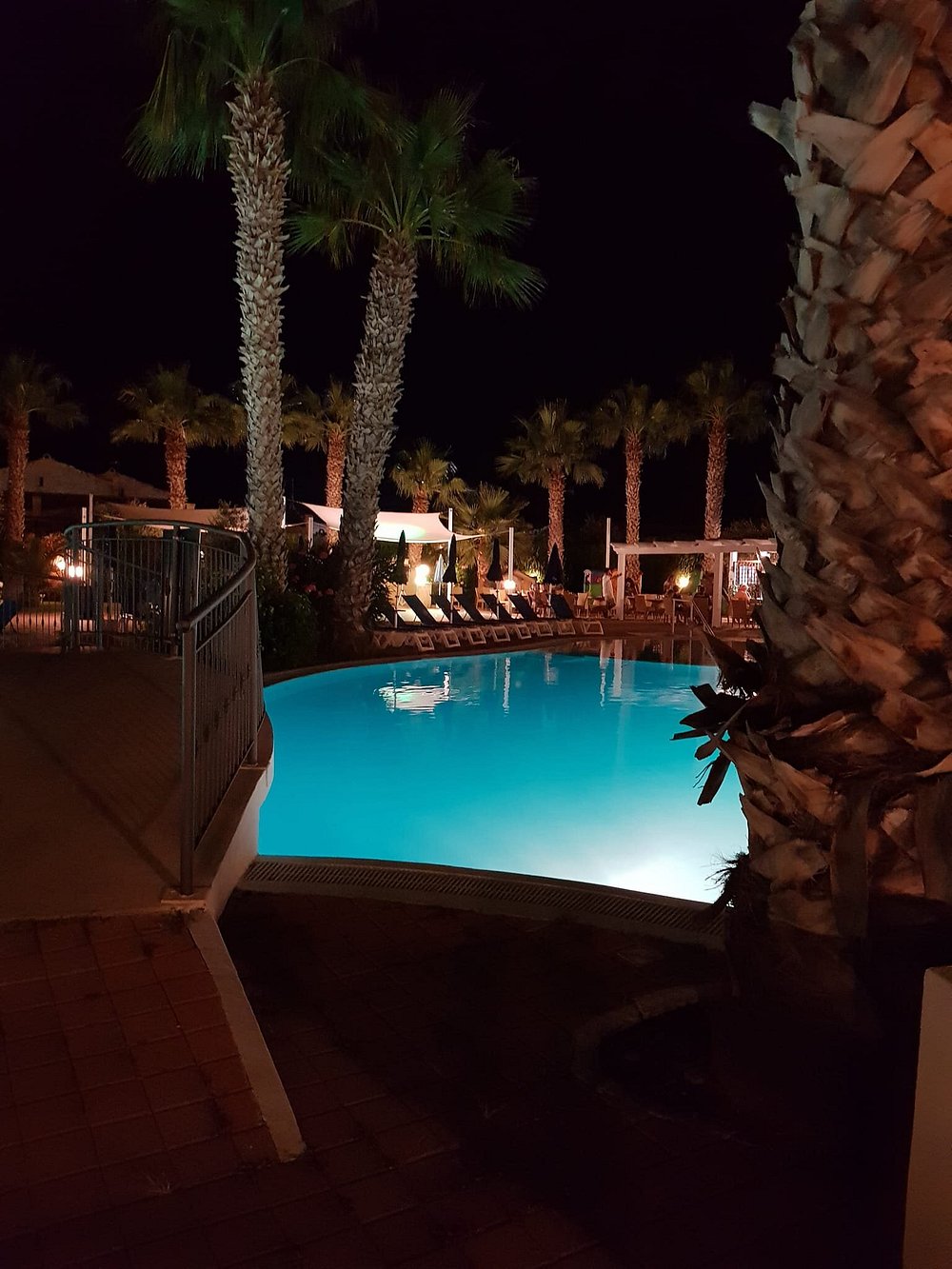 Basen hotelowy oświetlony wieczorem, otoczony palmami i leżakami, tworzy relaksującą atmosferę. W tle widoczny jest bar z delikatnym oświetleniem, co dodaje uroku nocnej scenerii.