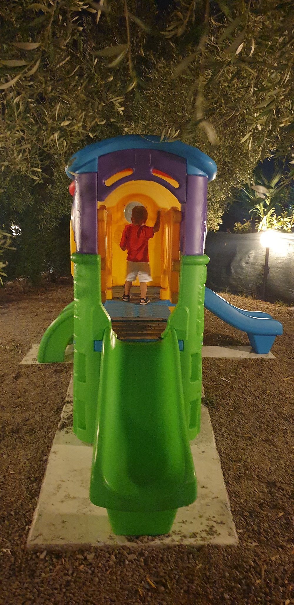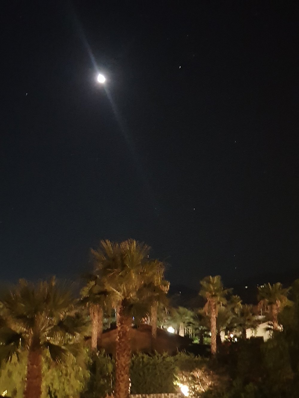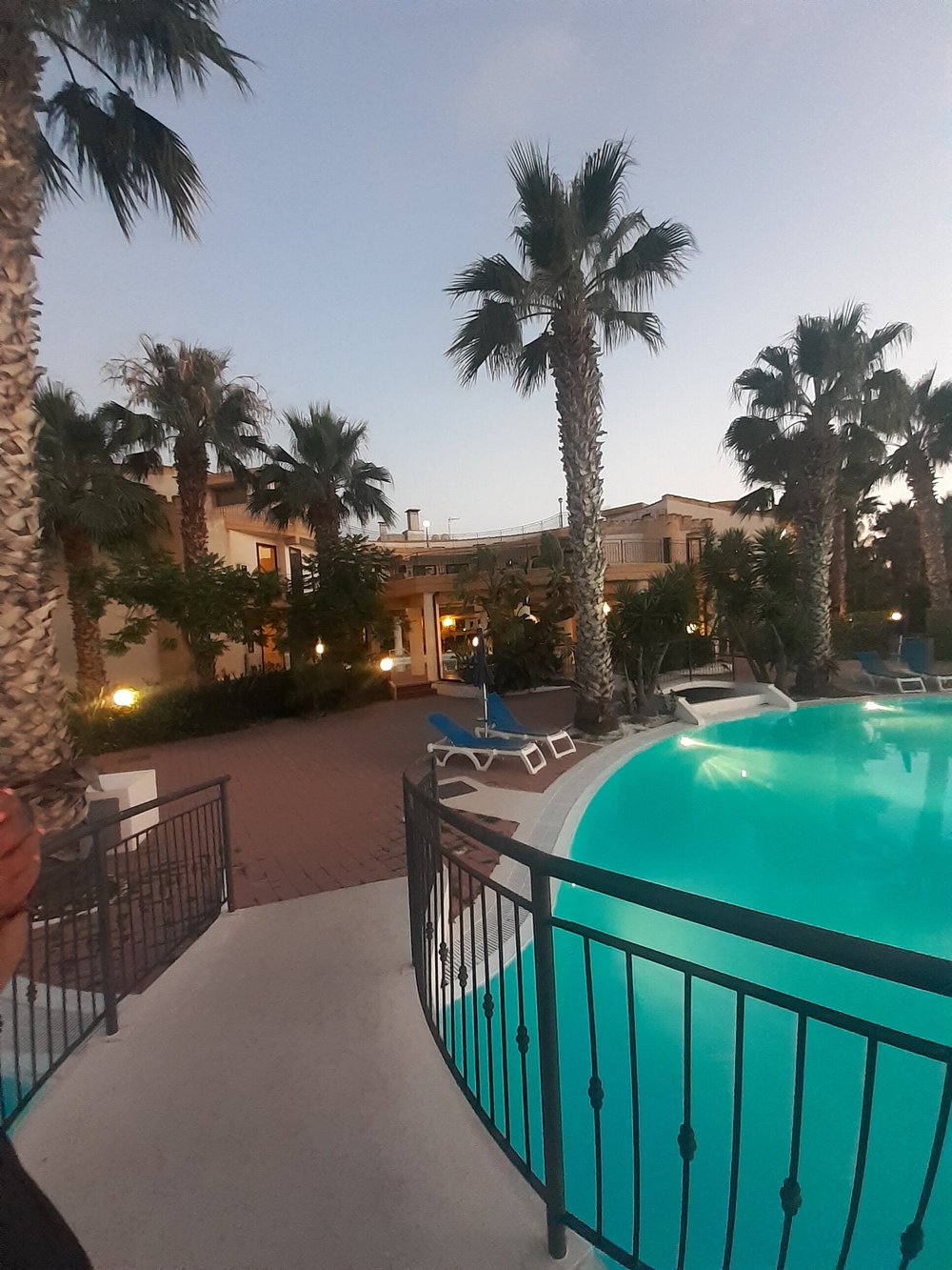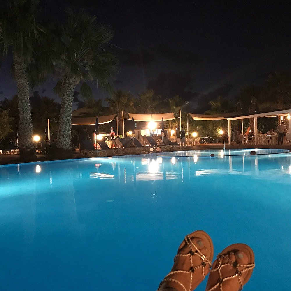Basen hotelowy oświetlony wieczorem, otoczony palmami i leżakami, tworzy relaksującą atmosferę. W tle widoczny jest bar z delikatnym oświetleniem, co dodaje uroku nocnej scenerii.