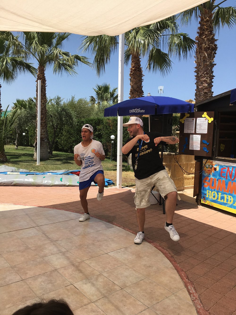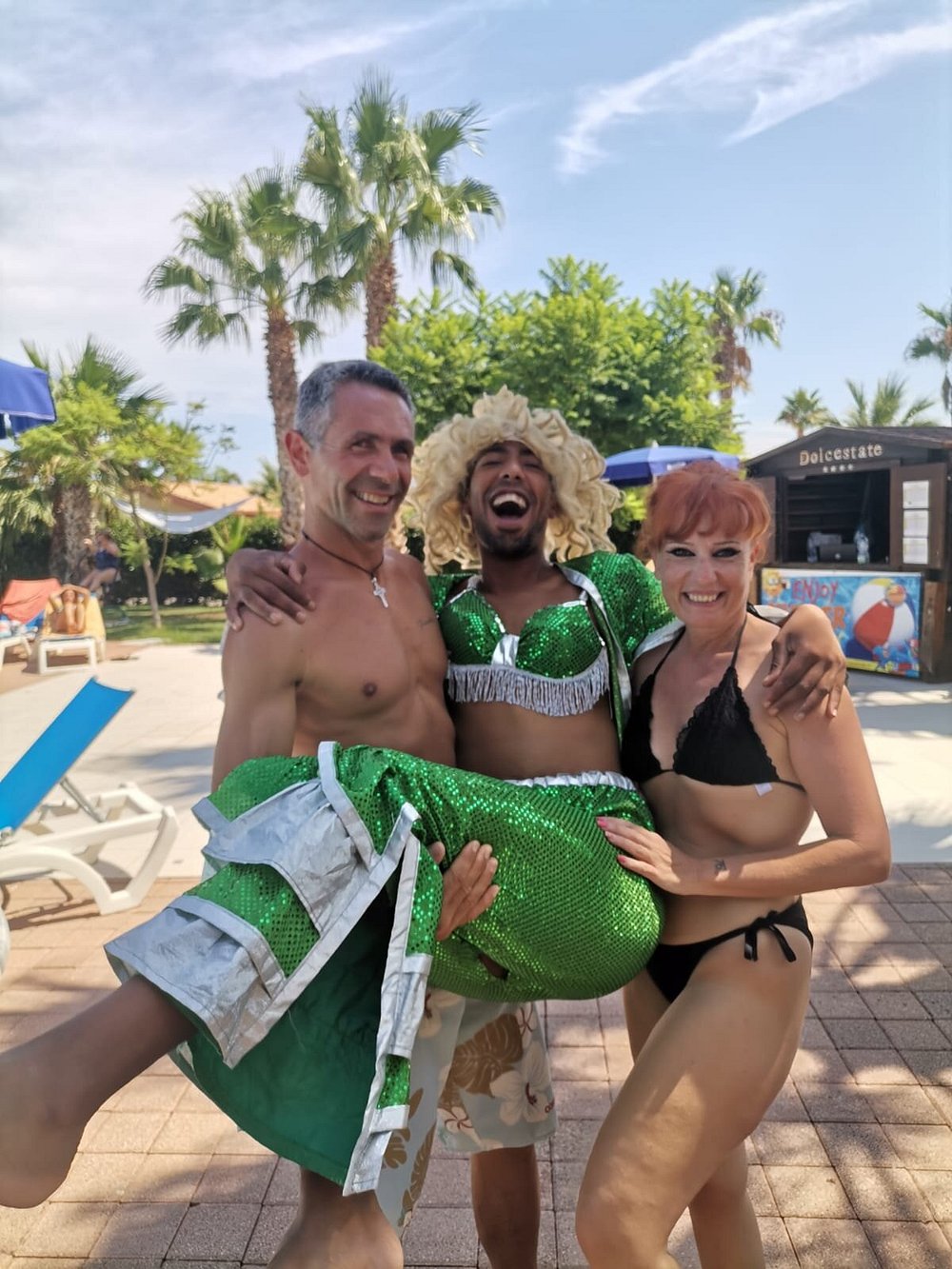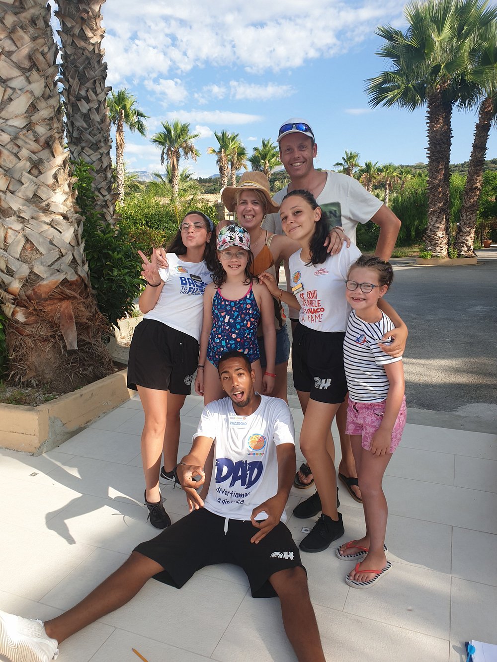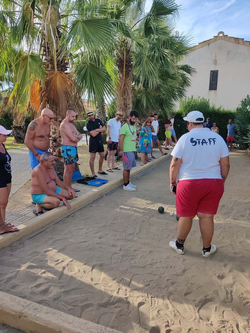 Zdjęcie grupy ludzi grających w bocce na terenie hotelu, z widocznymi palmami w tle. Osoby w strojach kąpielowych i koszulkach, jedna z napisem 'STAFF'.
