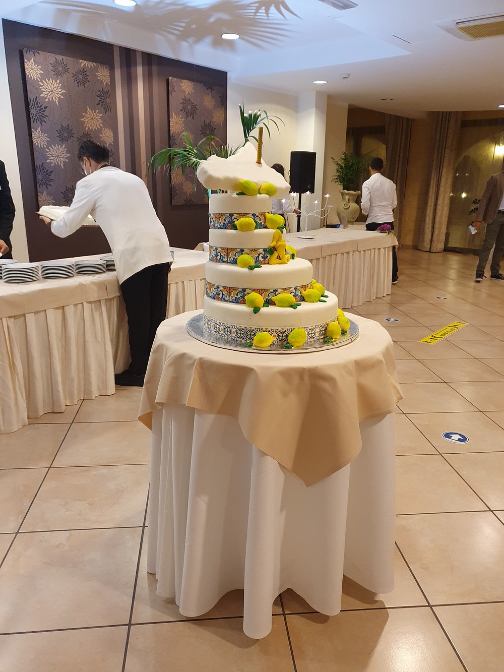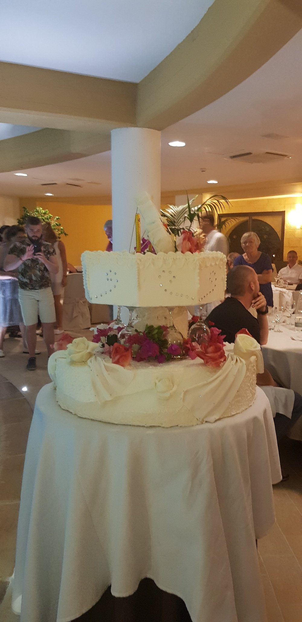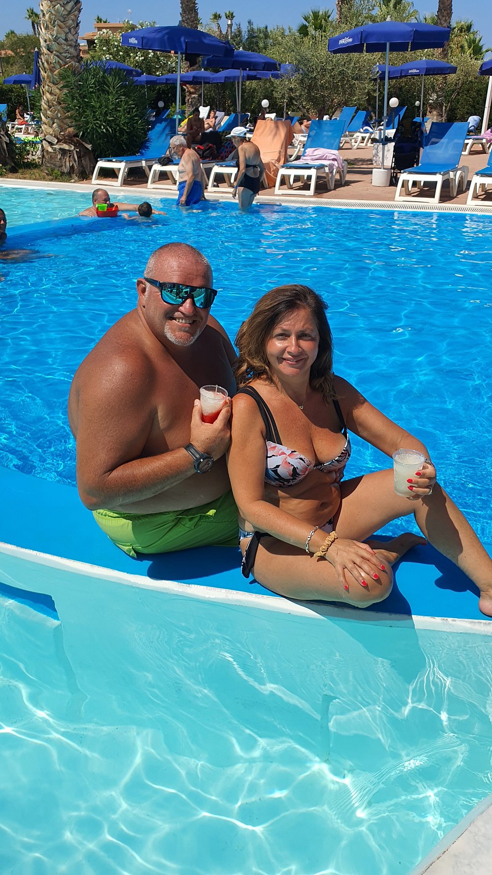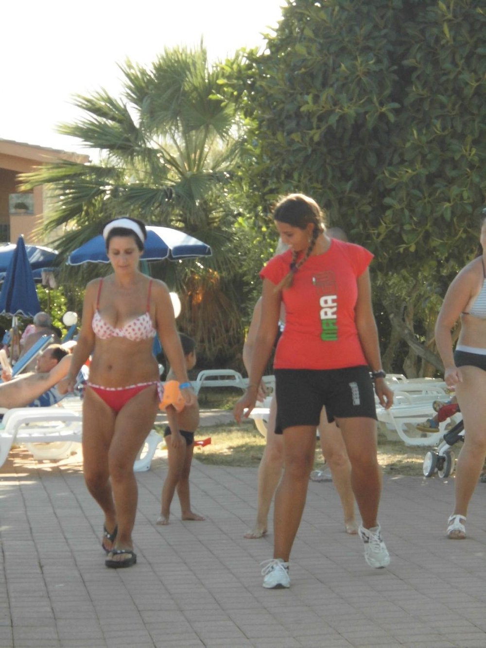 Zdjęcie grupy ludzi grających w bocce na terenie hotelu, z widocznymi palmami w tle. Osoby w strojach kąpielowych i koszulkach, jedna z napisem 'STAFF'.