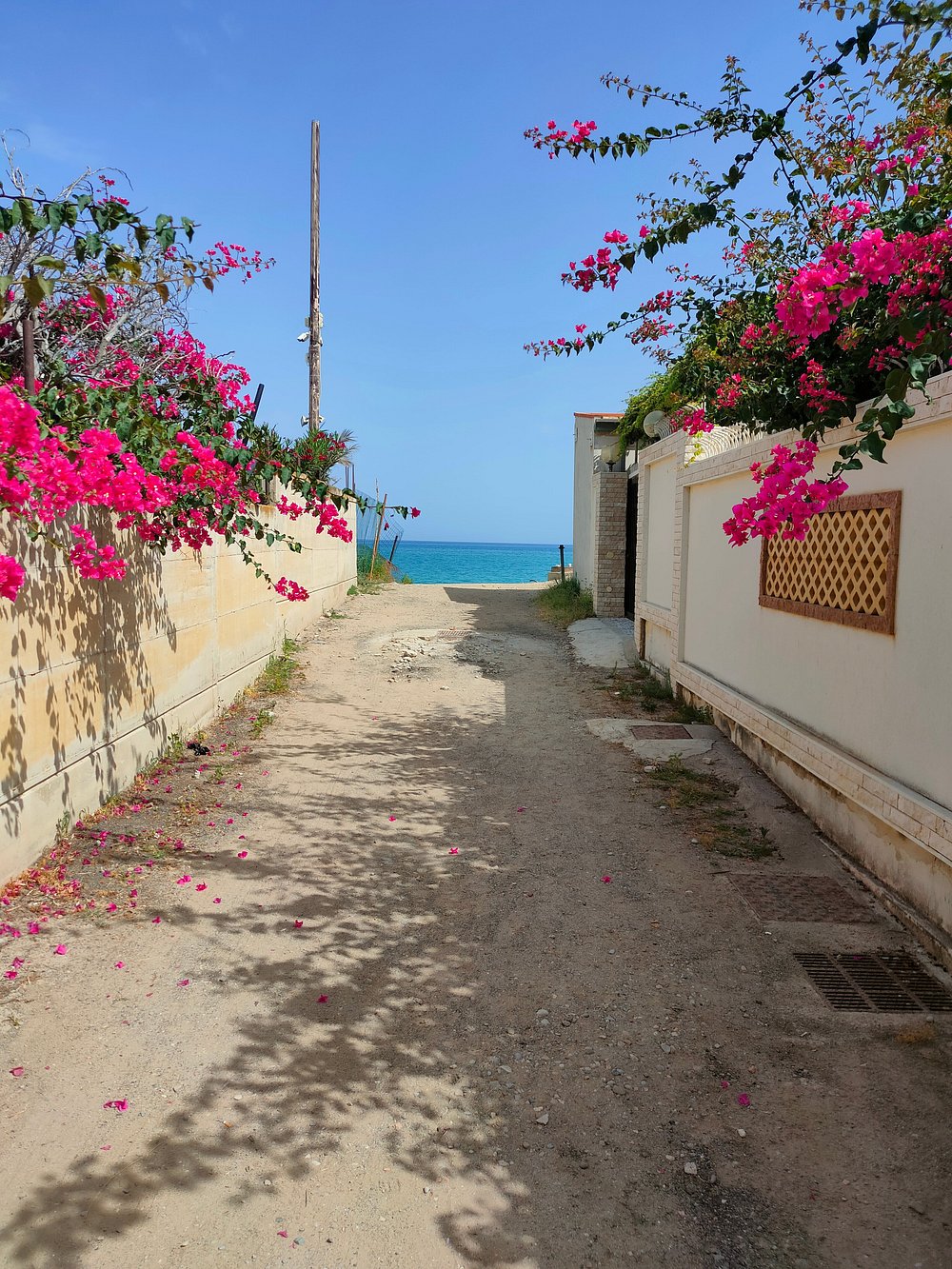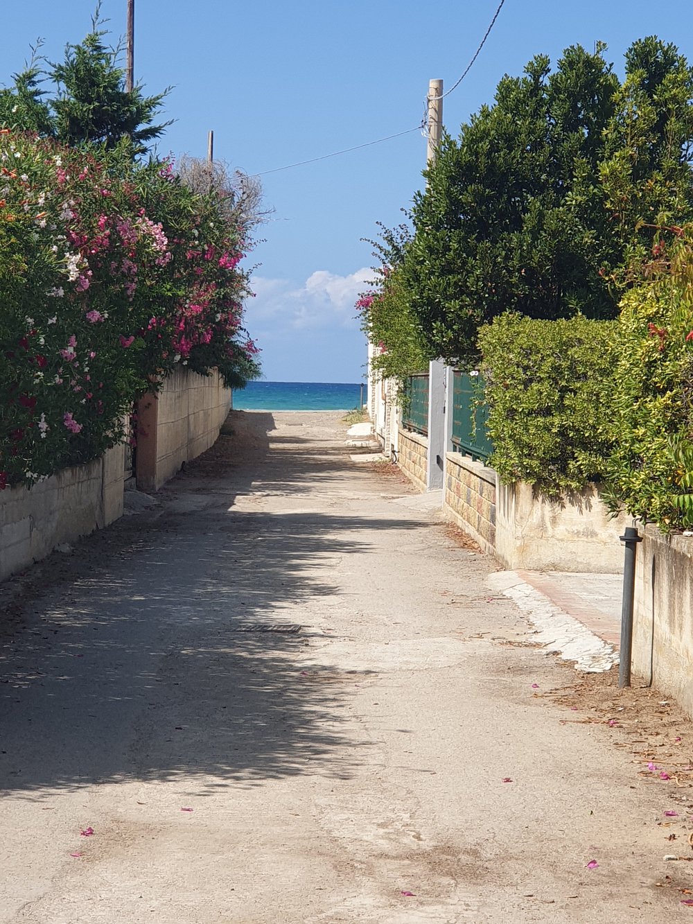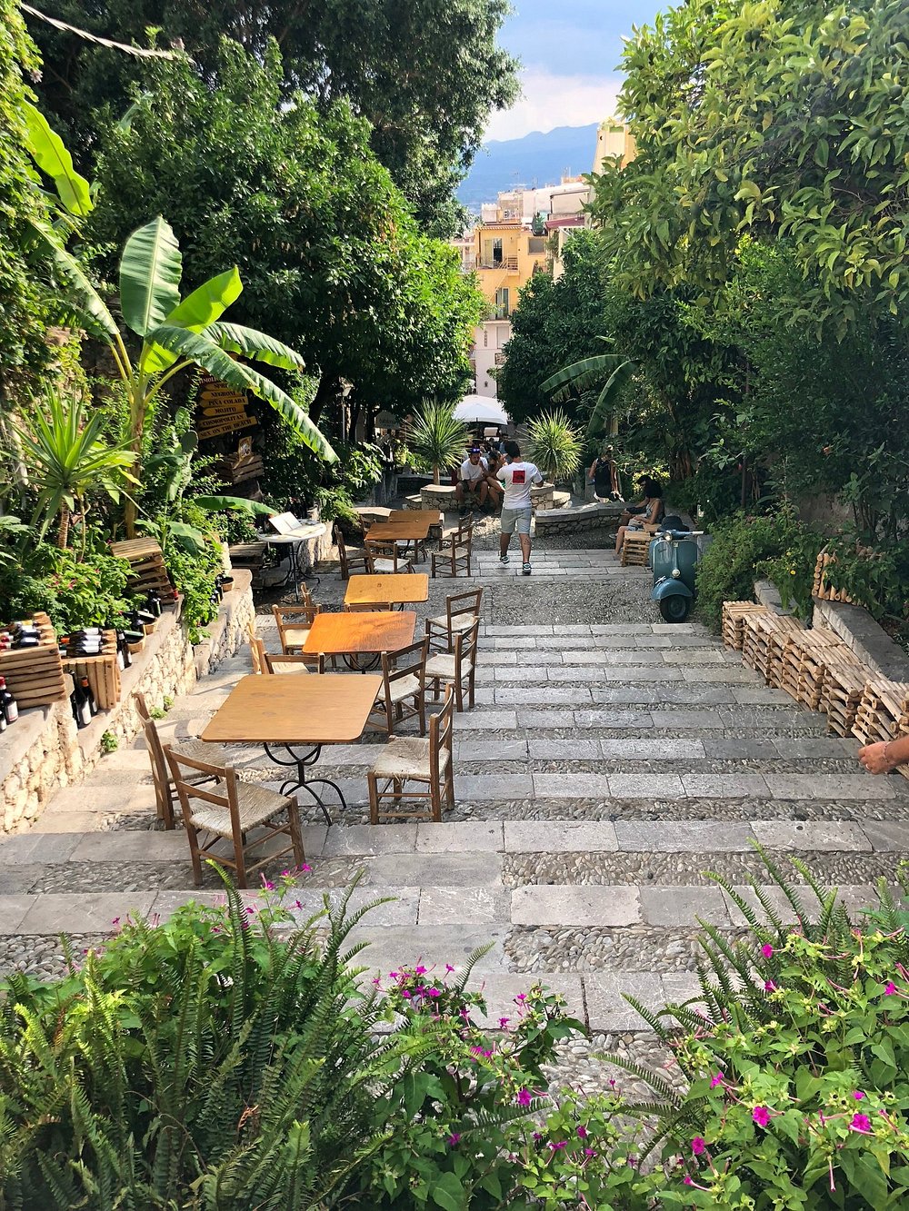 Urokliwa alejka z kamiennymi schodami otoczona bujną zielenią i kwiatami, prowadząca do malowniczej części miasteczka. Drewniane stoły i krzesła ustawione wzdłuż ścieżki tworzą przytulną atmosferę.