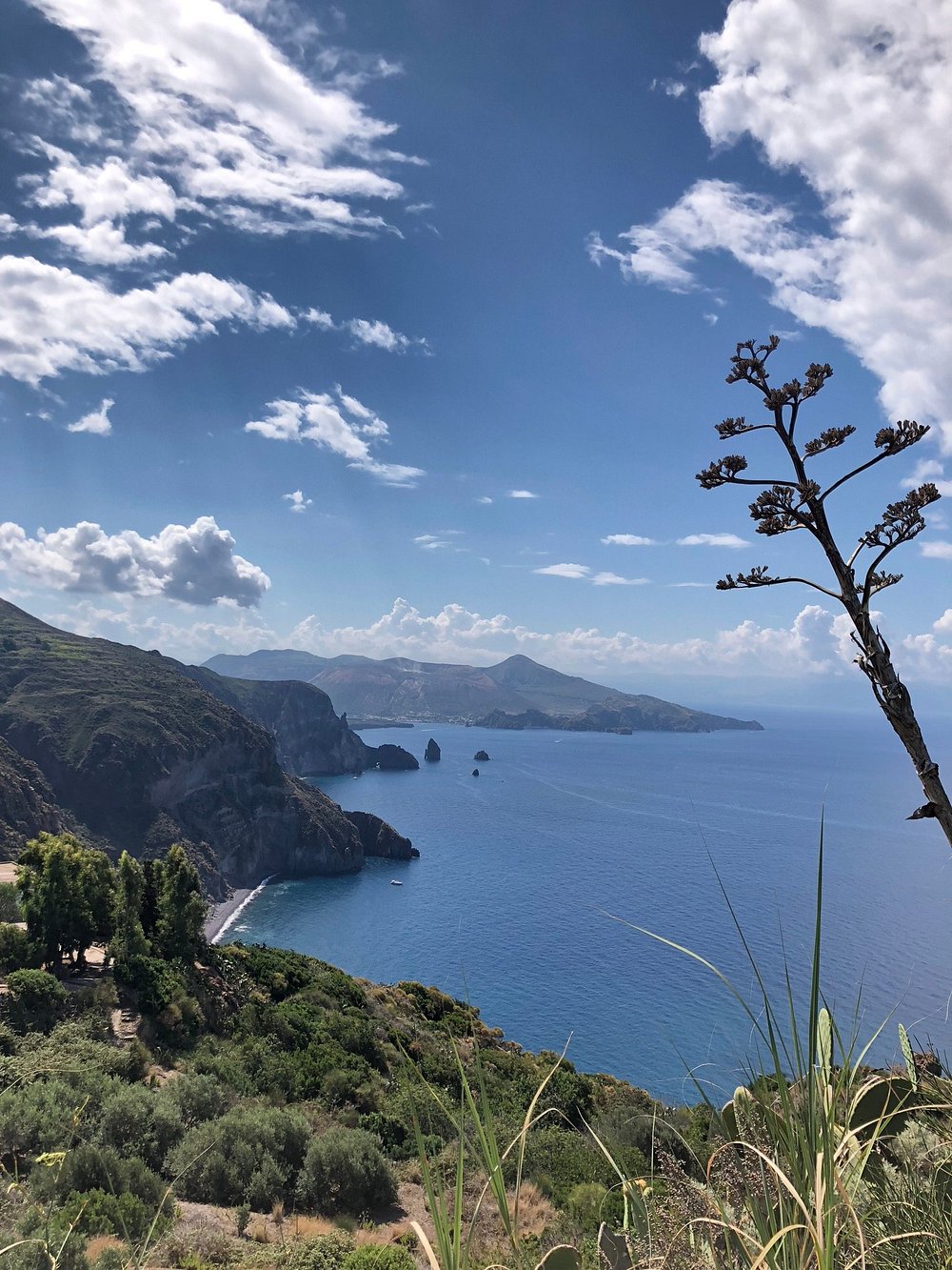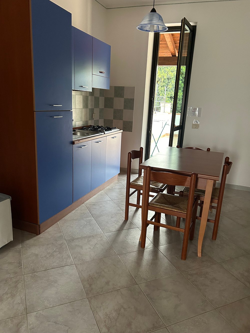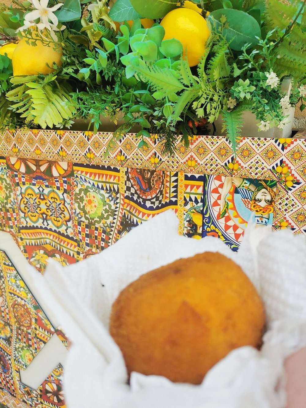 Urokliwa alejka z kamiennymi schodami otoczona bujną zielenią i kwiatami, prowadząca do malowniczej części miasteczka. Drewniane stoły i krzesła ustawione wzdłuż ścieżki tworzą przytulną atmosferę.