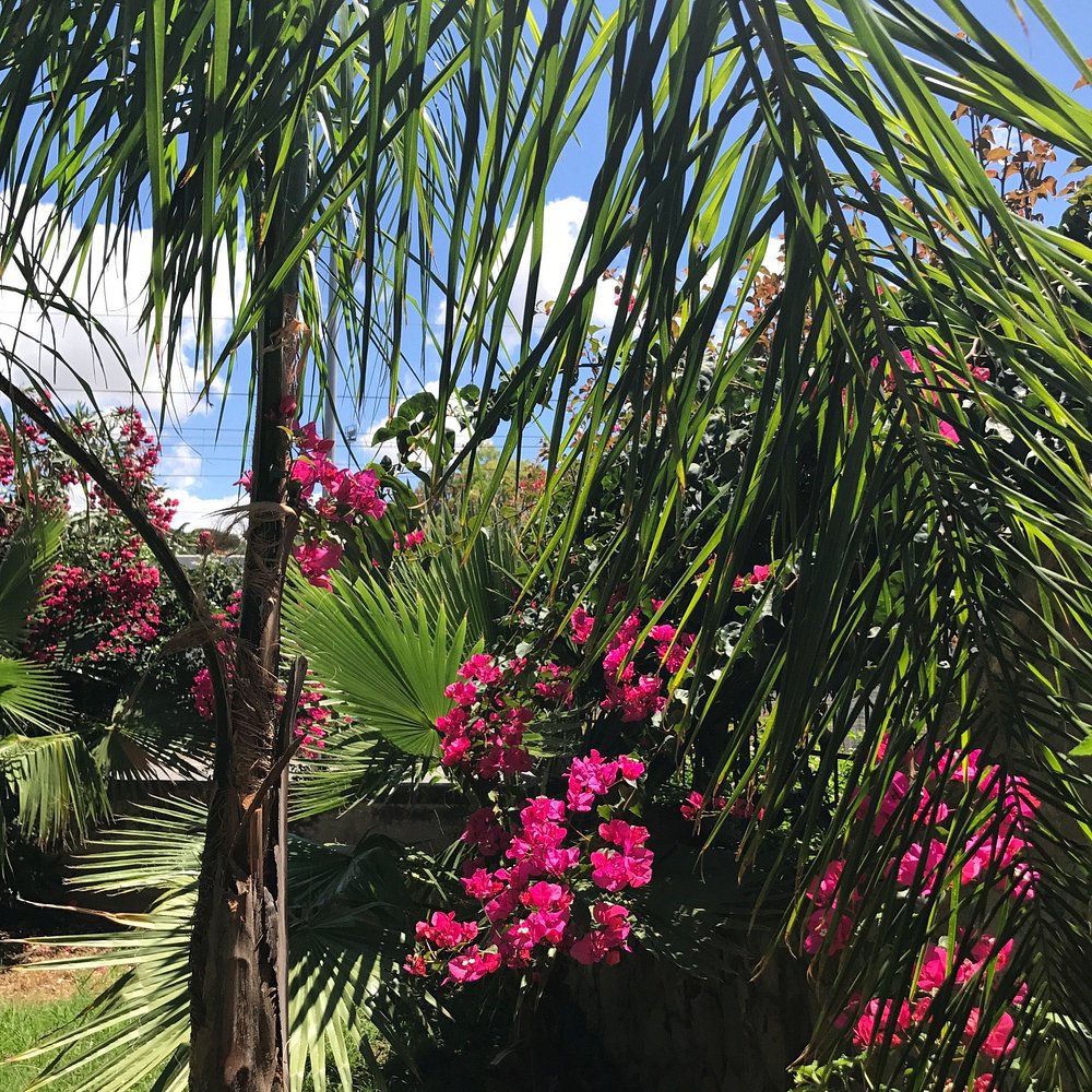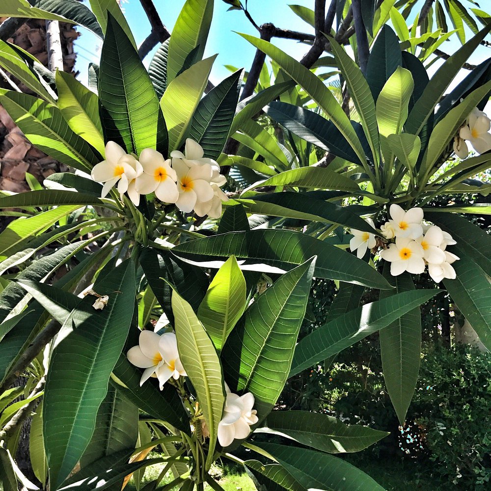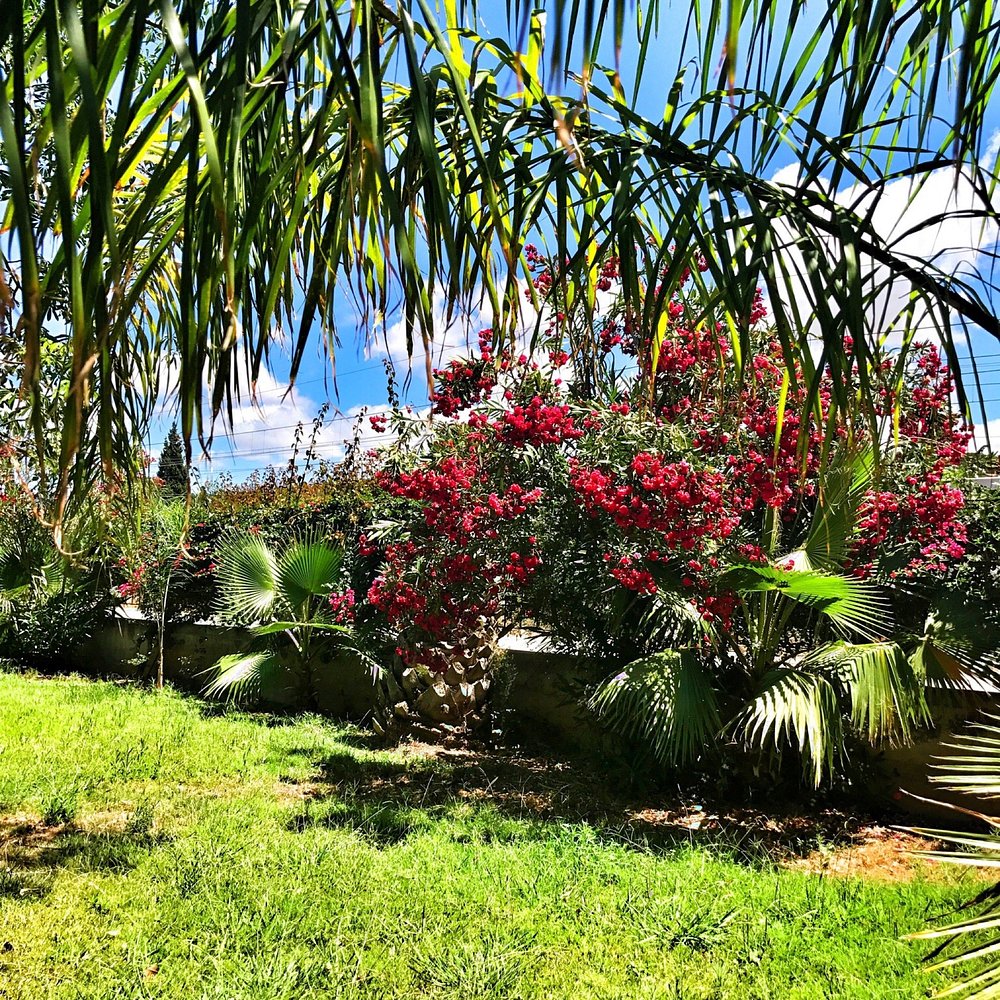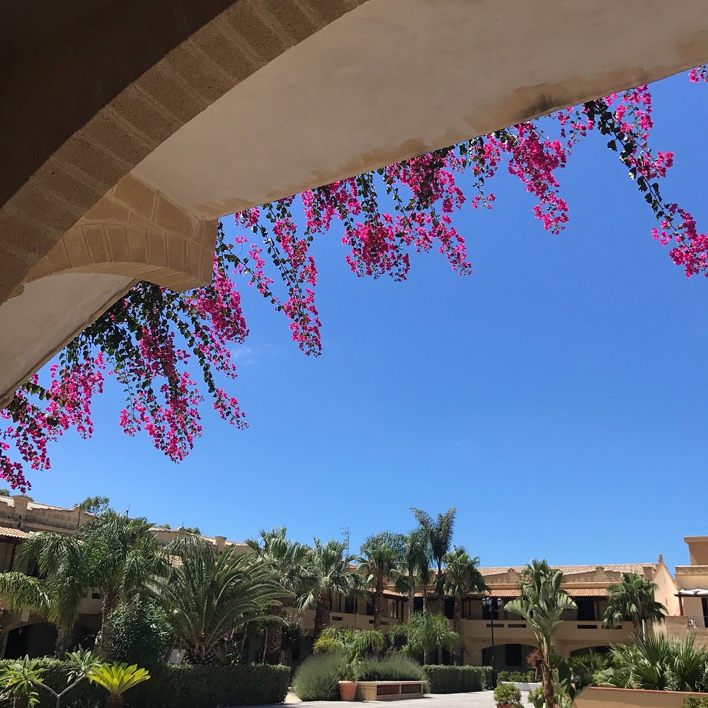 Urokliwy widok na dziedziniec hotelowy z bujną roślinnością i kwitnącymi kwiatami na tle błękitnego nieba. Architektura hotelu w stylu śródziemnomorskim dodaje elegancji.