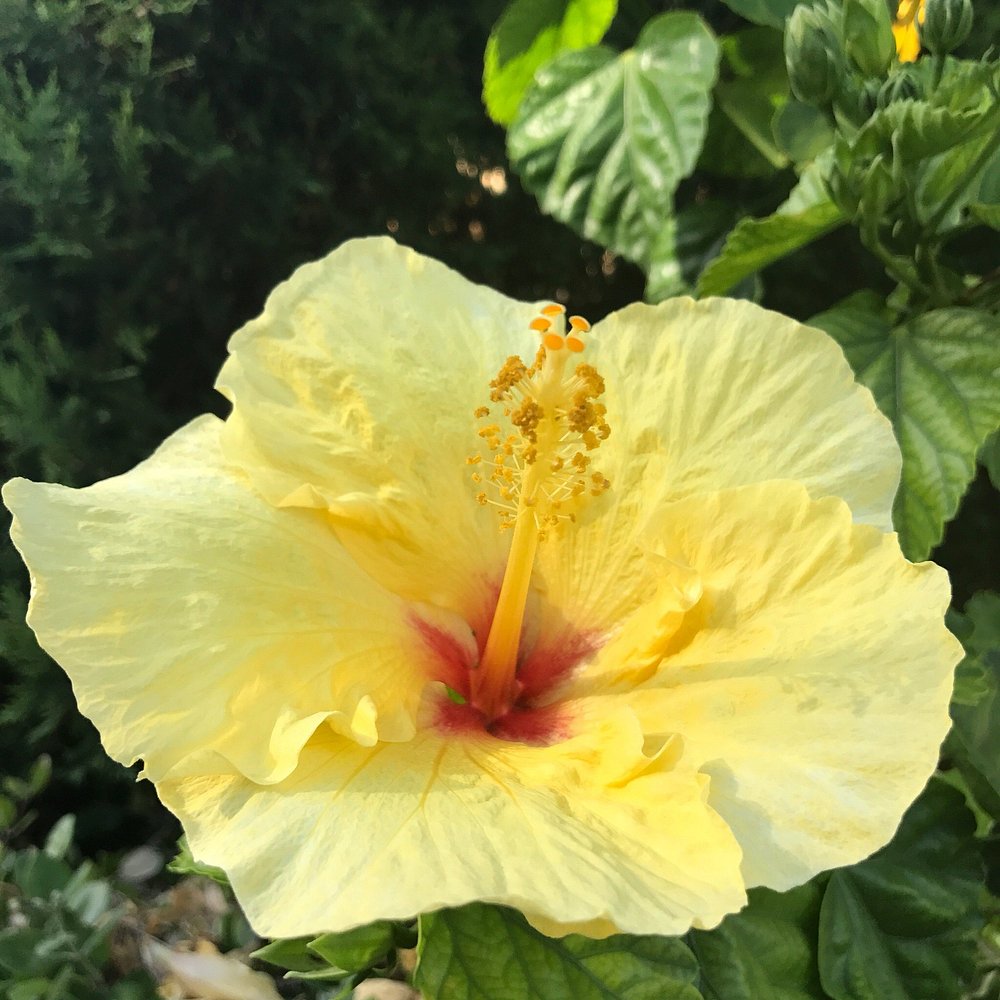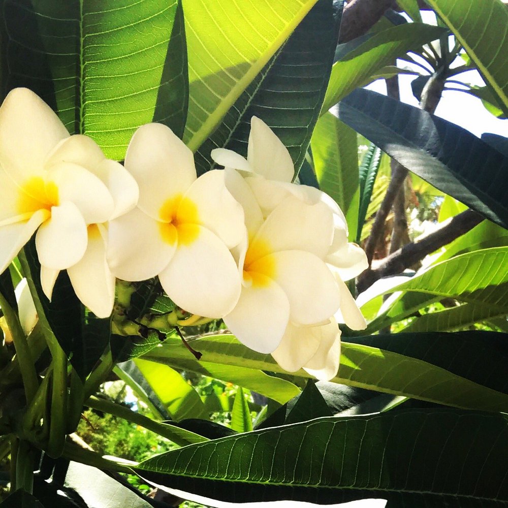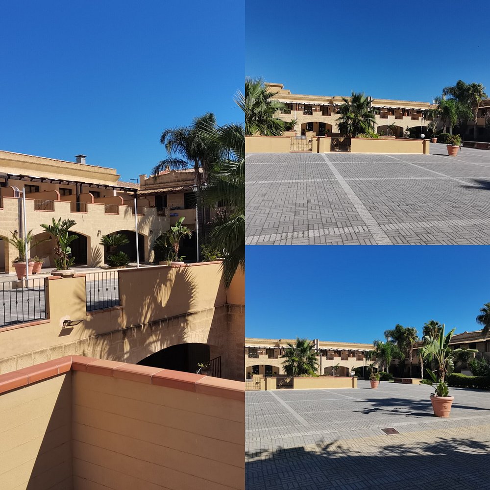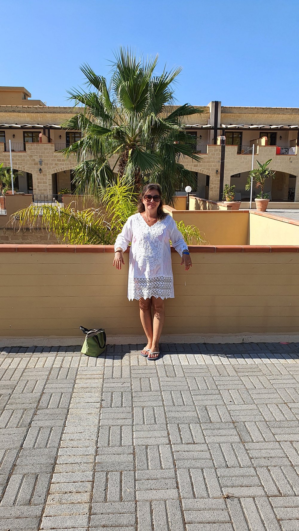 Urokliwy widok na dziedziniec hotelowy z bujną roślinnością i kwitnącymi kwiatami na tle błękitnego nieba. Architektura hotelu w stylu śródziemnomorskim dodaje elegancji.