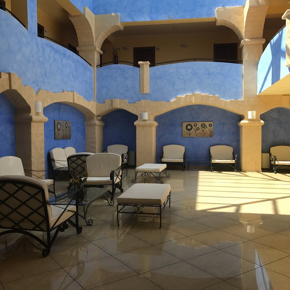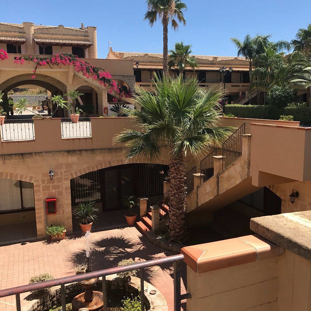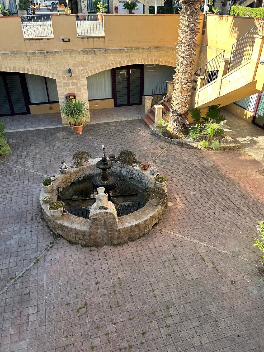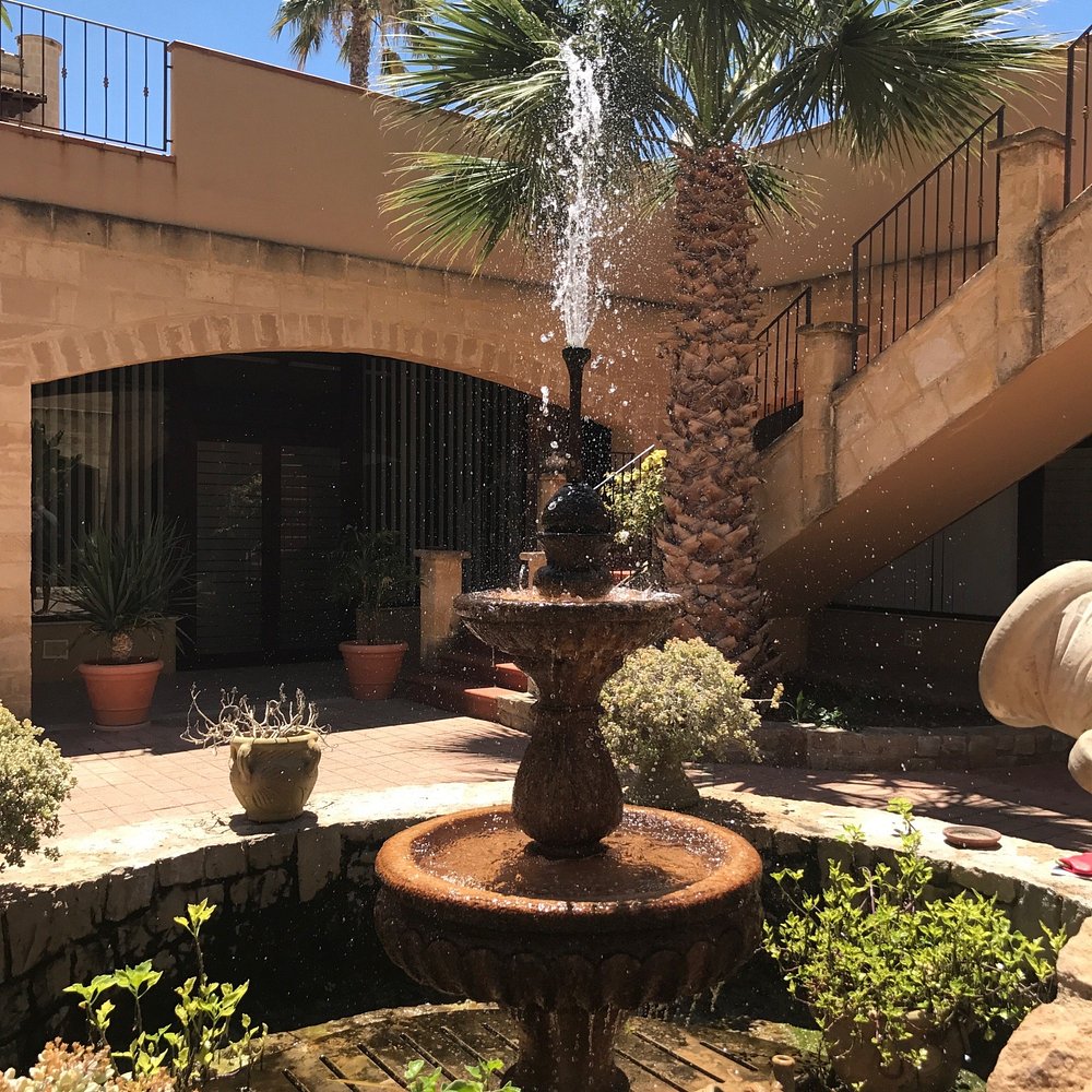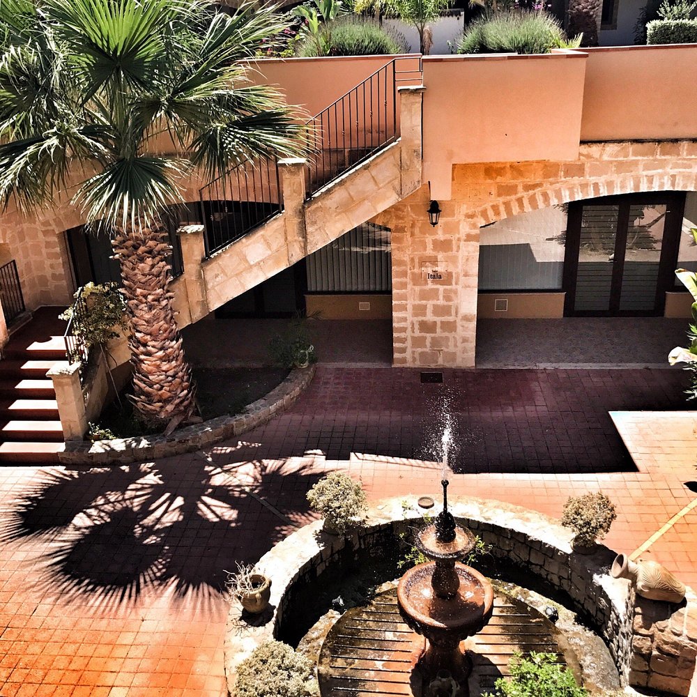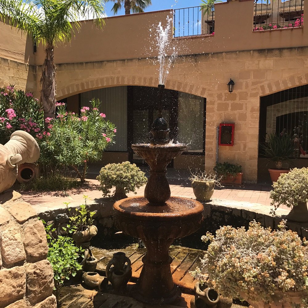 Dziedziniec hotelu z fontanną i palmami, otoczony architekturą w stylu śródziemnomorskim. Jasne kolory budynku i zieleń roślinności tworzą przyjemną atmosferę.