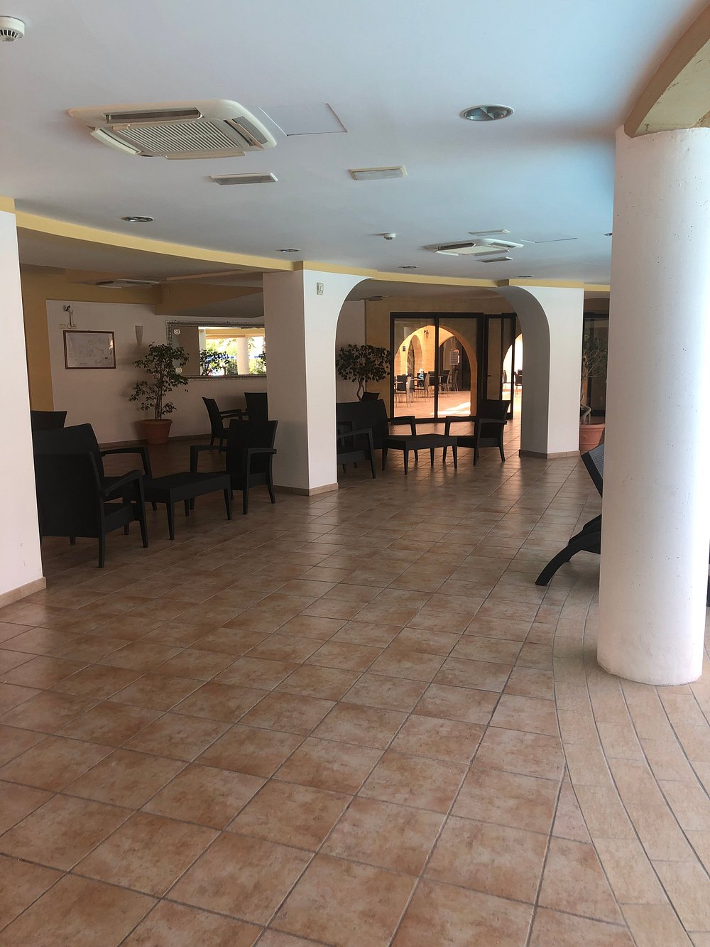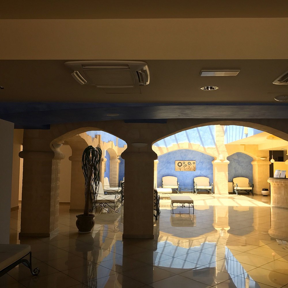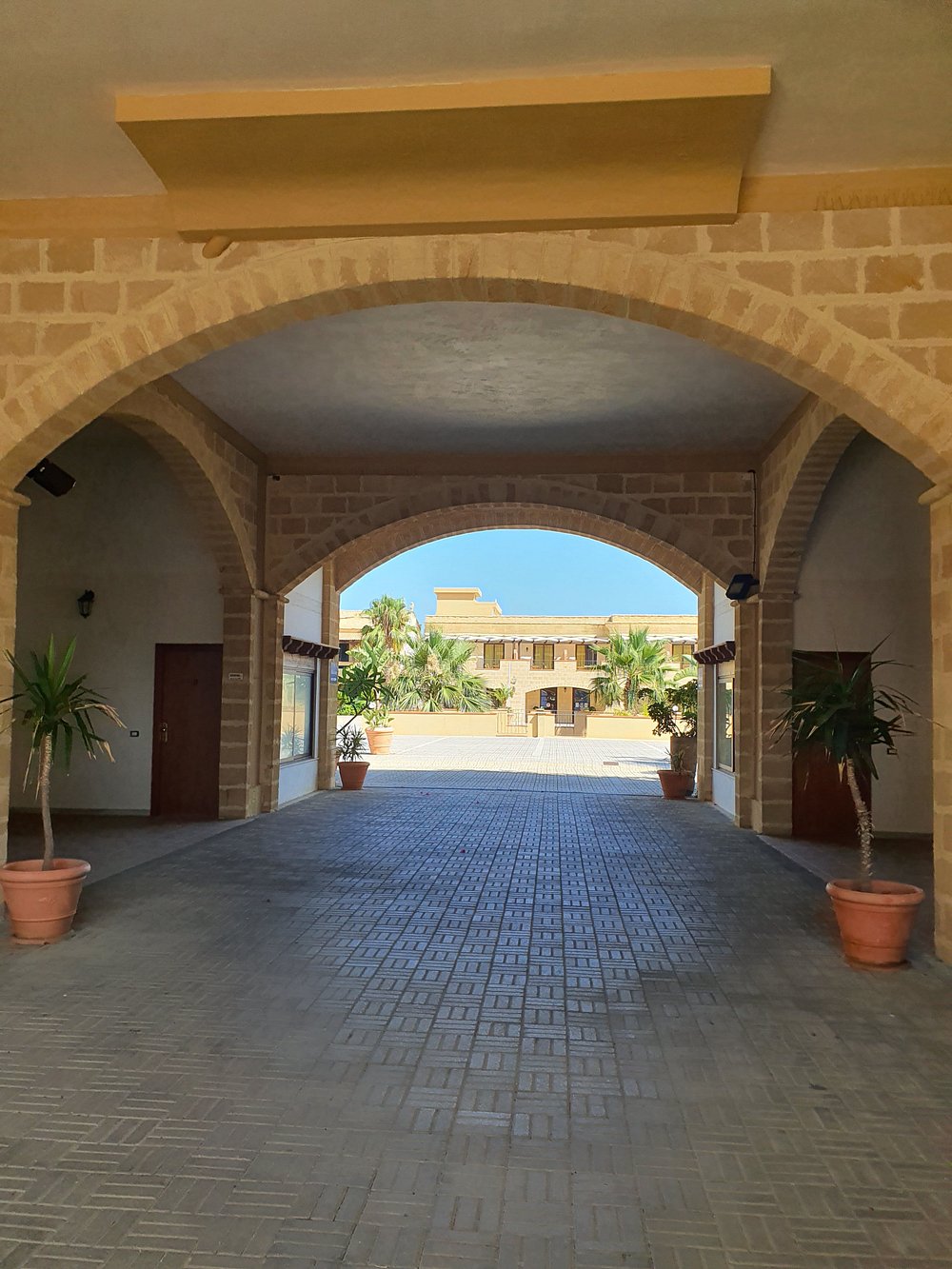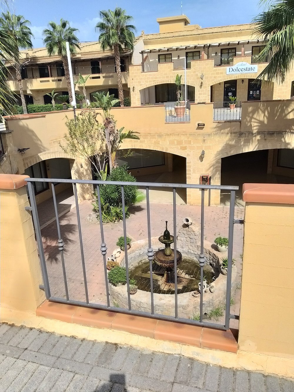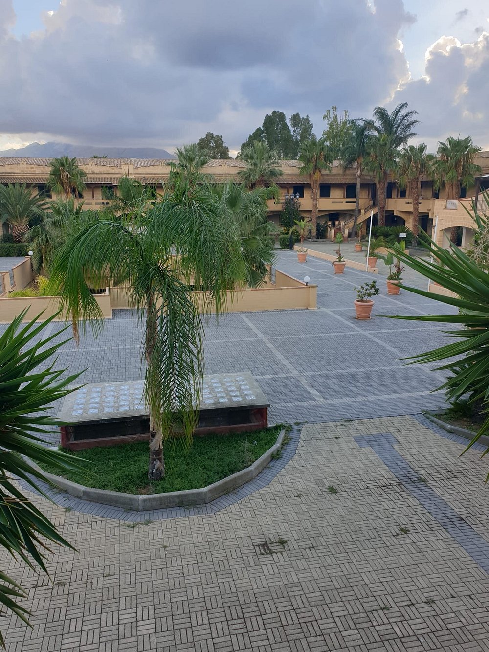 Dziedziniec hotelu z fontanną i palmami, otoczony architekturą w stylu śródziemnomorskim. Jasne kolory budynku i zieleń roślinności tworzą przyjemną atmosferę.