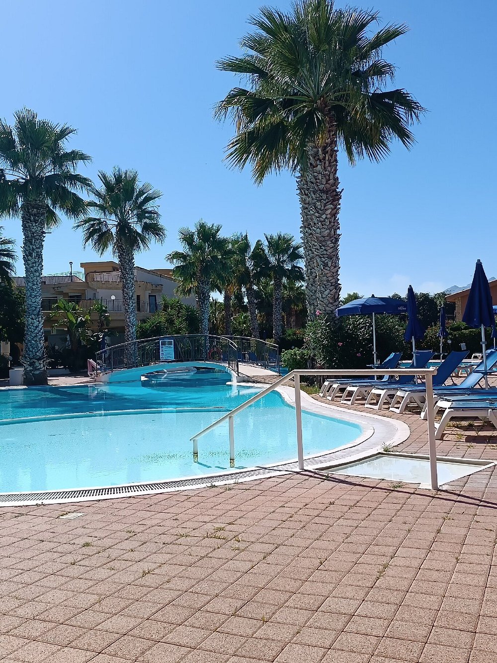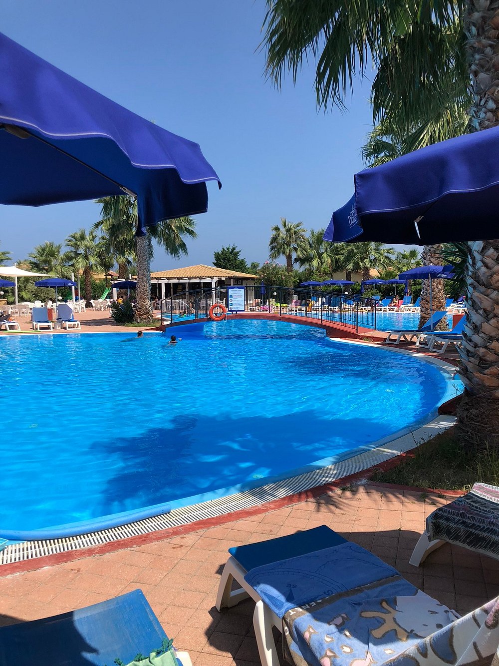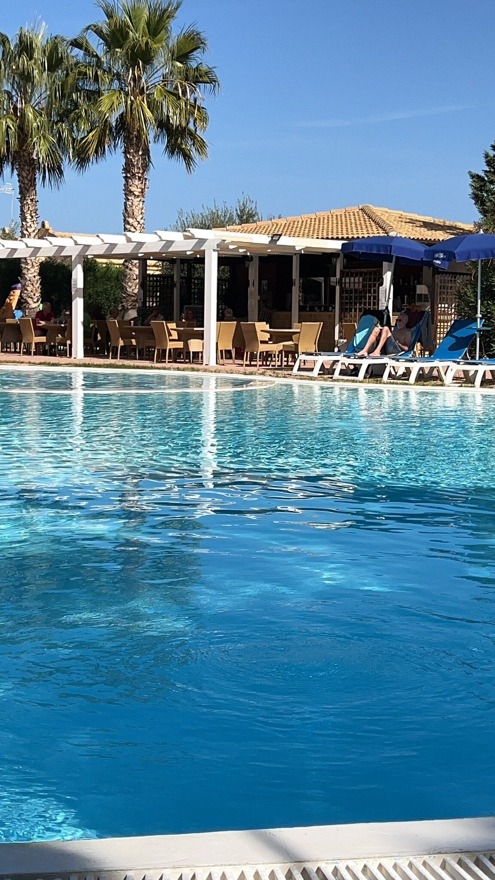 Basen otoczony palmami z leżakami i parasolami, w słoneczny dzień z błękitnym niebem. Goście korzystają z basenu, co dodaje zdjęciu życia i atrakcyjności.