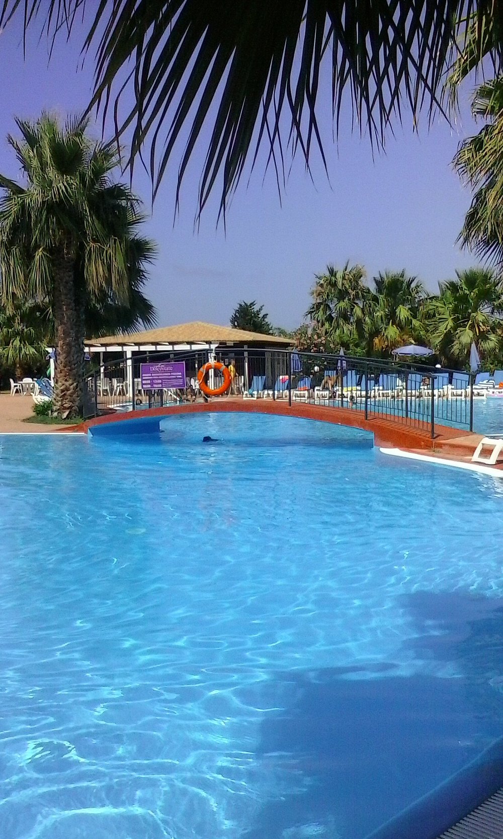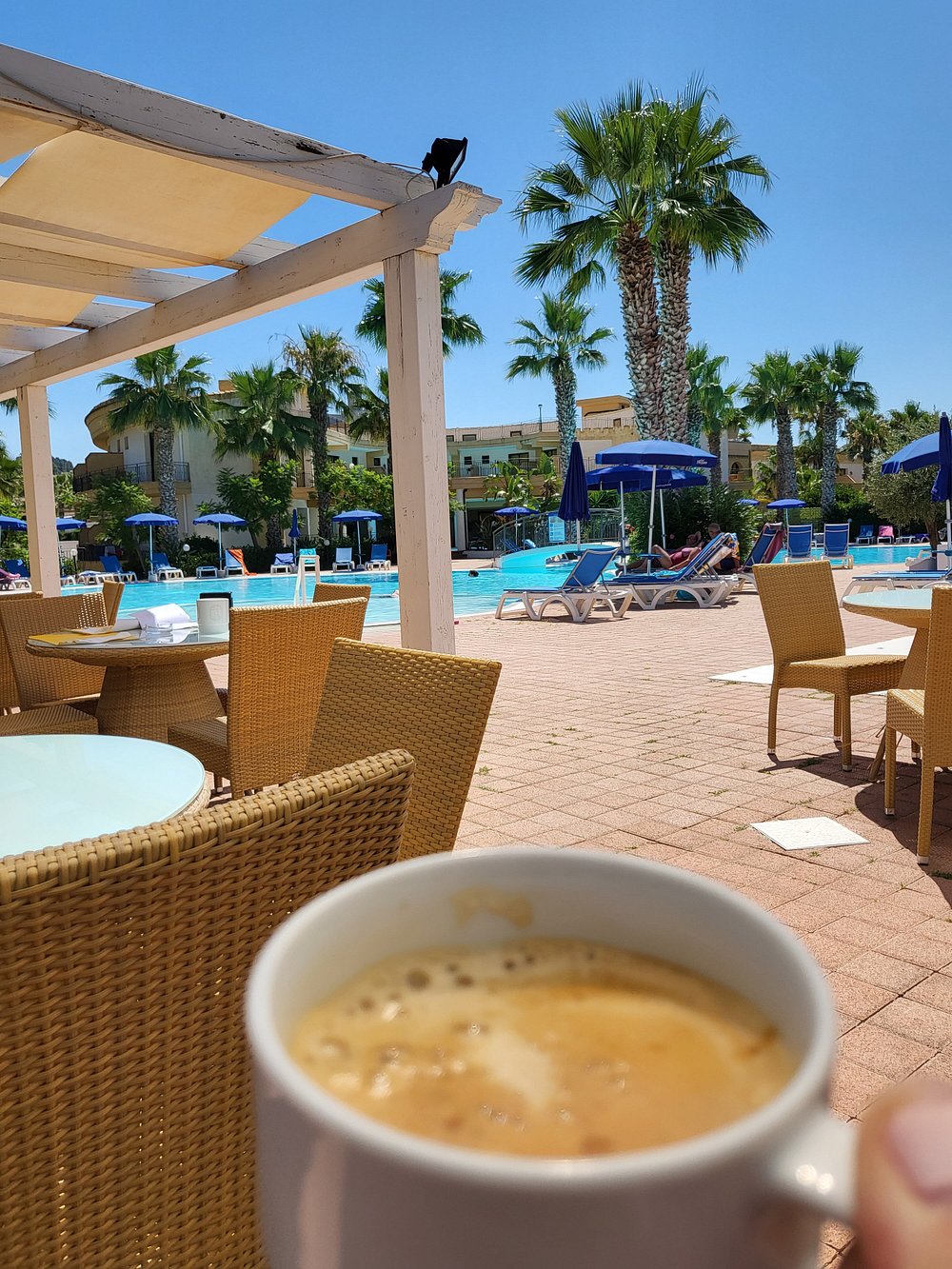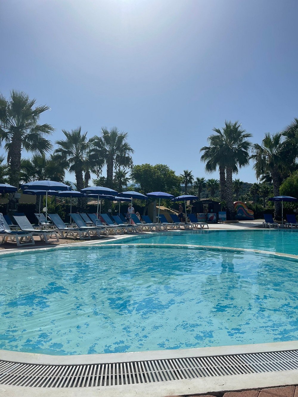 Basen otoczony palmami z leżakami i parasolami, w słoneczny dzień z błękitnym niebem. Goście korzystają z basenu, co dodaje zdjęciu życia i atrakcyjności.