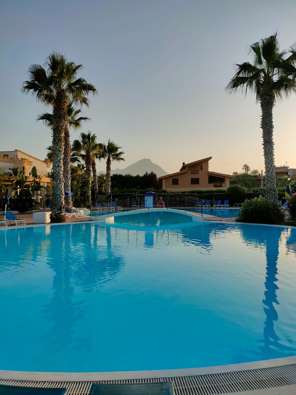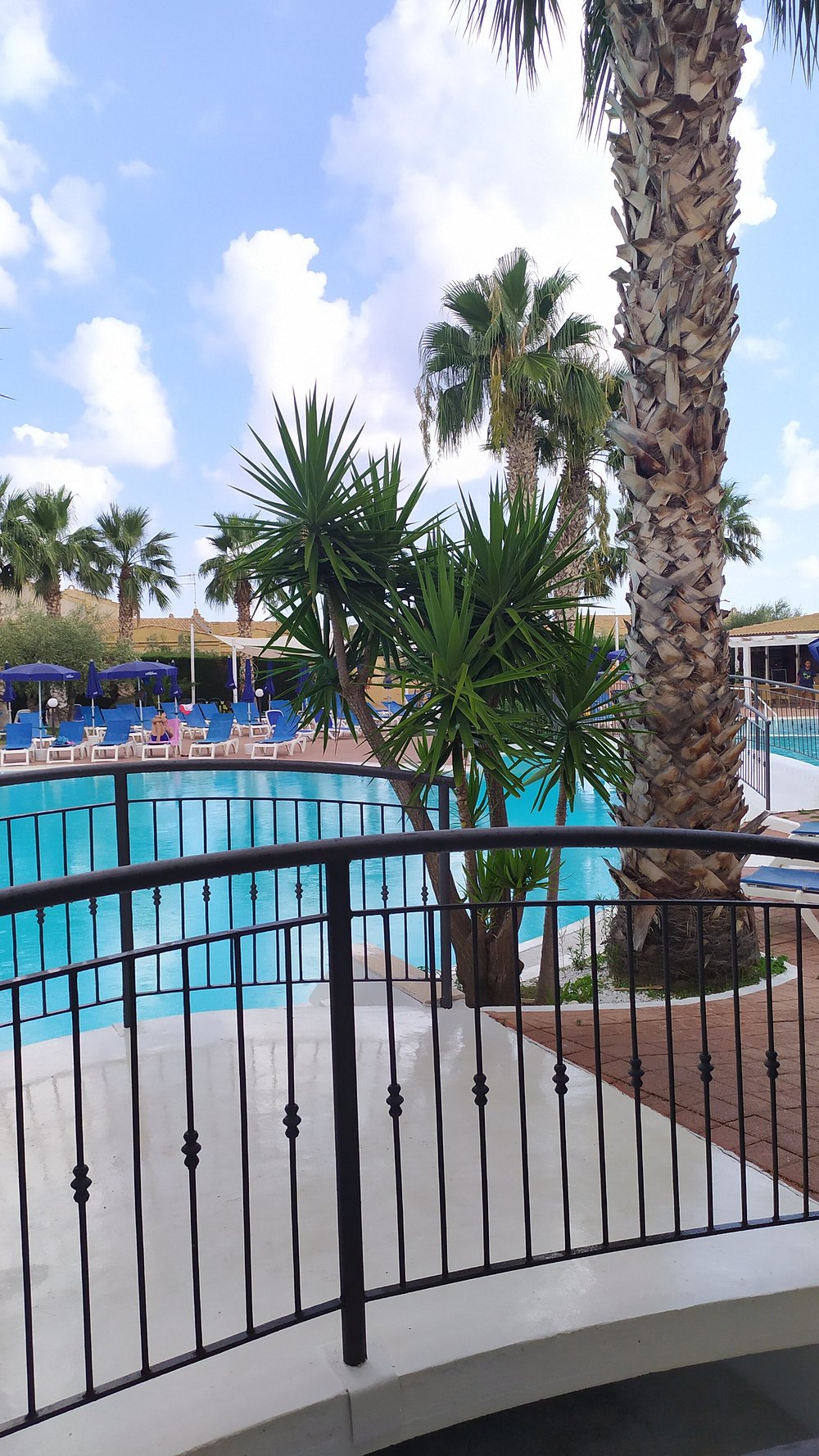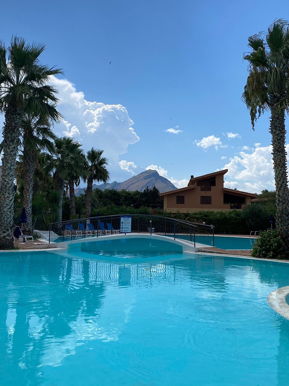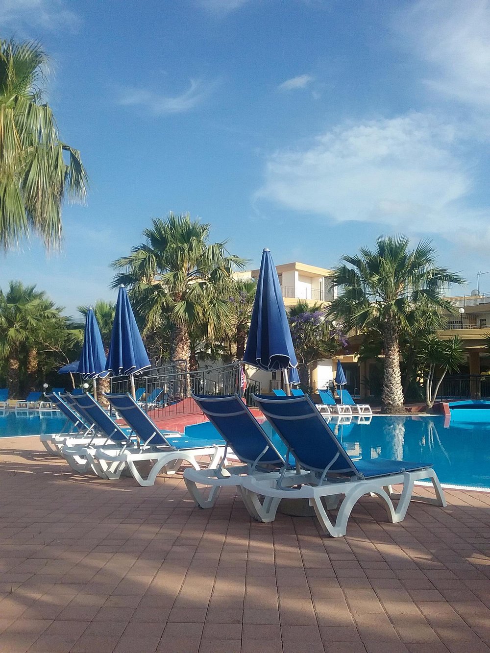Basen hotelowy z niebieskimi leżakami i parasolami w otoczeniu palm. Częściowo pochmurne niebo dodaje dramatyzmu, ale może nie być idealne dla marketingu.