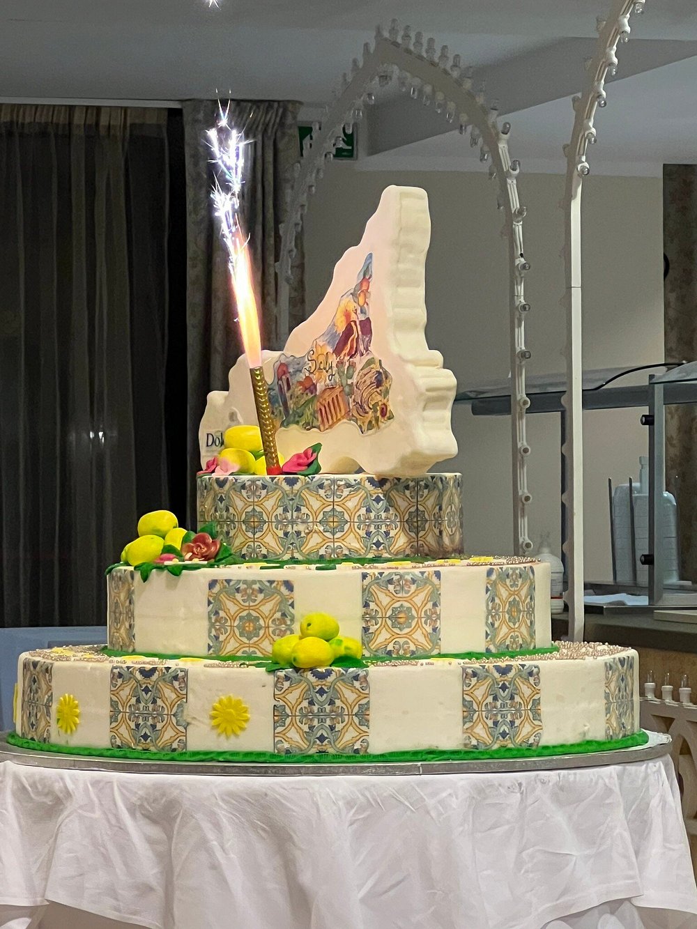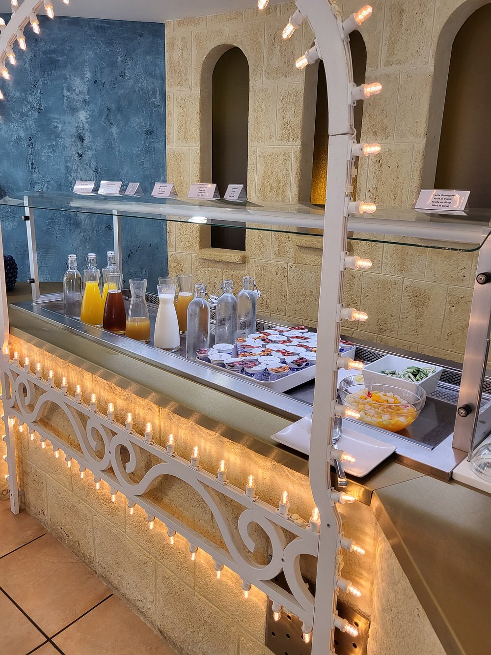 Bufet z napojami i przekąskami, ozdobiony światełkami, na tle kamiennej ściany. Estetyczne rozmieszczenie butelek i pojemników z sokami oraz dodatkami.