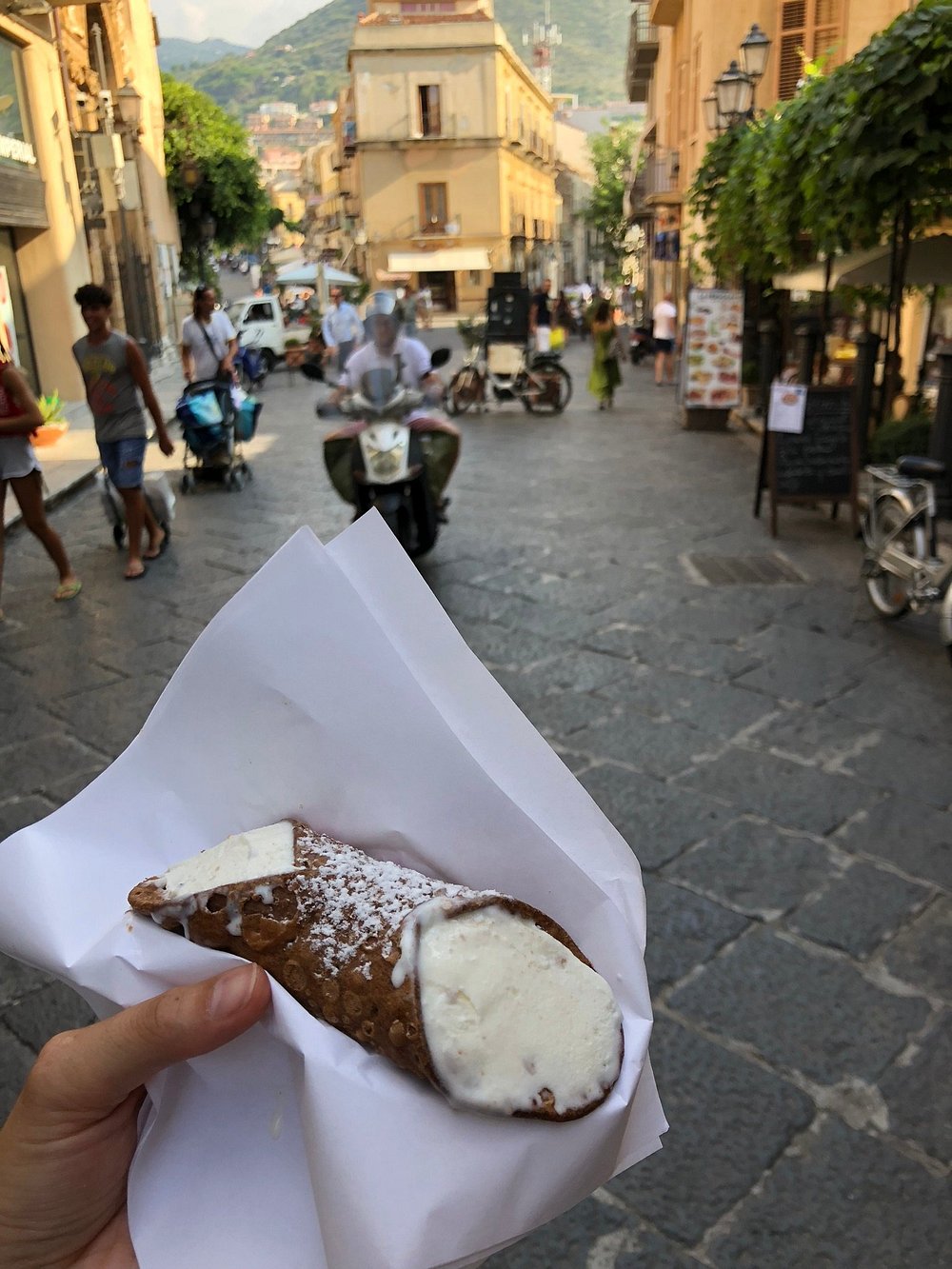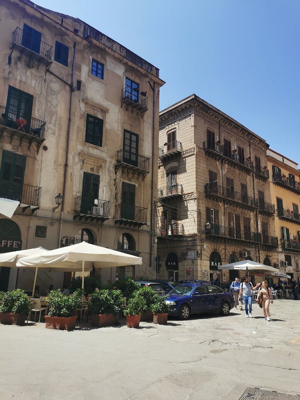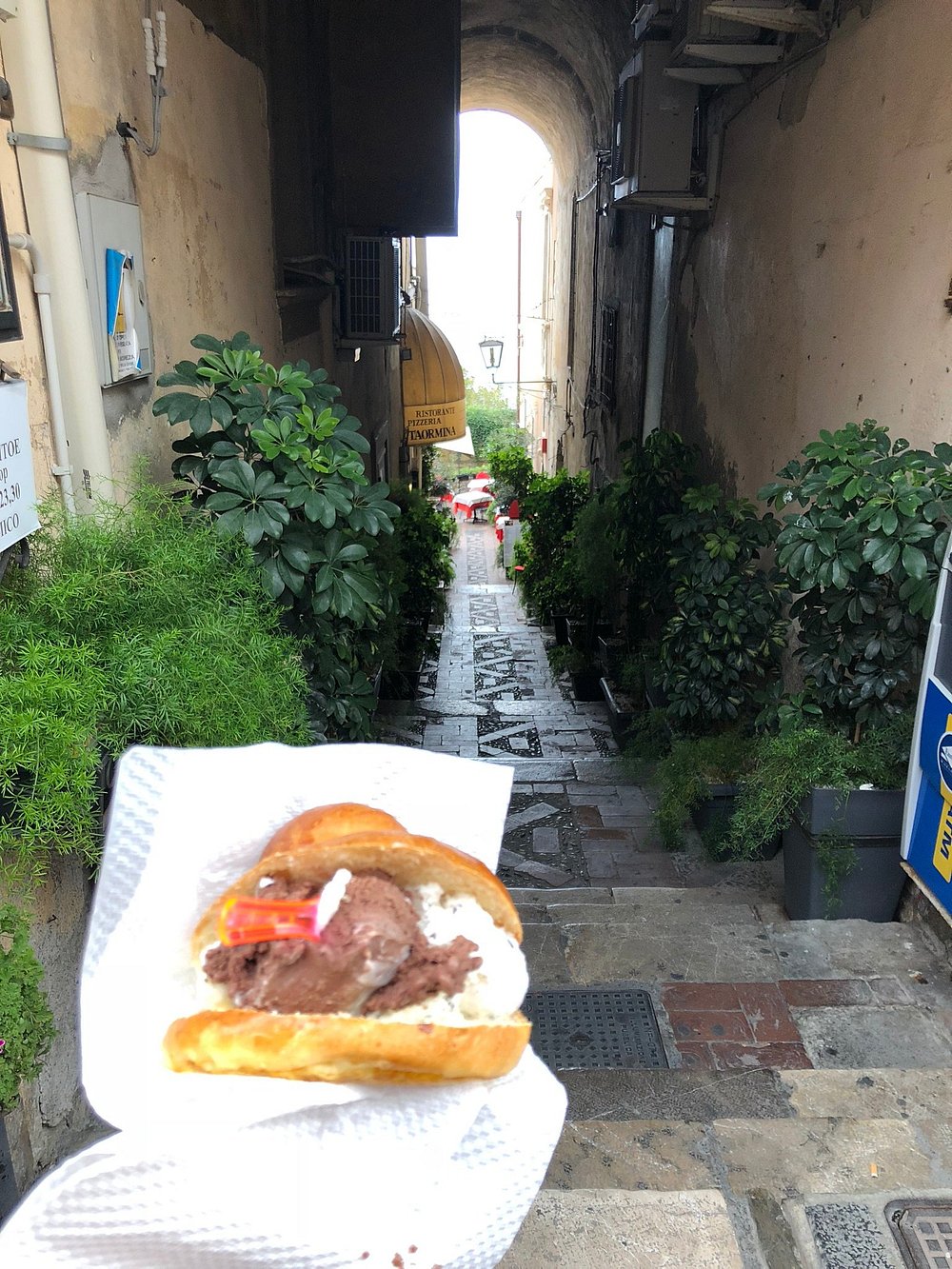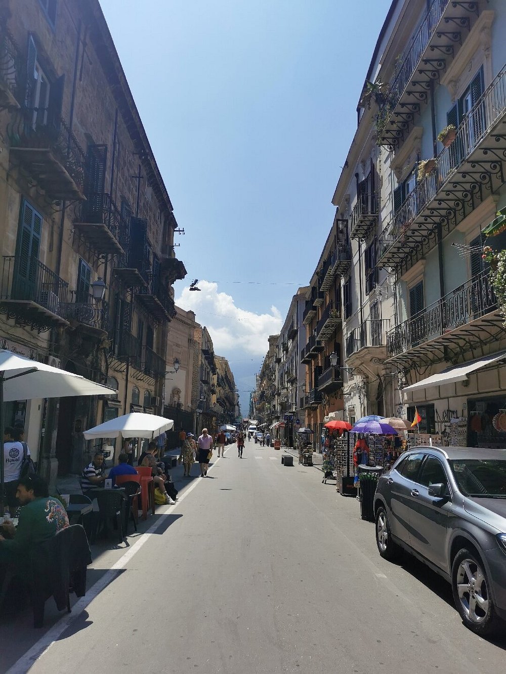 Ulica w zabytkowej części miasta z kamienicami i restauracjami na zewnątrz. Klimatyczne miejsce z lokalnym charakterem, idealne do spacerów i odkrywania kultury.