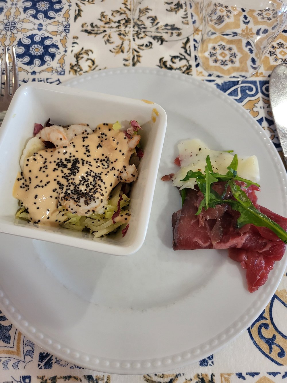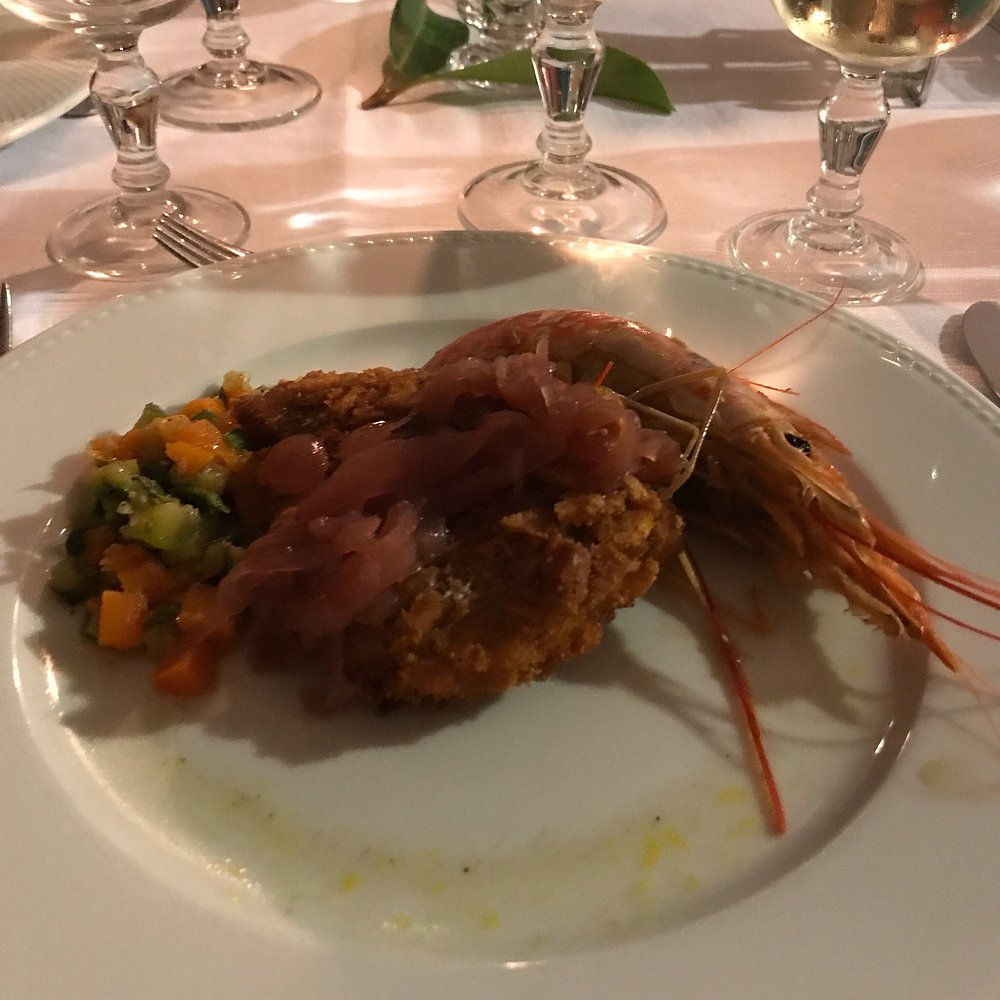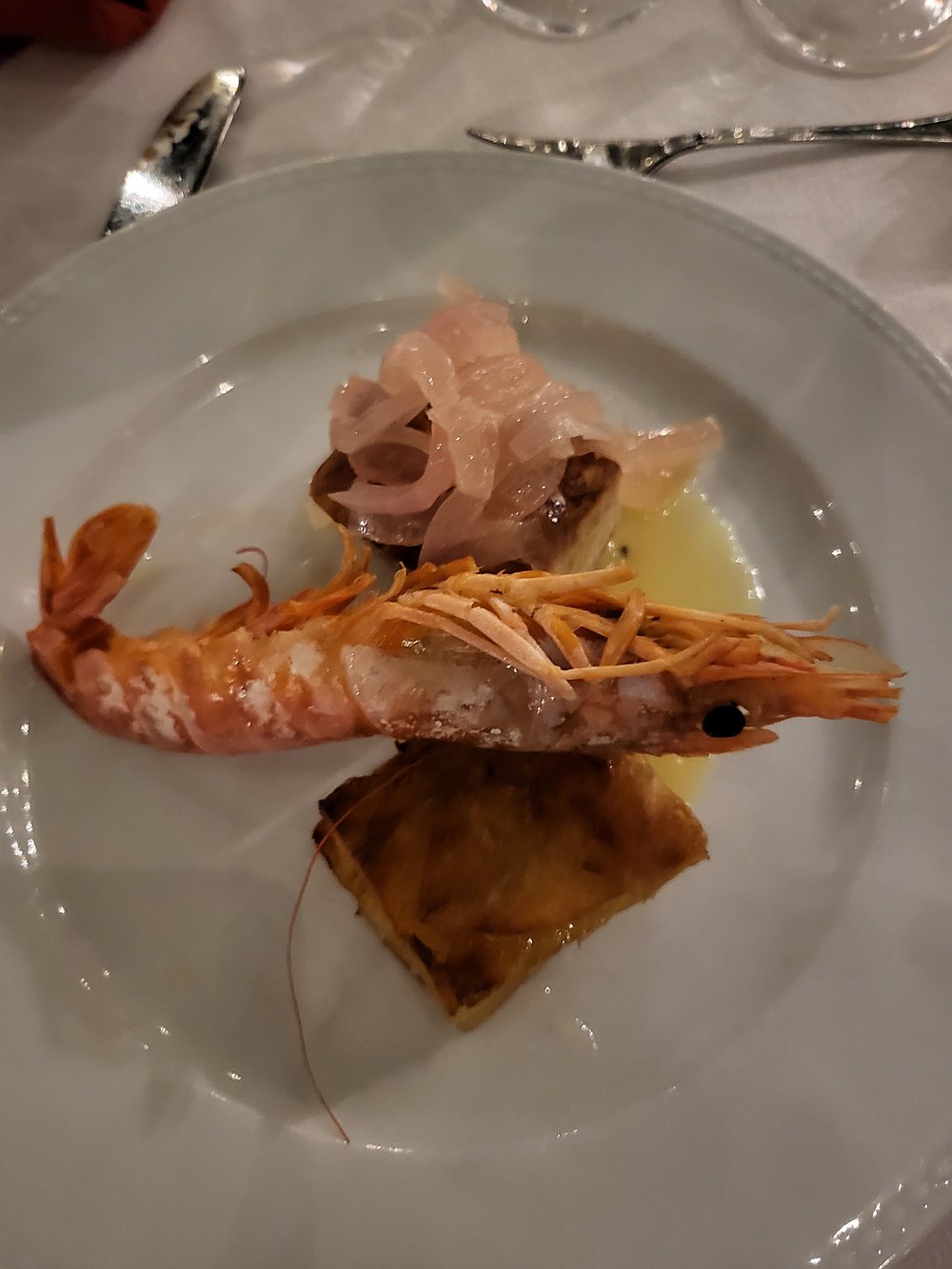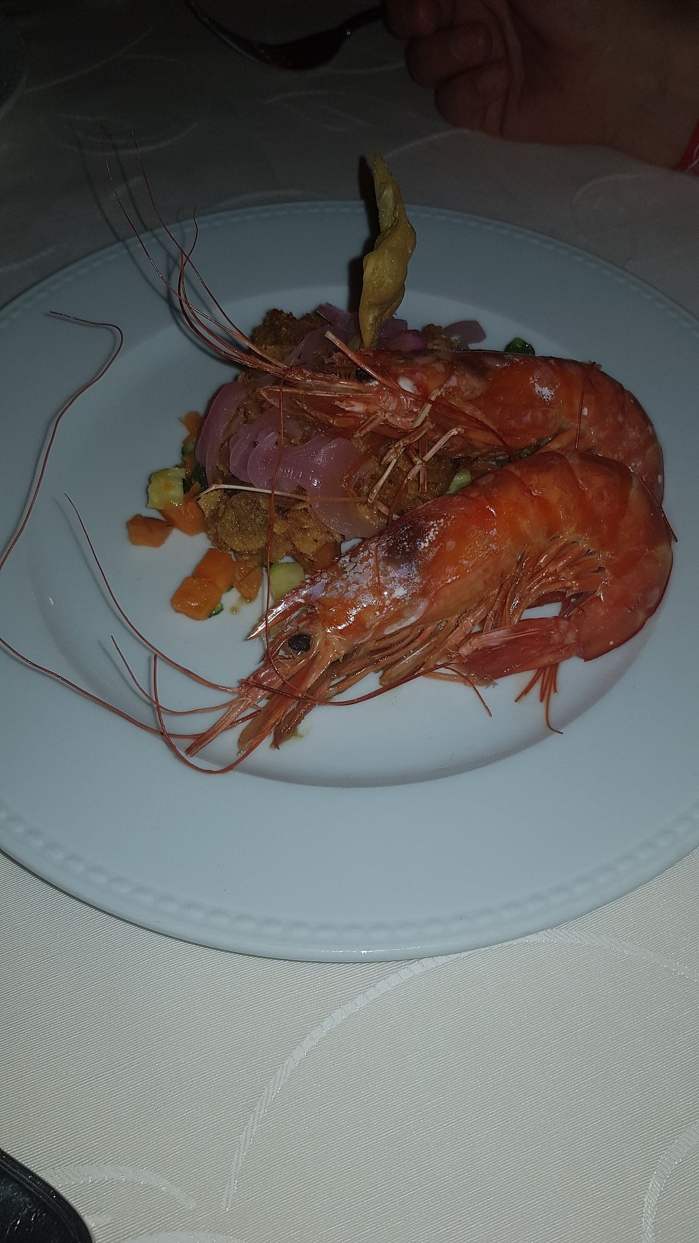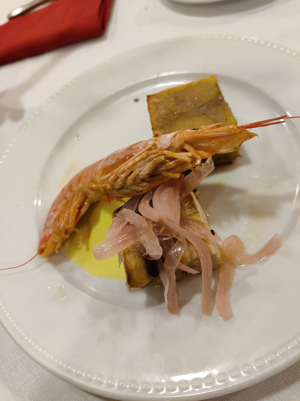 Danie z krewetką na eleganckim talerzu, jednak prezentacja jest nieco chaotyczna i nieestetyczna. Brak stylizacji i wyraźnego kontekstu sprawia, że nie przyciąga uwagi.