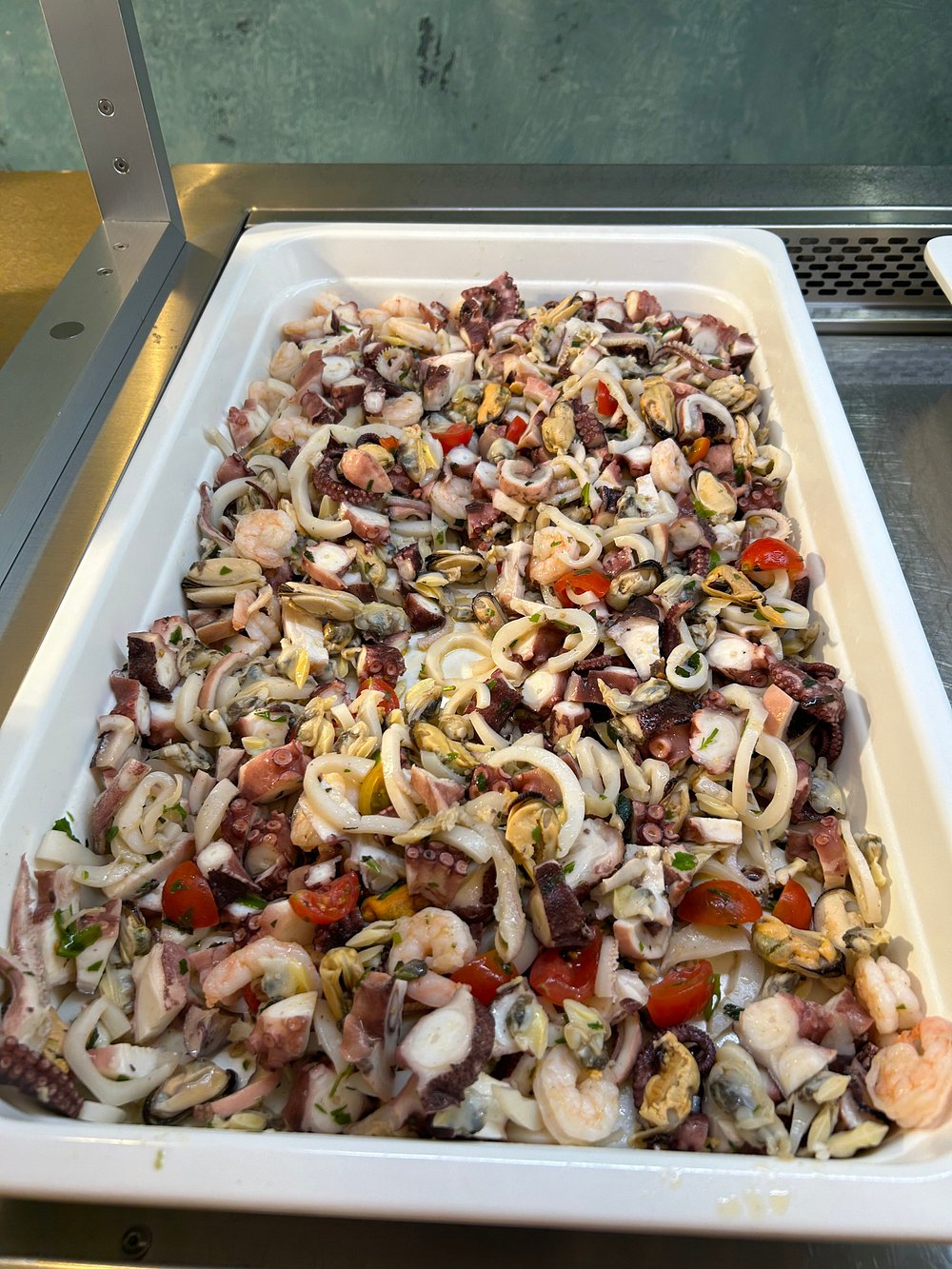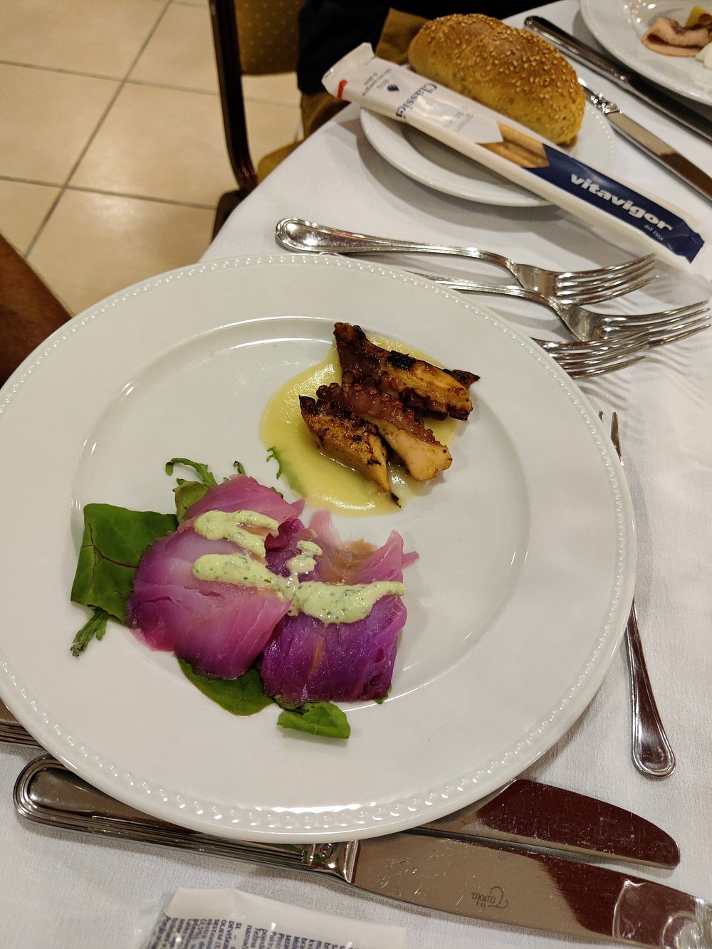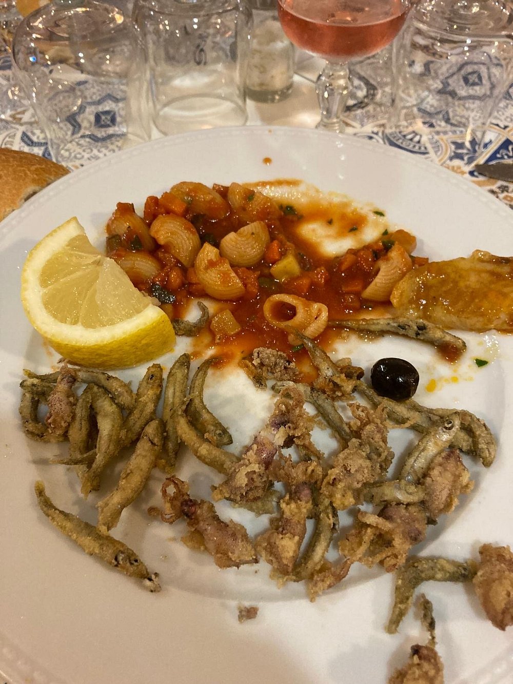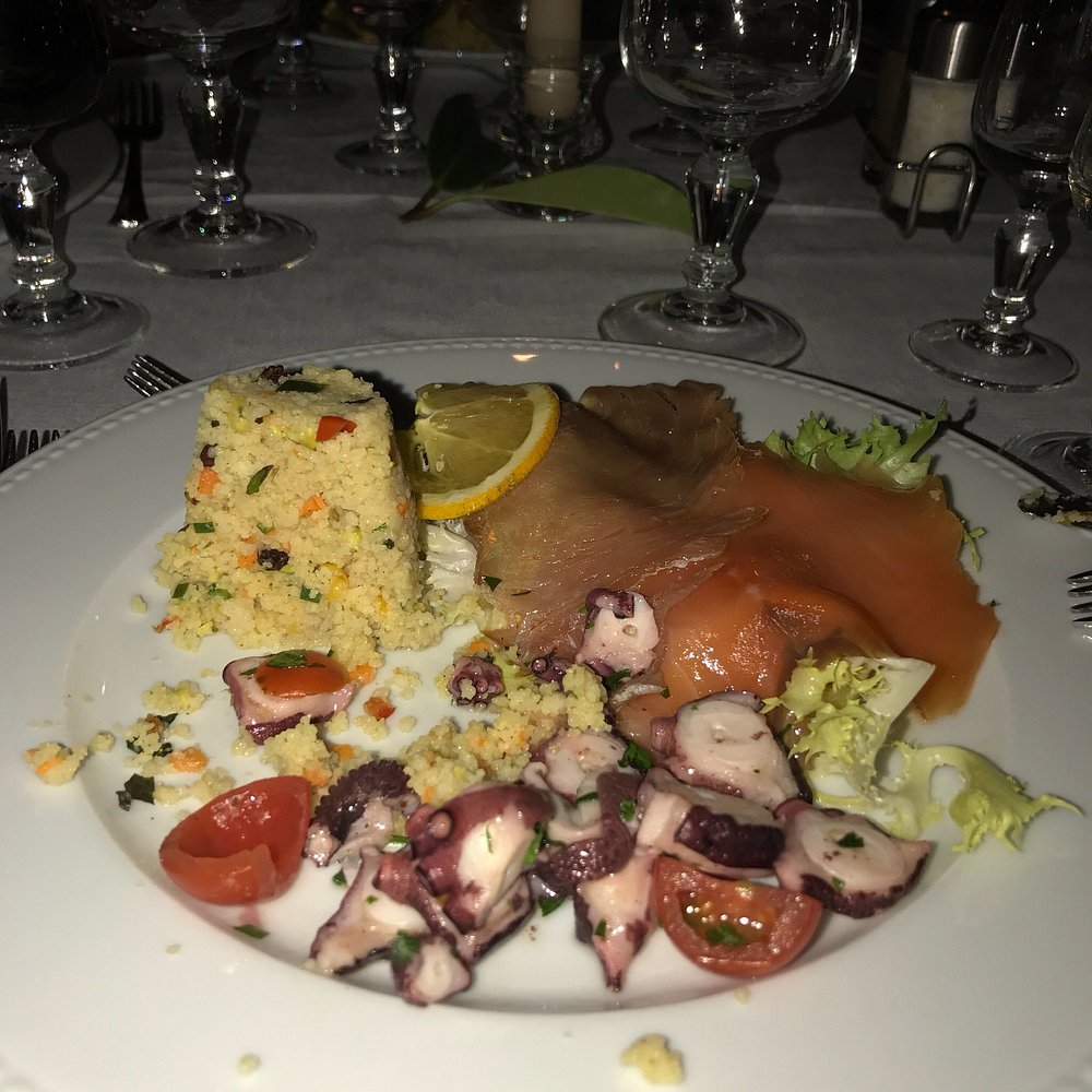 Danie z krewetką na eleganckim talerzu, jednak prezentacja jest nieco chaotyczna i nieestetyczna. Brak stylizacji i wyraźnego kontekstu sprawia, że nie przyciąga uwagi.