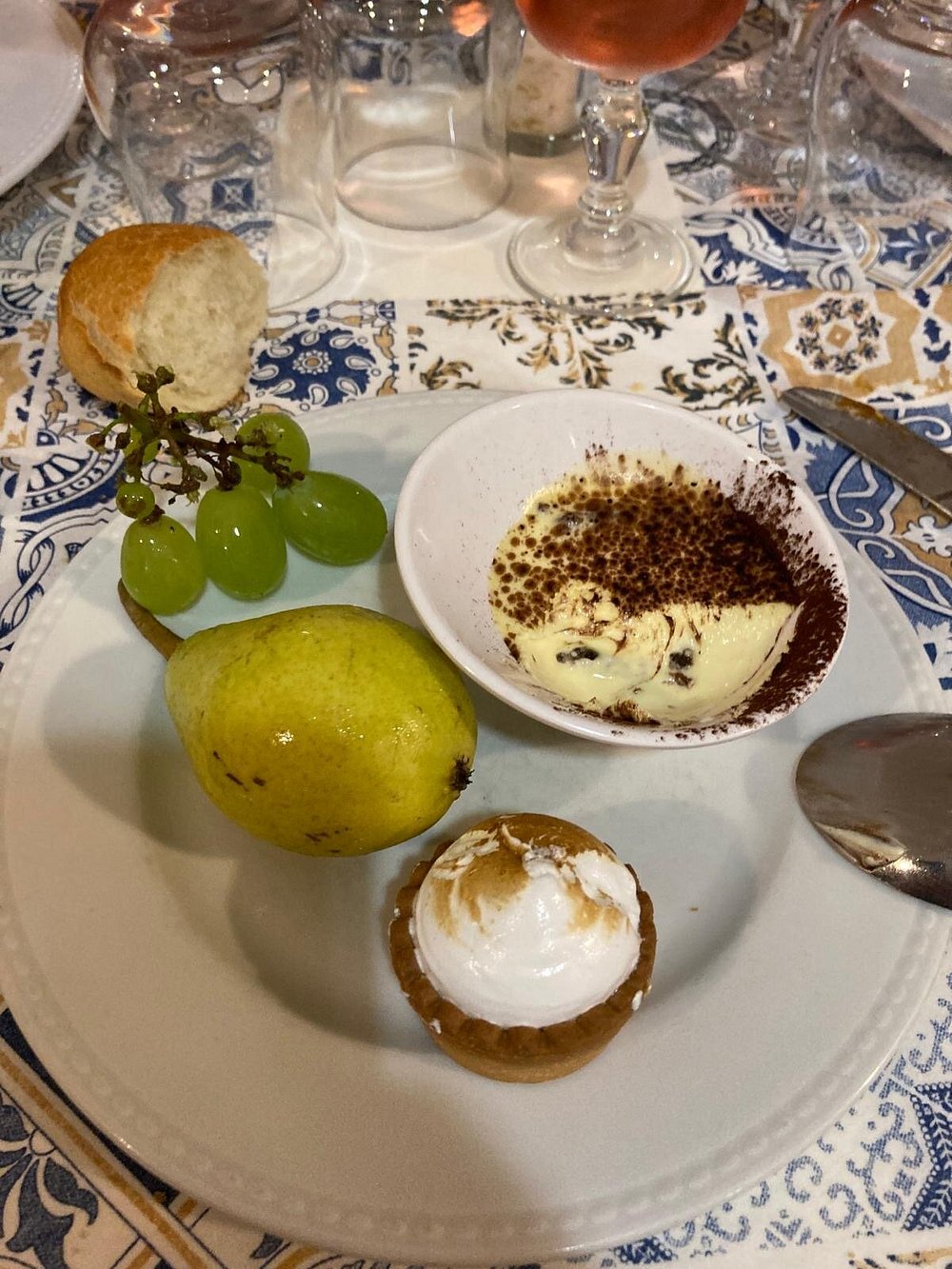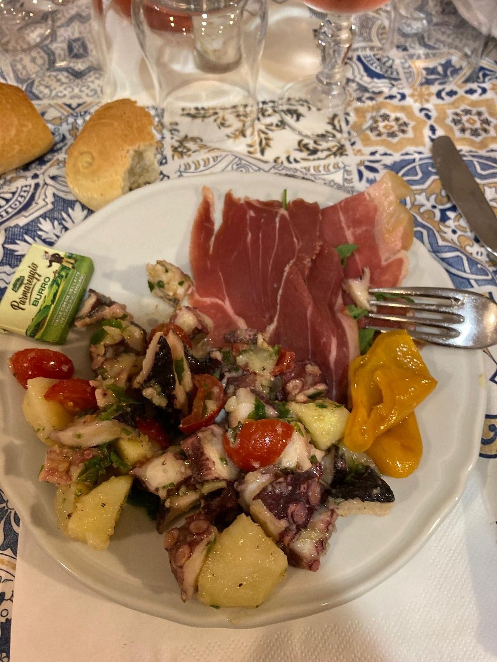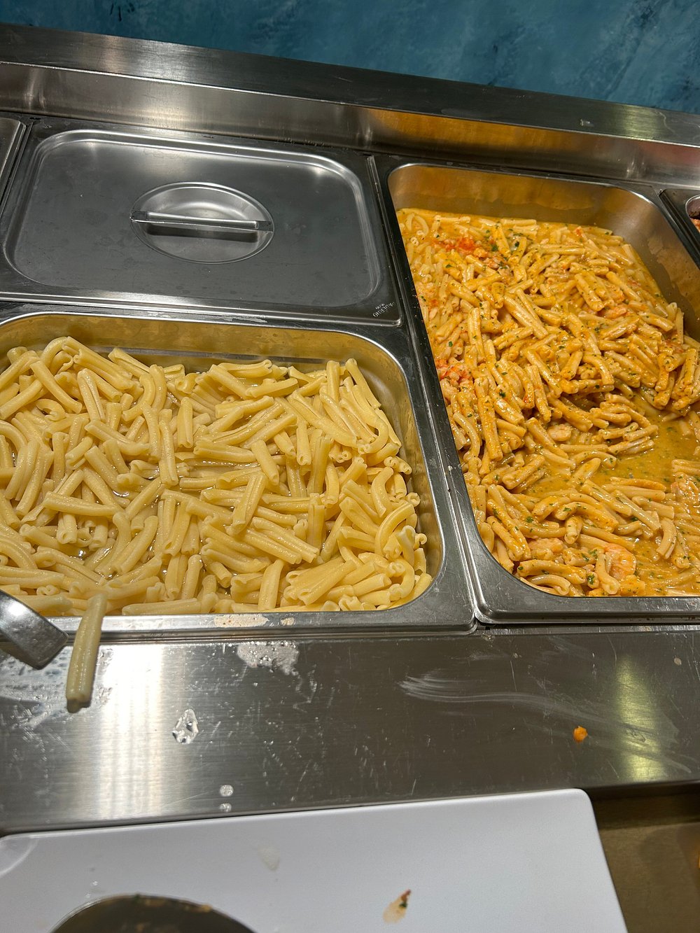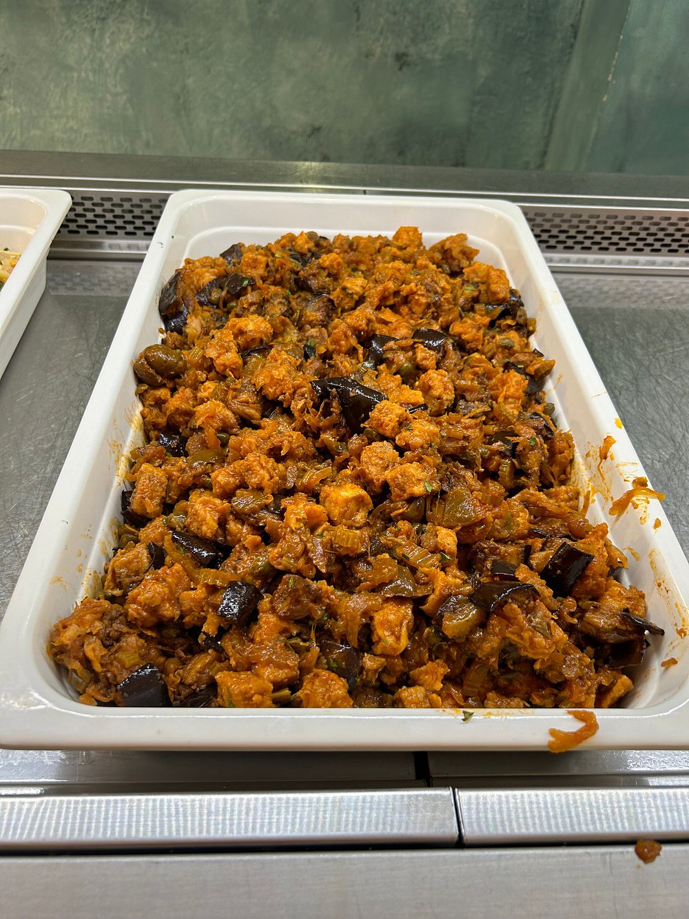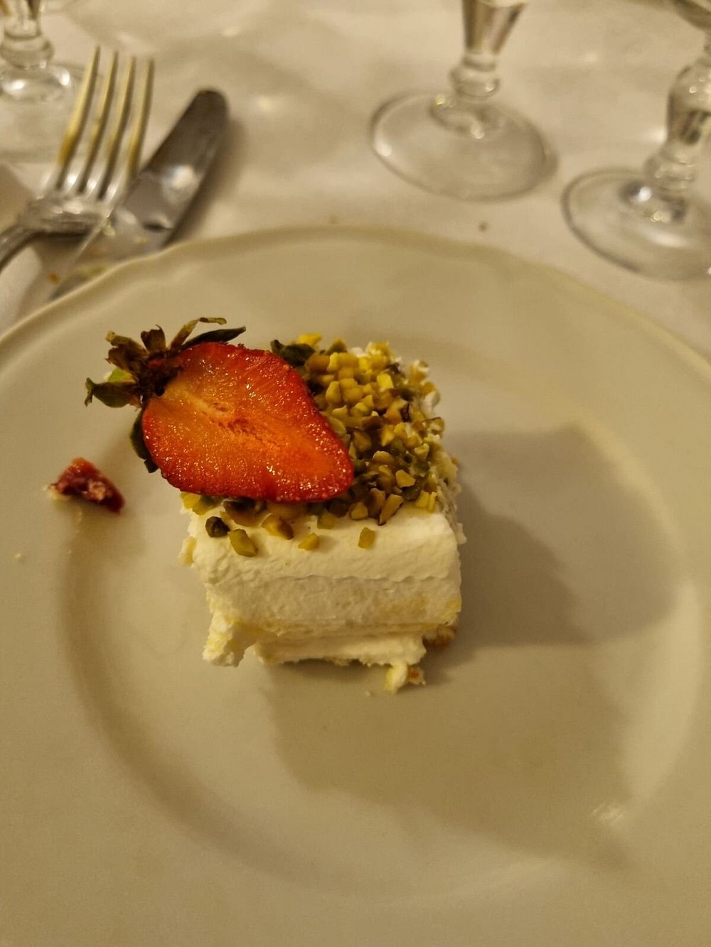 Danie z krewetką na eleganckim talerzu, jednak prezentacja jest nieco chaotyczna i nieestetyczna. Brak stylizacji i wyraźnego kontekstu sprawia, że nie przyciąga uwagi.