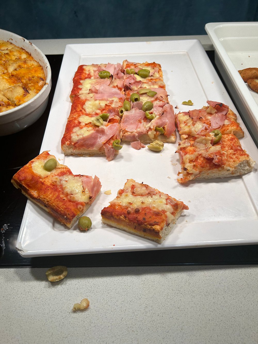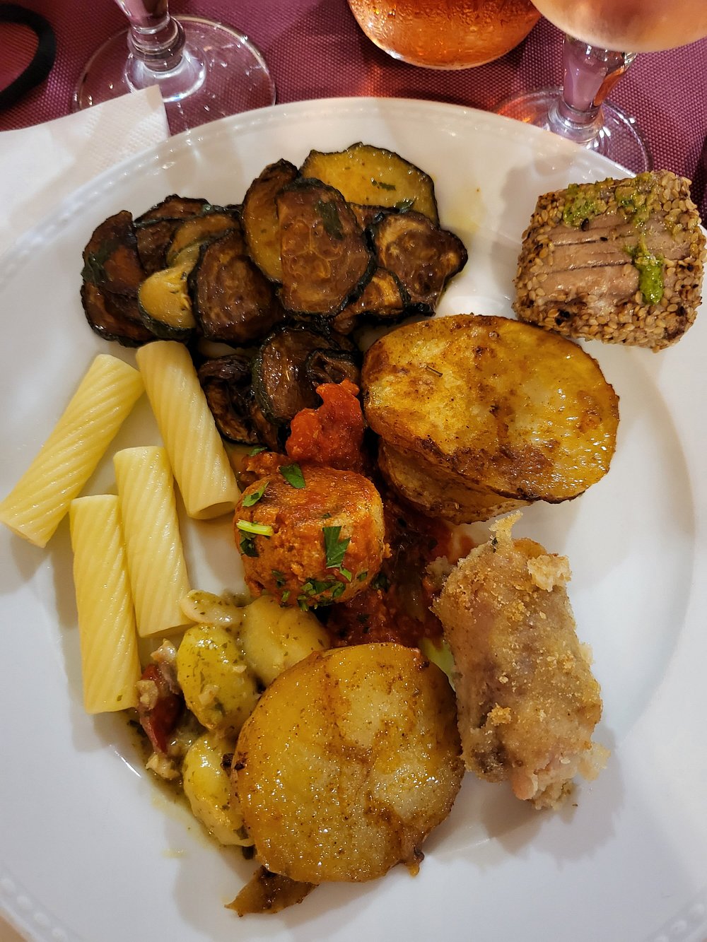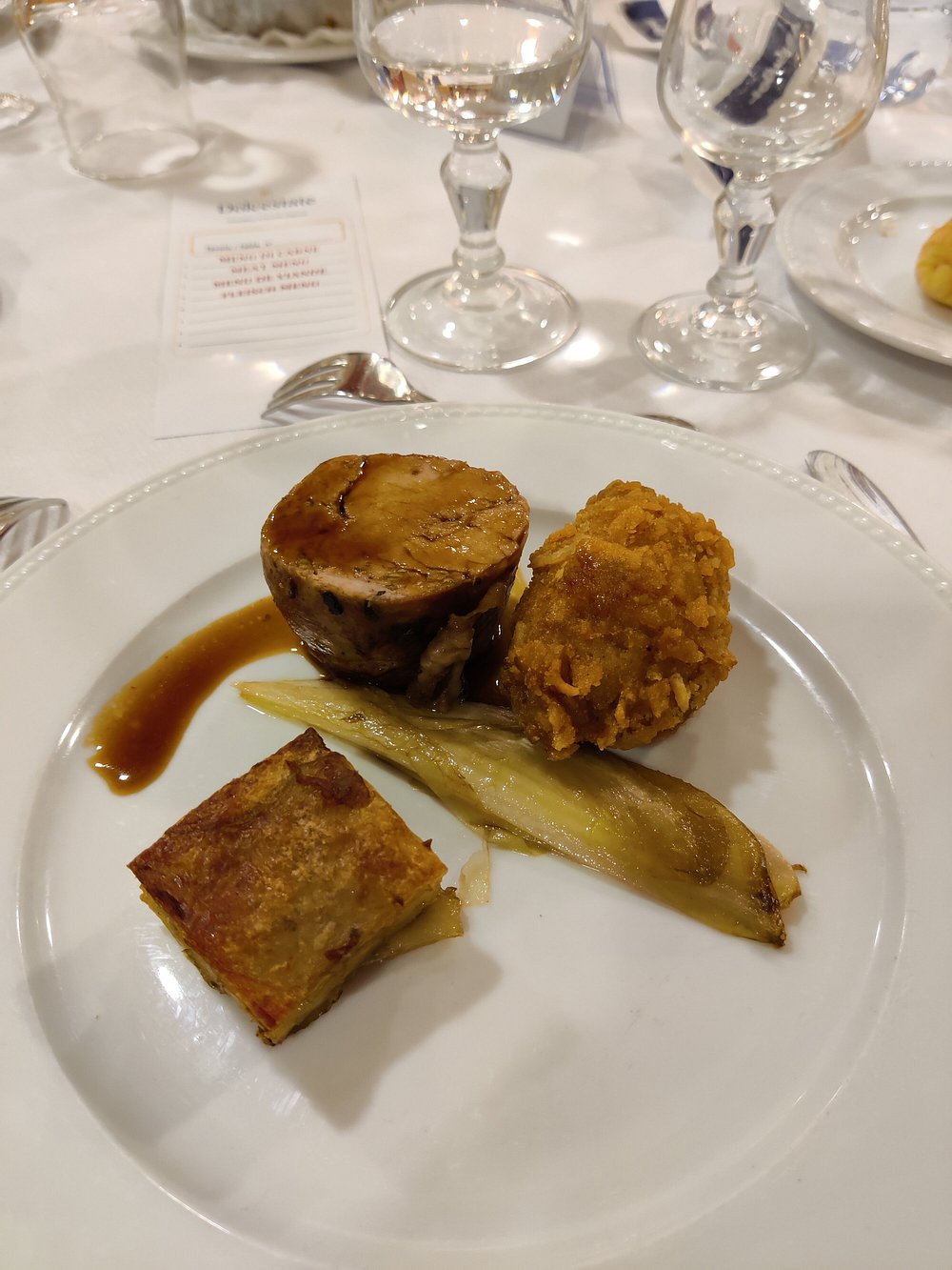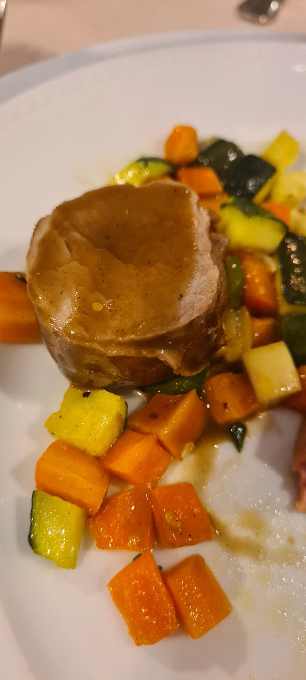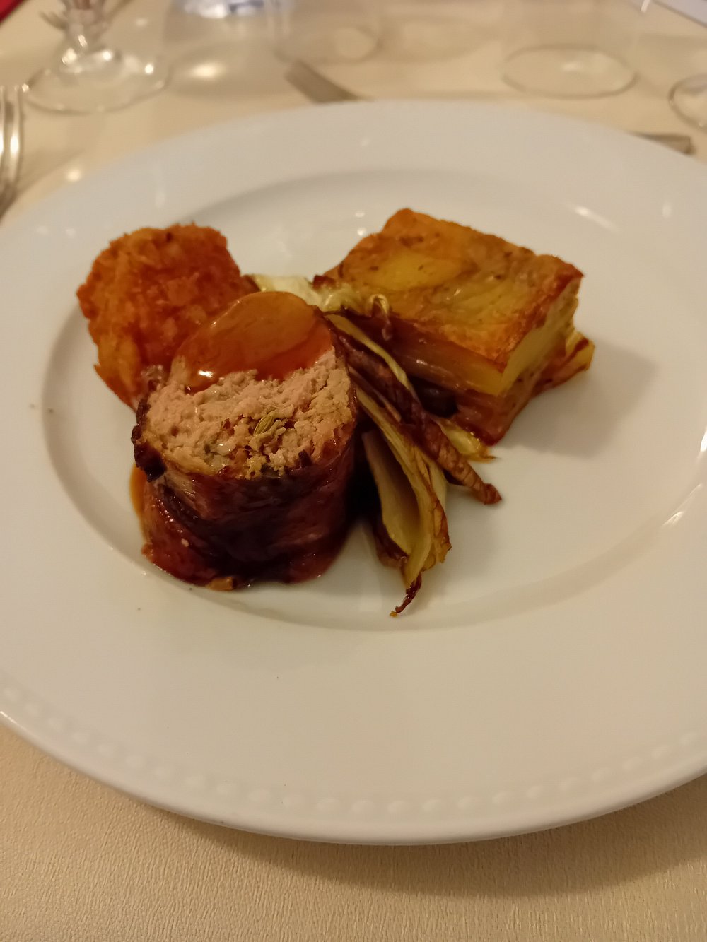 Elegancko podane danie na białym talerzu, składające się z pieczeni, zapiekanki ziemniaczanej i warzyw. Kompozycja jest estetyczna, ale brakuje elementu 'wow', który przyciągnąłby uwagę.
