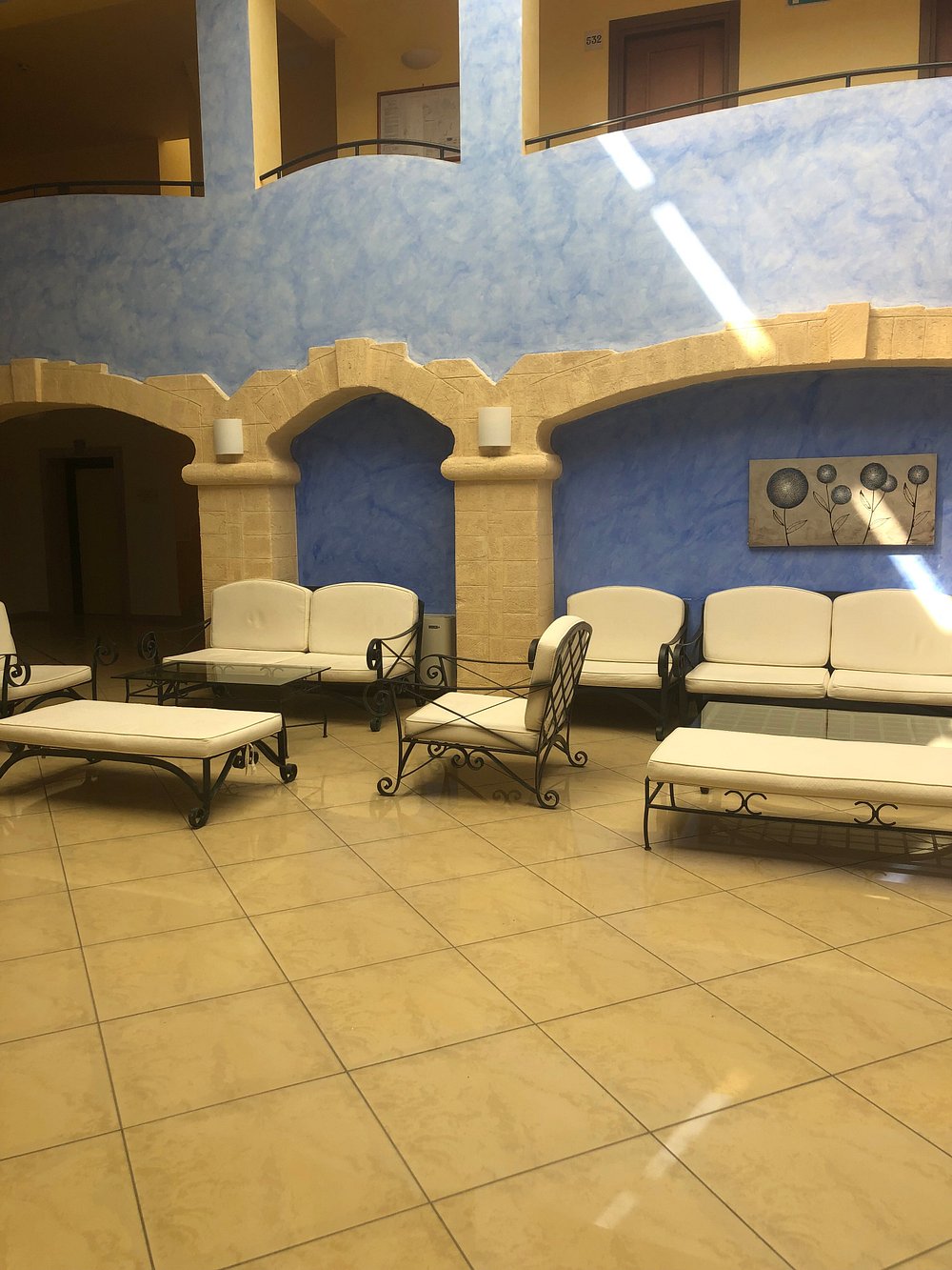 Przestrzeń wypoczynkowa z eleganckimi fotelami i niebieskimi ścianami, ozdobiona stylowym obrazem. Naturalne światło wpada przez przeszklony dach, tworząc przyjemną atmosferę.