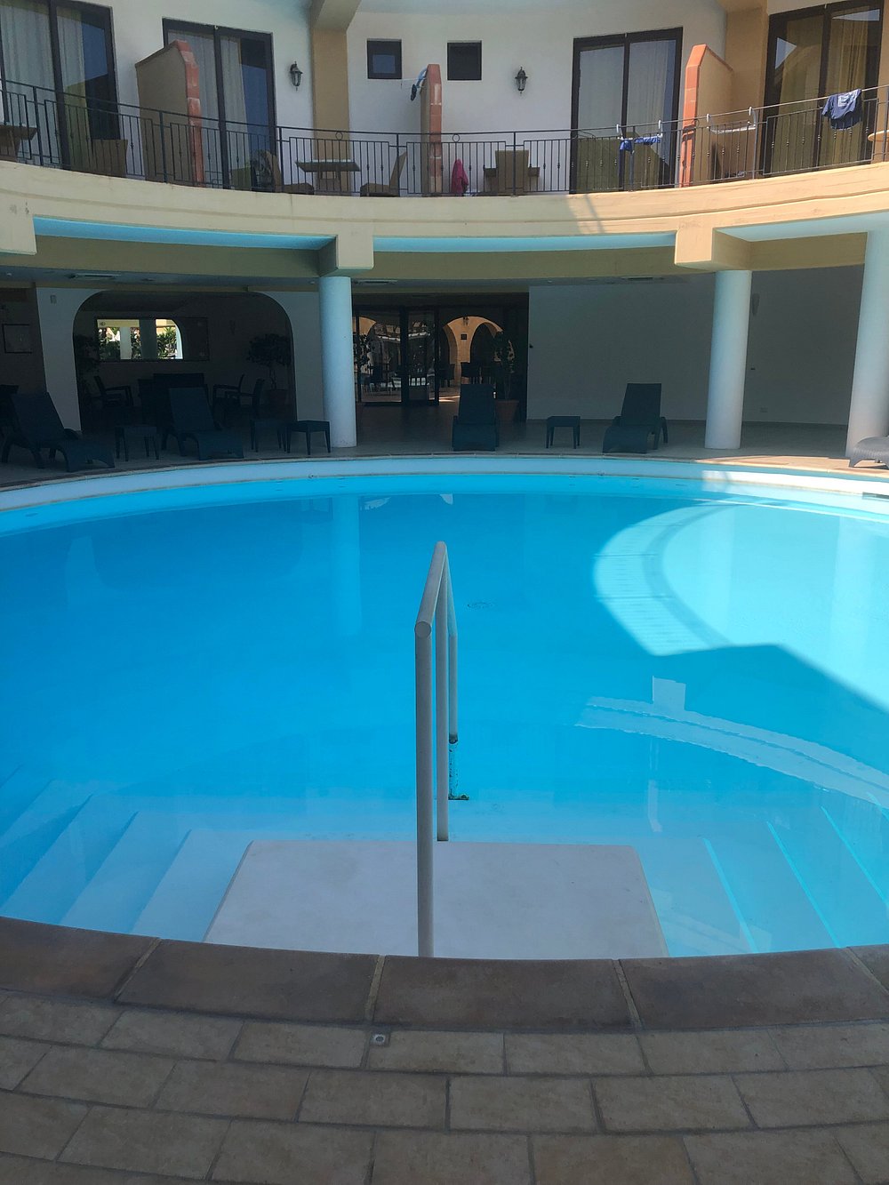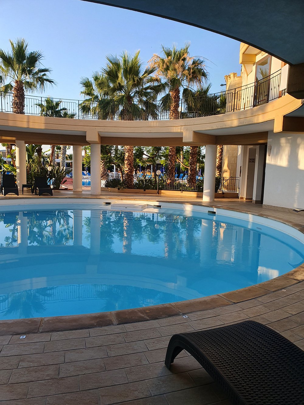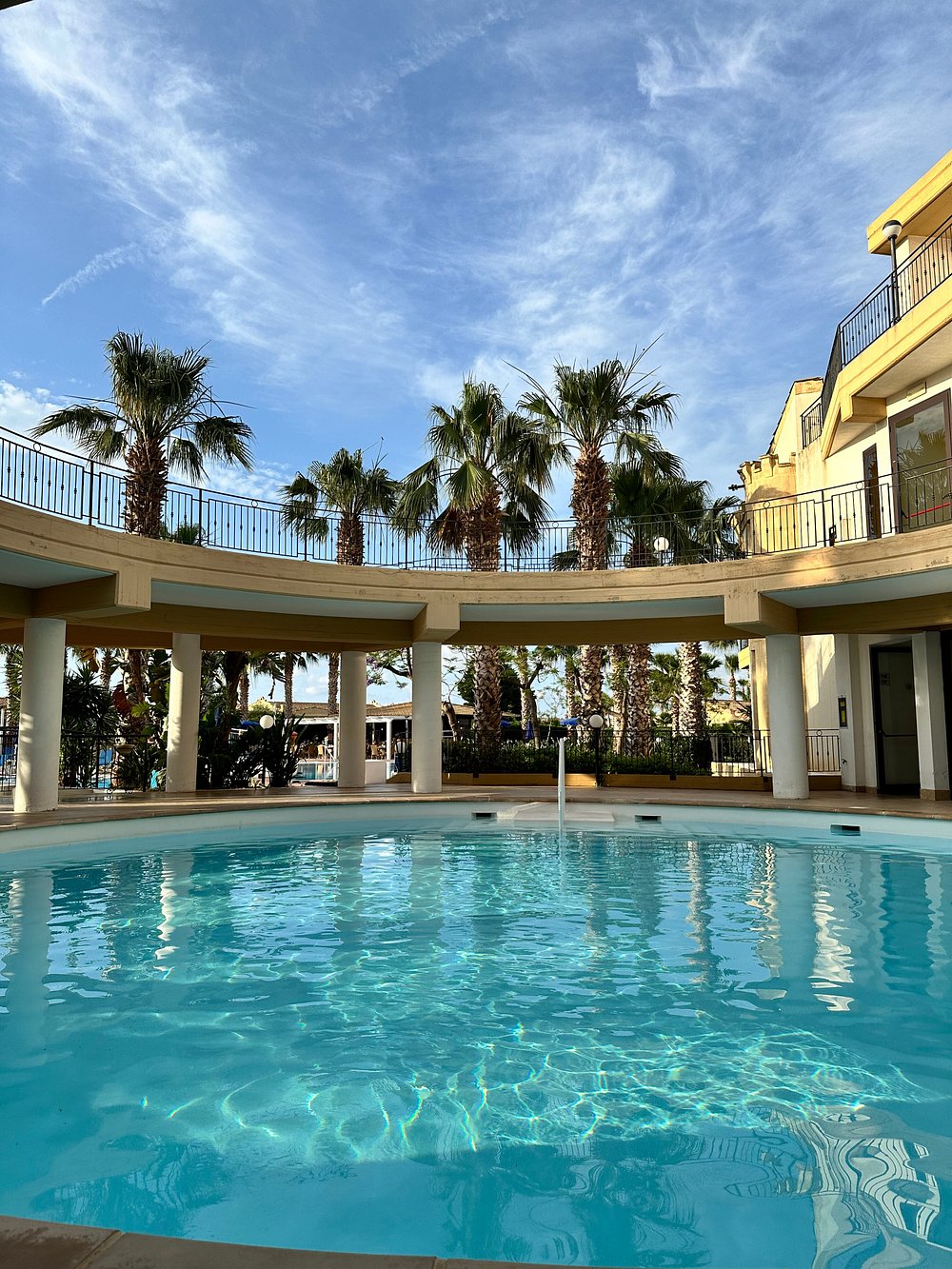 Okrągły basen otoczony kolumnami i palmami, tworzący przyjemną, relaksującą atmosferę. Refleksy na wodzie dodają uroku, ale brak ludzi sprawia, że przestrzeń wydaje się pusta.