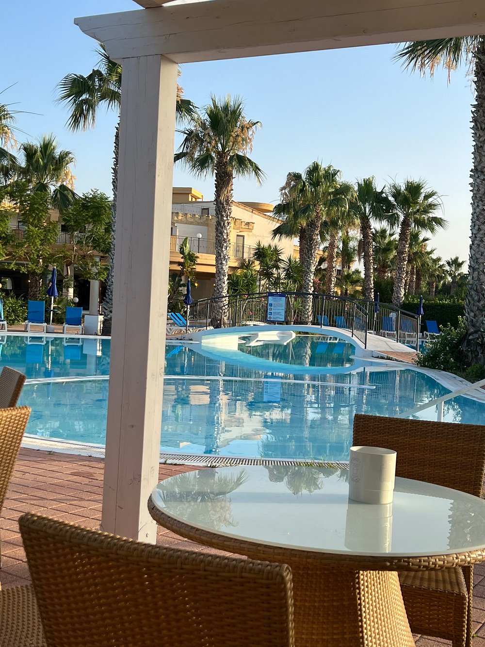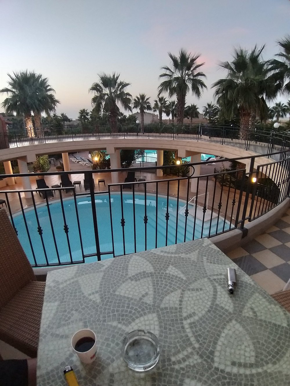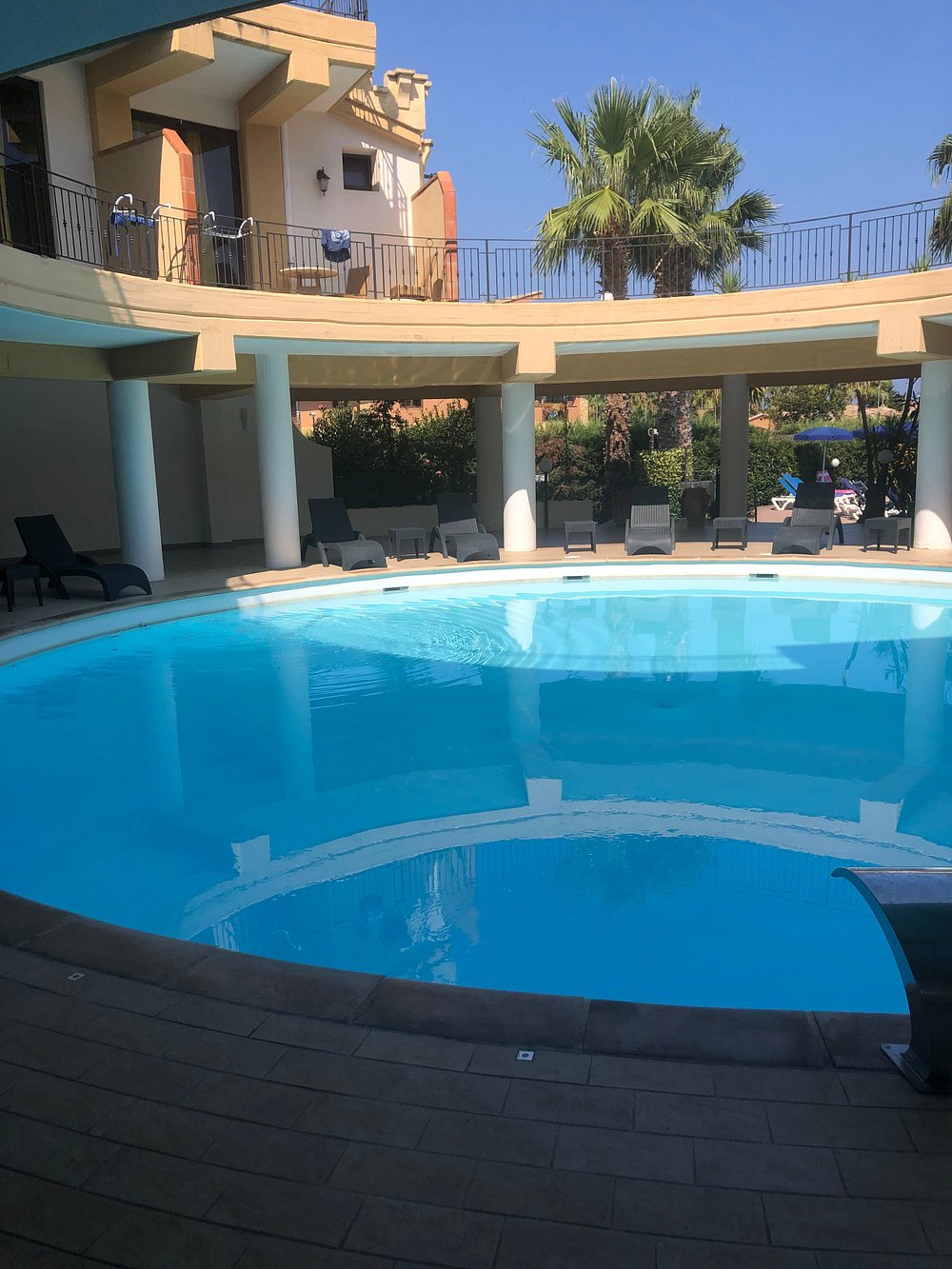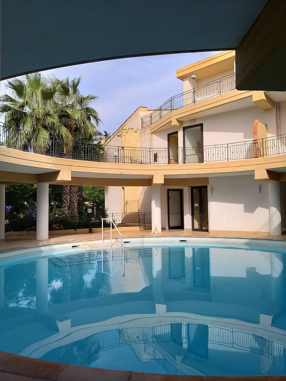 Okrągły basen otoczony kolumnami i palmami, tworzący przyjemną, relaksującą atmosferę. Refleksy na wodzie dodają uroku, ale brak ludzi sprawia, że przestrzeń wydaje się pusta.