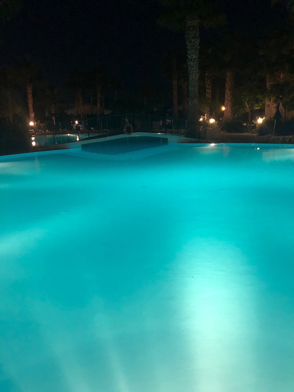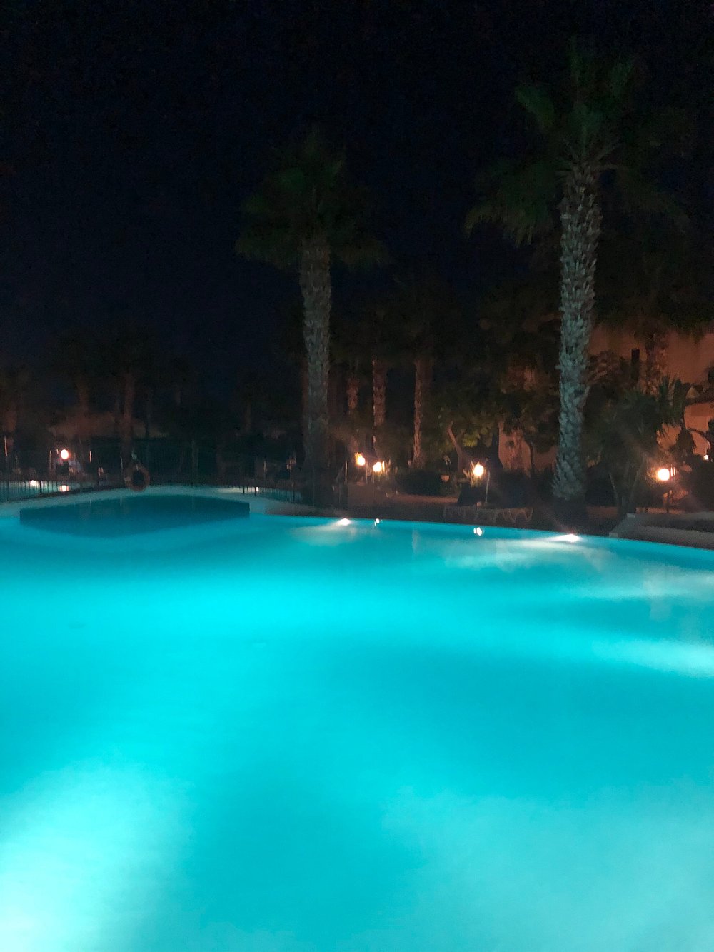 Basen hotelowy otoczony palmami, oświetlony nocą, tworzy atmosferę luksusu i relaksu. Jasne, turkusowe światło wody kontrastuje z ciemnym niebem, dodając uroku całej scenerii.