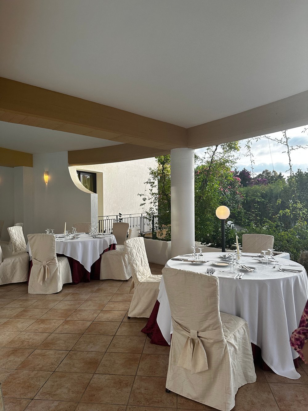Elegancka aranżacja stołu przy basenie w otoczeniu stylowej architektury hotelu. Wieczorna atmosfera z delikatnym oświetleniem tworzy przytulny klimat.
