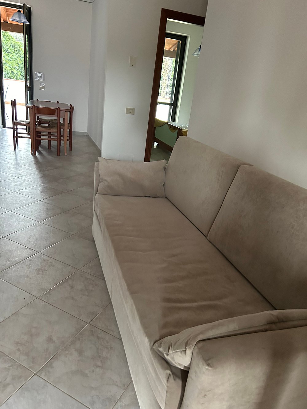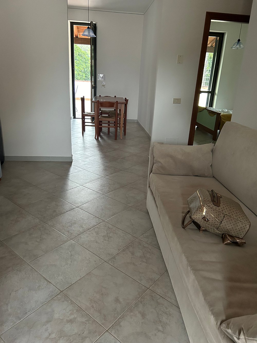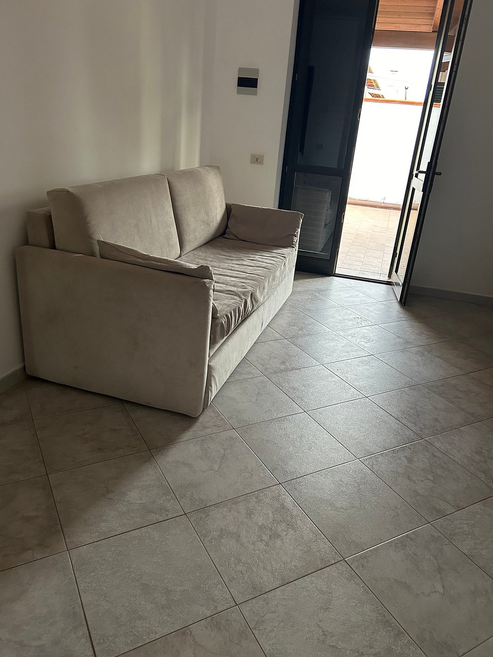 Przestronny taras z eleganckimi meblami ogrodowymi i dekoracyjnymi roślinami, otoczony architekturą z łukowymi przejściami. Cienie tworzą interesujący wzór na podłodze.