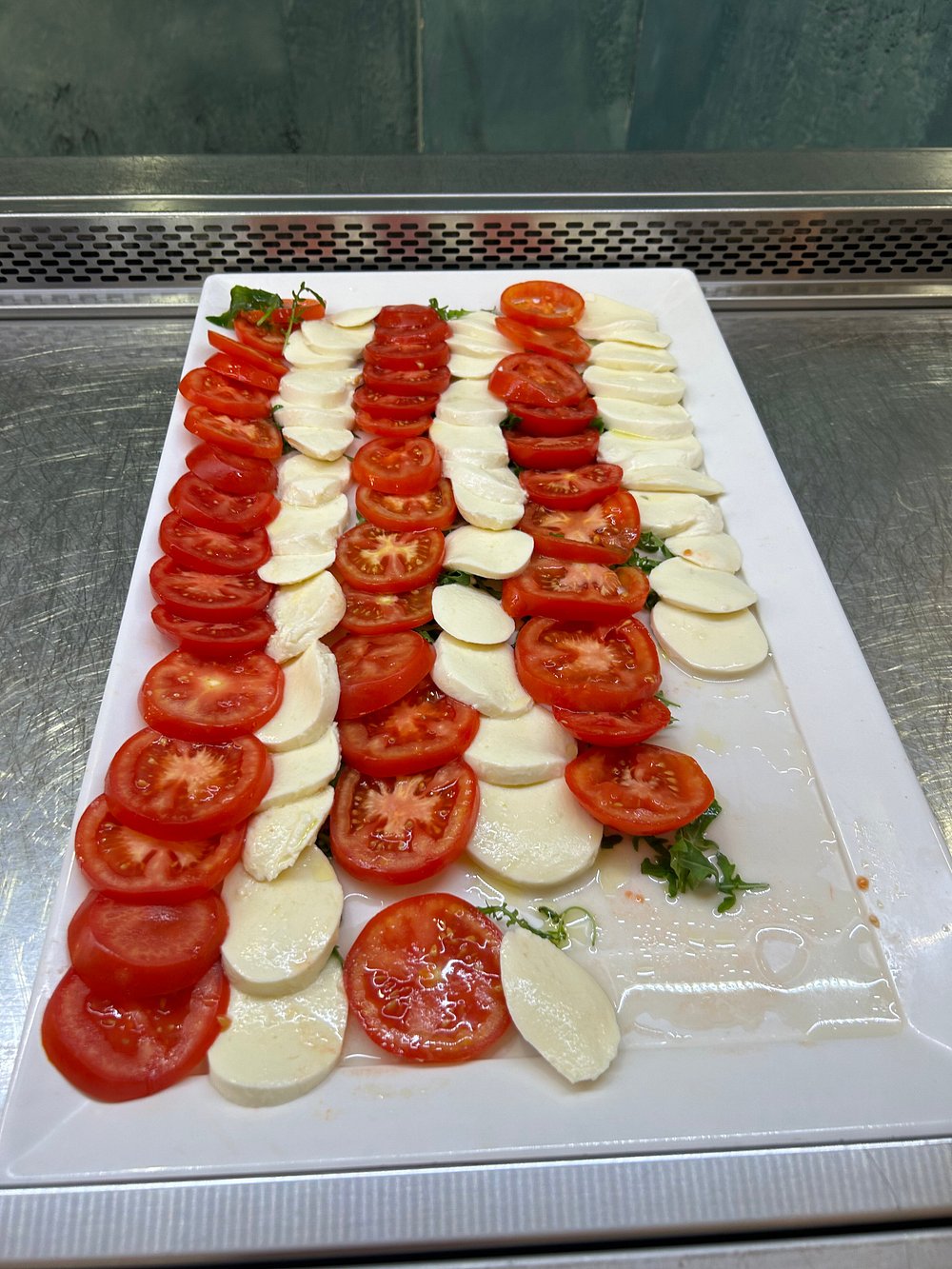 Estetycznie ułożone plasterki pomidorów i mozzarelli na dużym talerzu, tworzące klasyczną sałatkę caprese. Kompozycja jest schludna, ale nie wyróżnia się szczególnie.