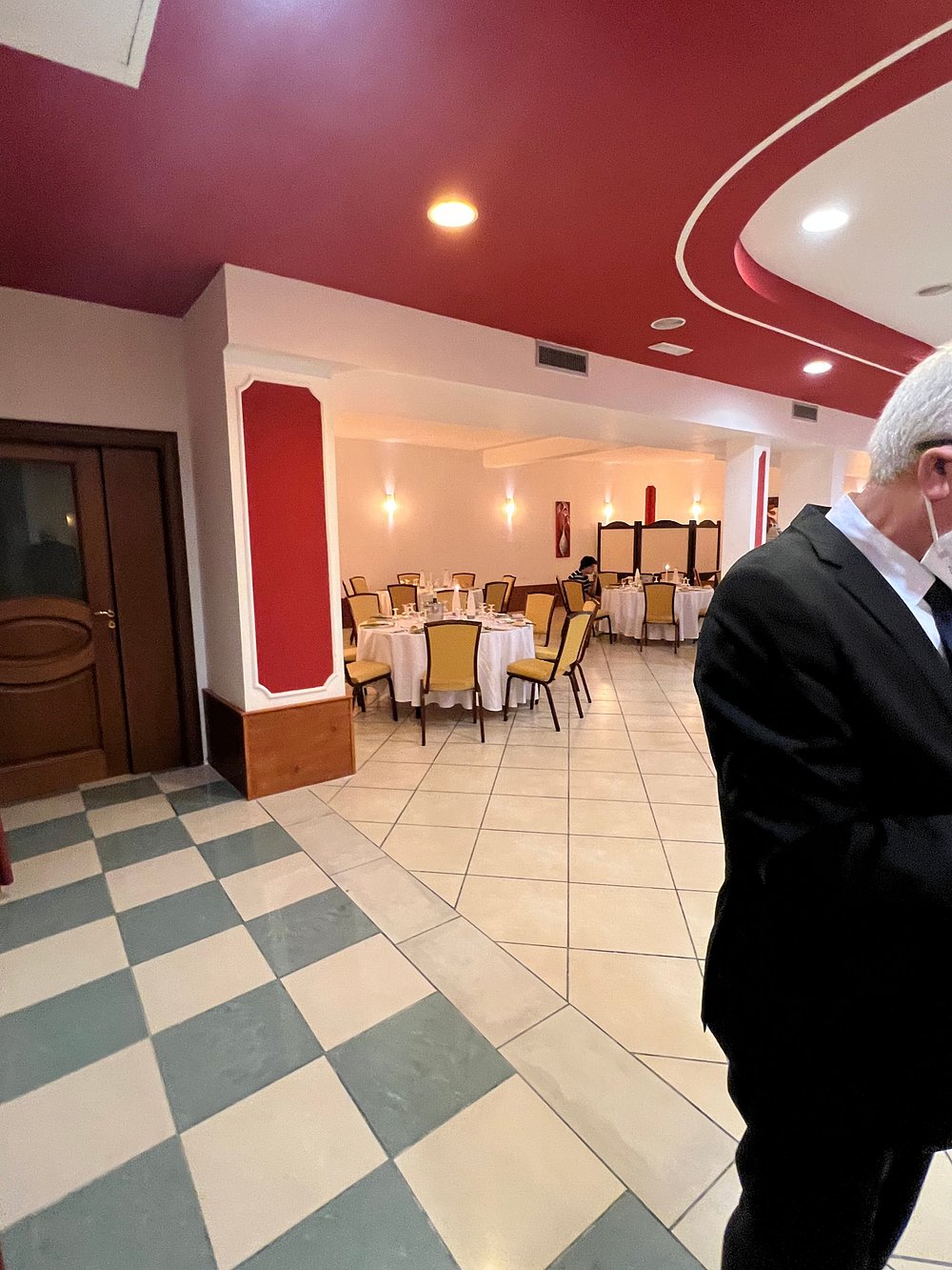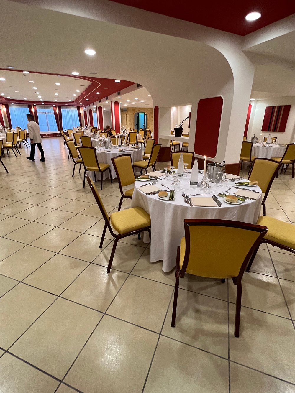 Elegancka sala restauracyjna z okrągłymi stołami, nakrytymi białymi obrusami i zastawą. Ciepłe oświetlenie i czerwone akcenty na ścianach tworzą przytulną atmosferę.