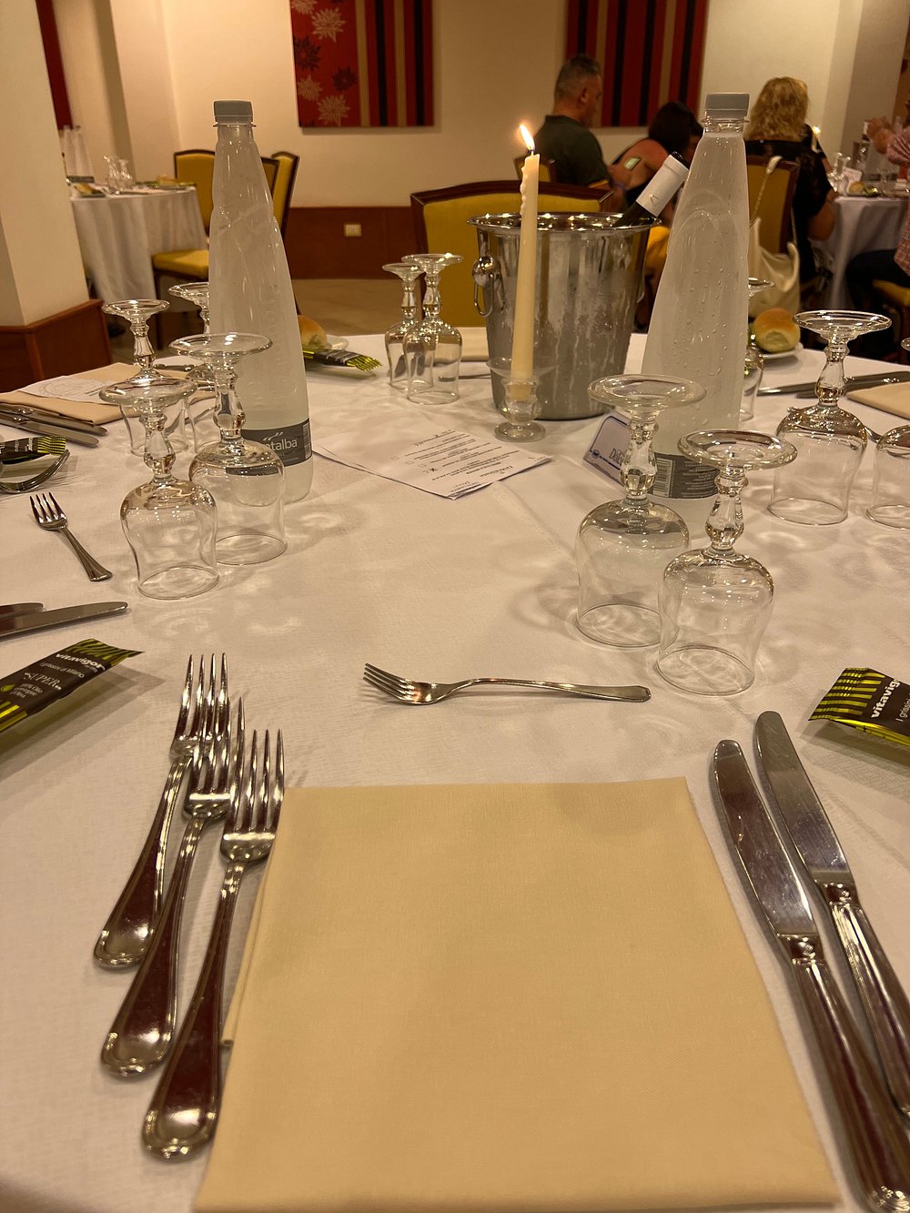 Elegancko nakryty stół w restauracji hotelowej z białym obrusem i starannie ułożonymi sztućcami. W tle widoczni goście, co dodaje atmosfery życia i aktywności.